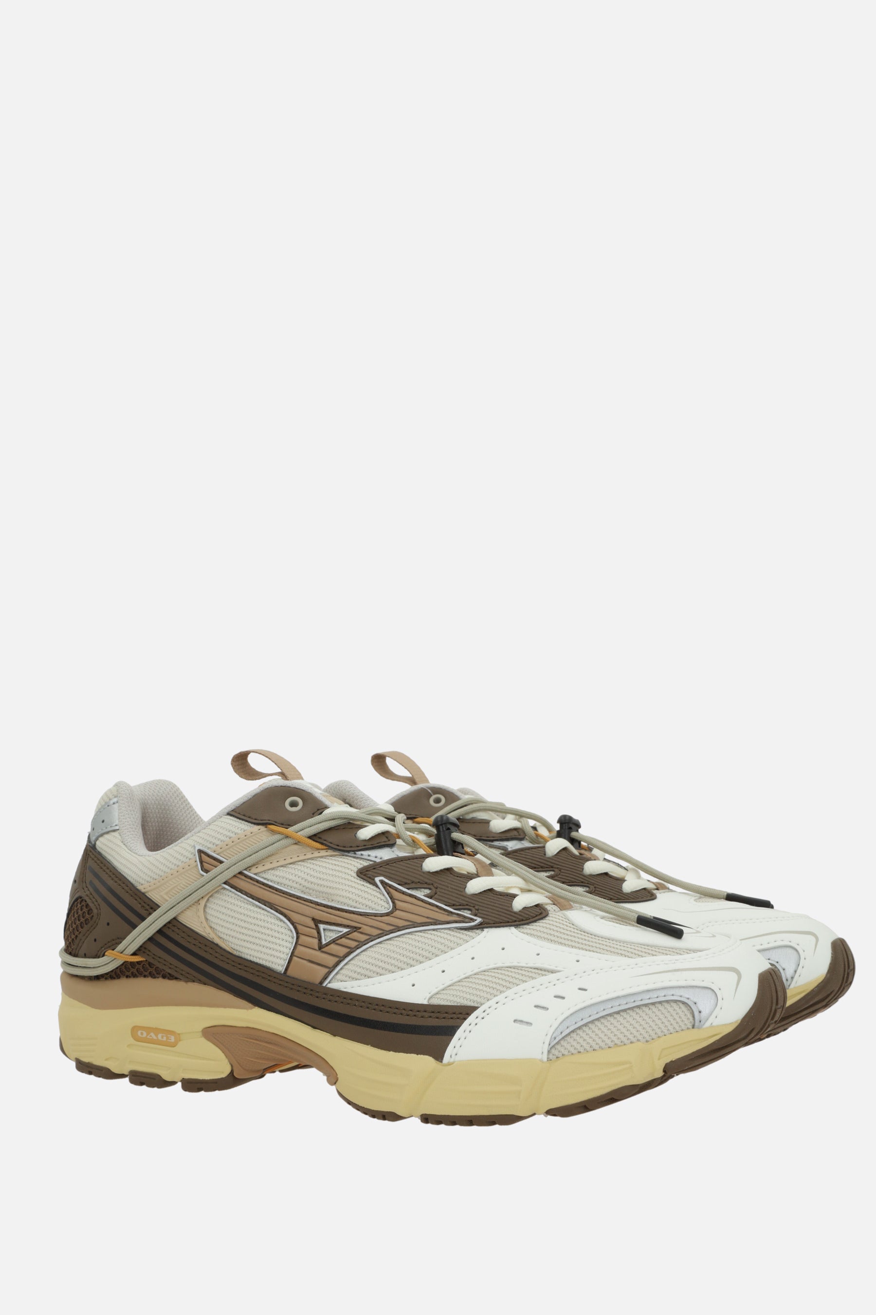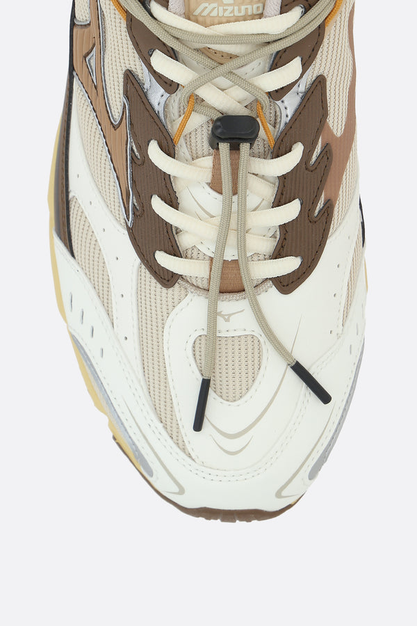 Mizuno low-top sneakers crafted from beige mesh with white and brown vegan leather details. They feature a lace-up closure, elasticized lacing on the upper, a rounded toe, logos in multiple locations, fabric linings, and a textured rubber sole.