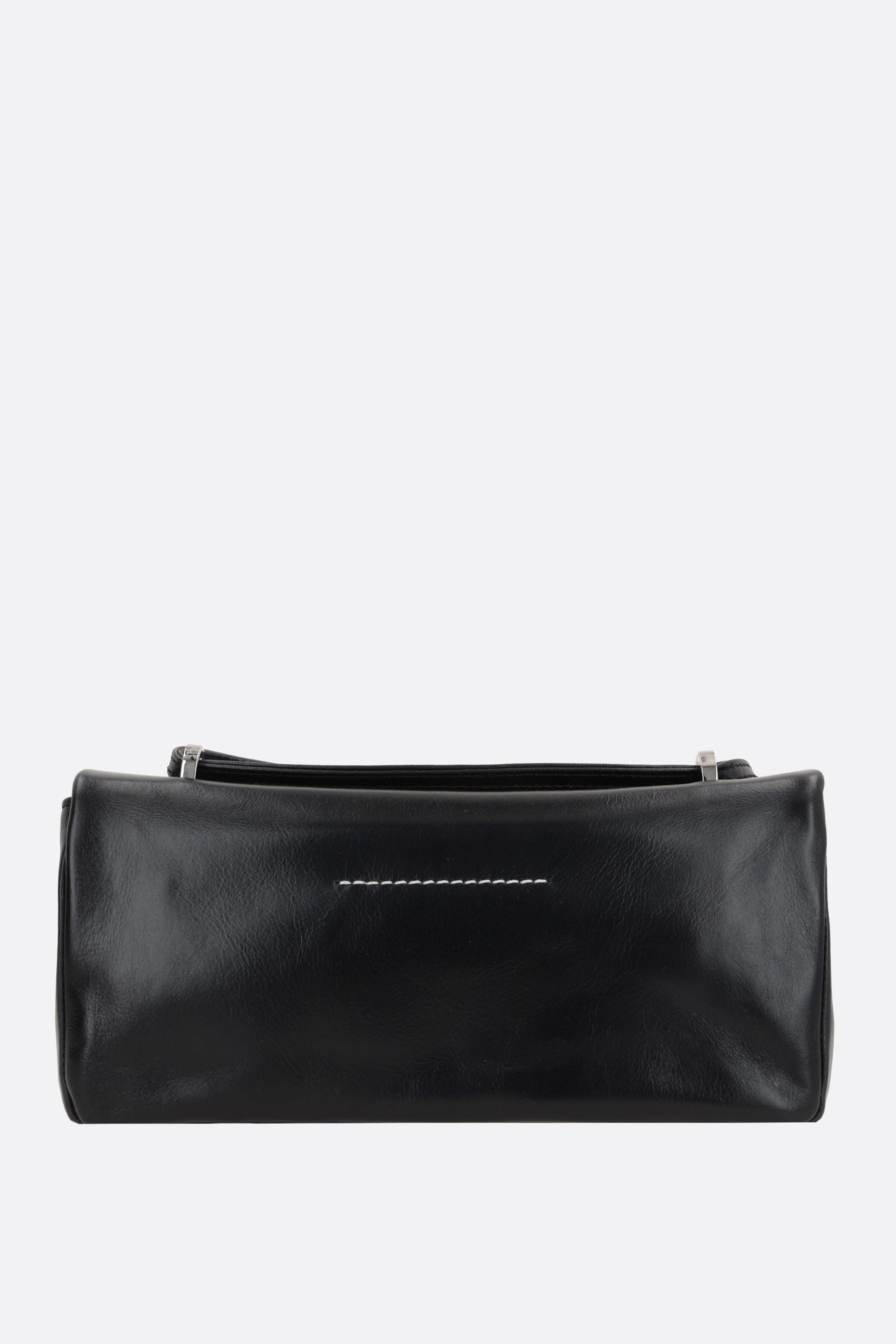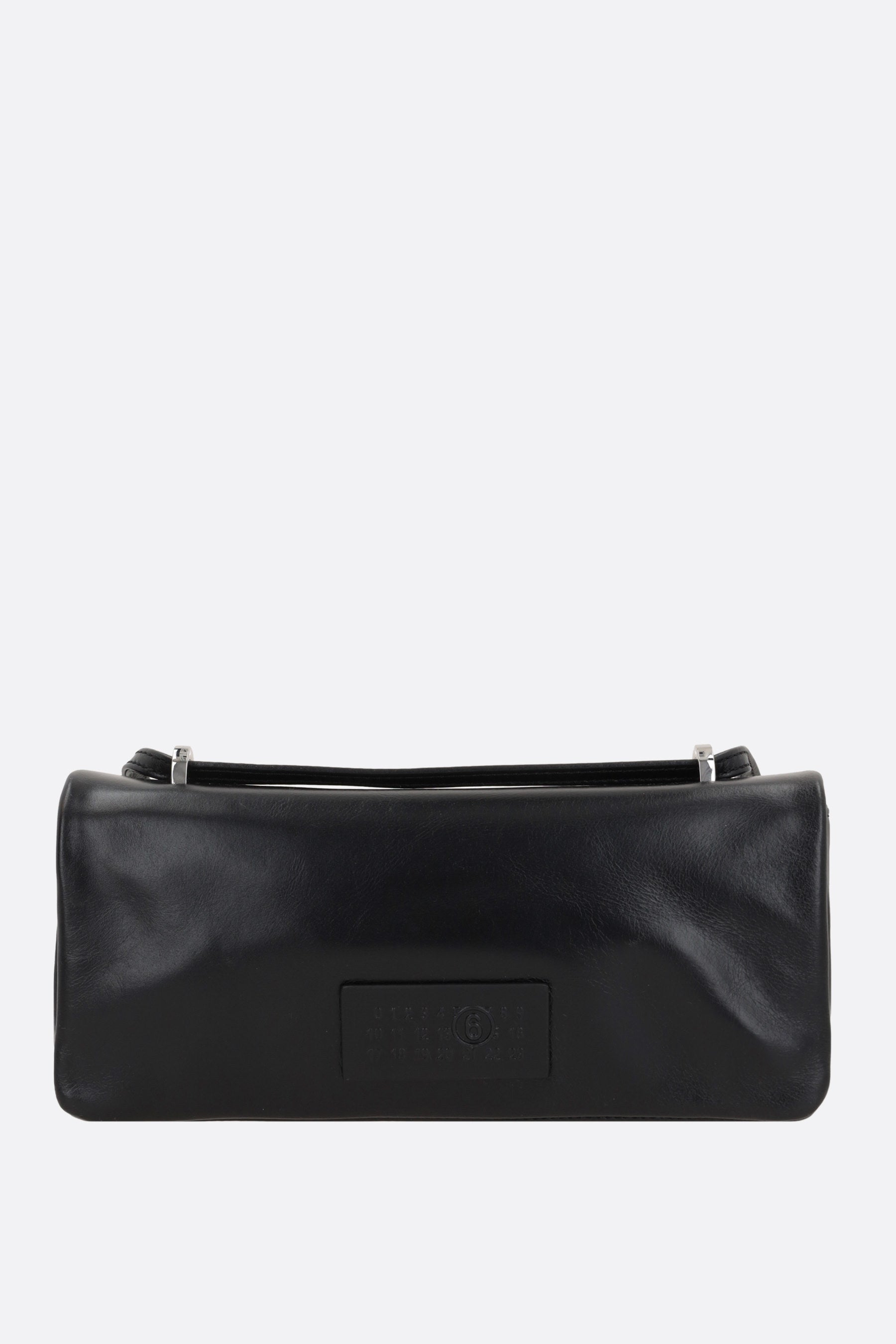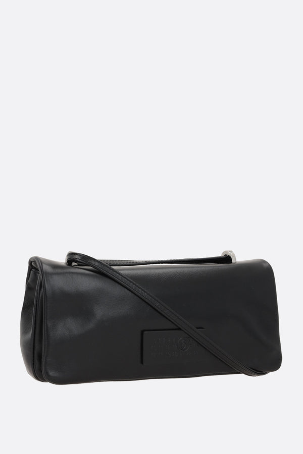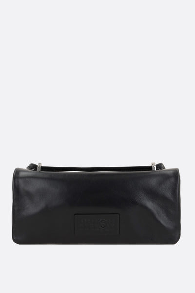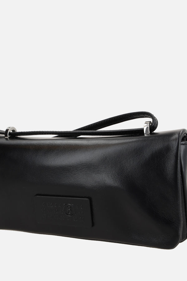 MM6 shoulder bag made of glossy black leather with a numeric logo patch applied on the front. Featuring silver-tone hardware, magnetic button closure on the flap, and an adjustable knotted shoulder strap. The black canvas-lined interior includes a zip pocket. The design is completed with the Maison's signature white stitching on the back.