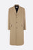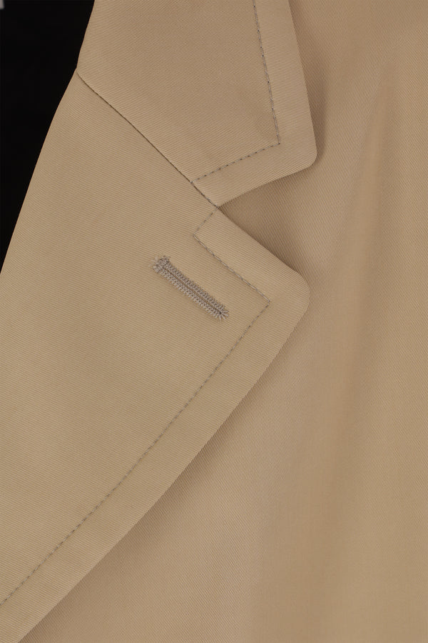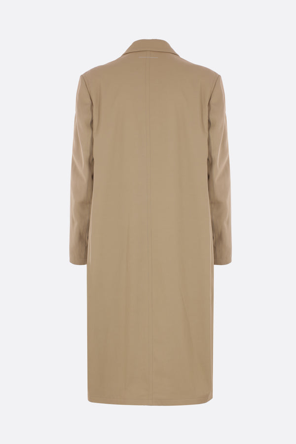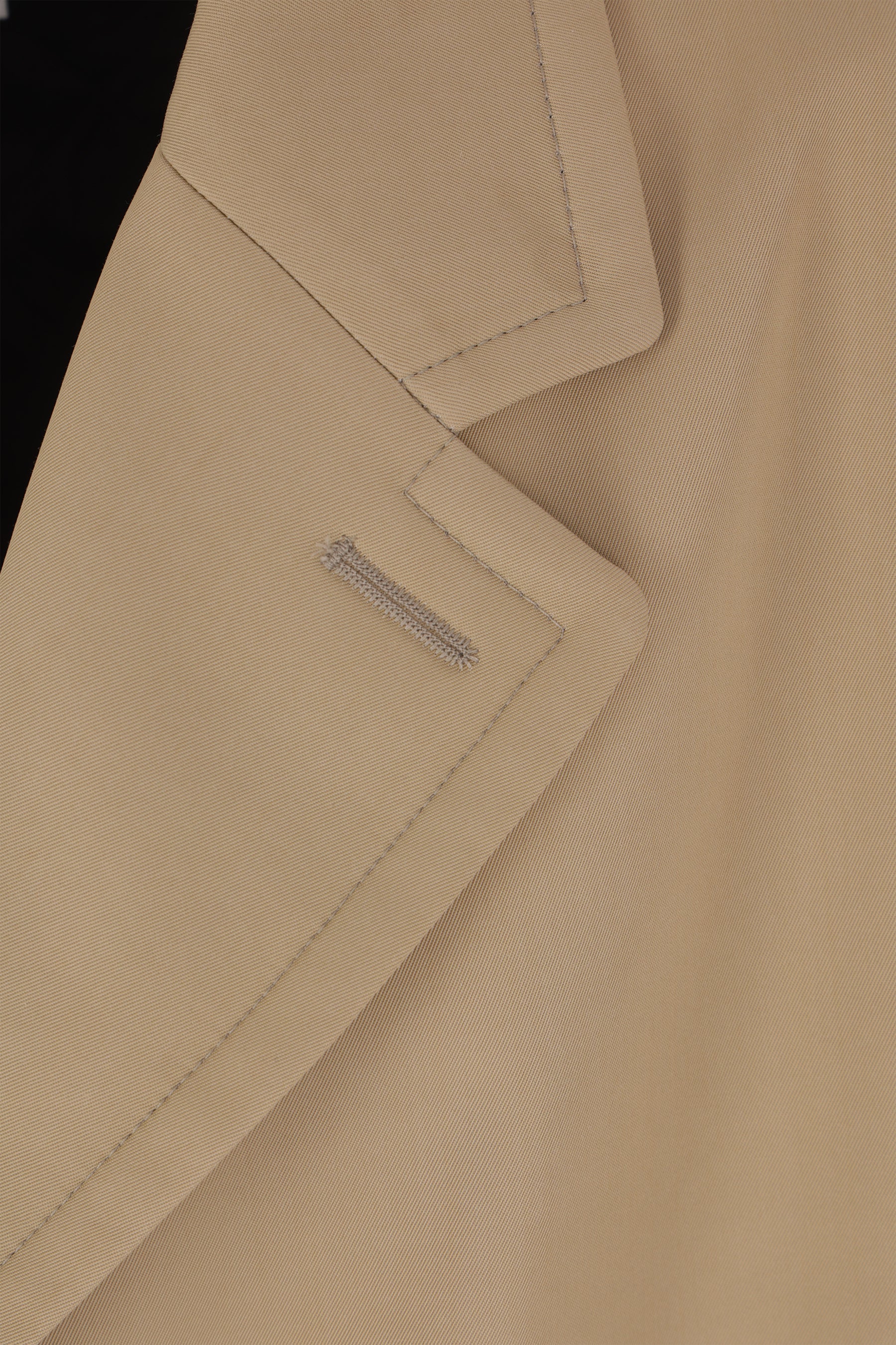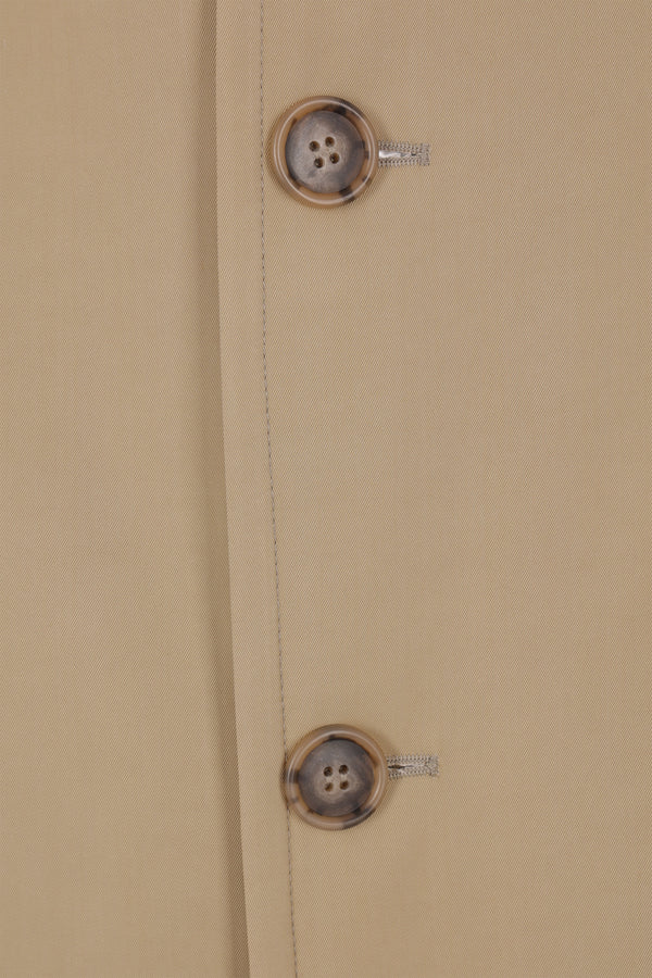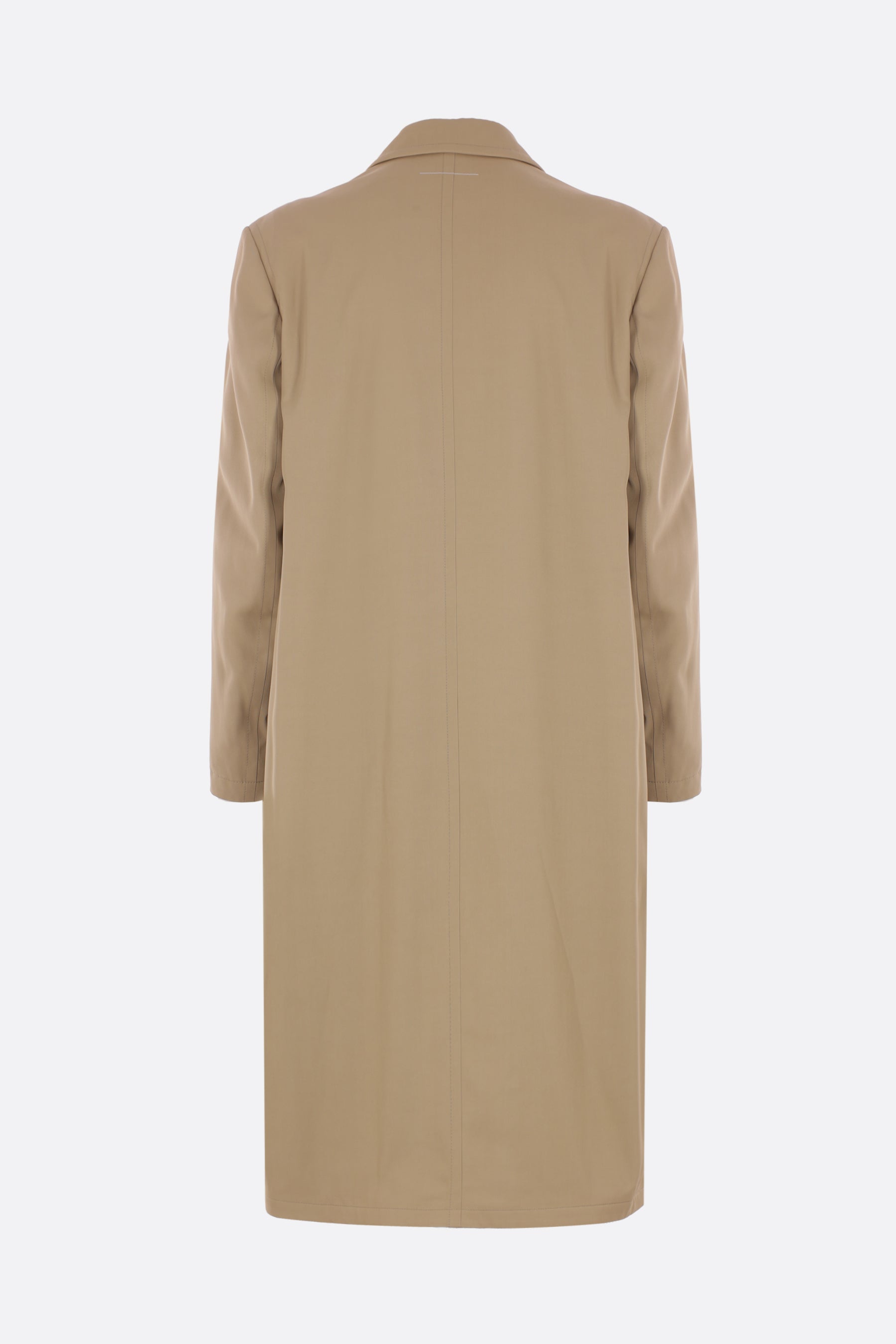 Single-breasted coat by MM6 made of beige viscose. Features classic lapels, front button closure, flap pockets, long sleeves, and straight hem. Quilted interior.