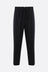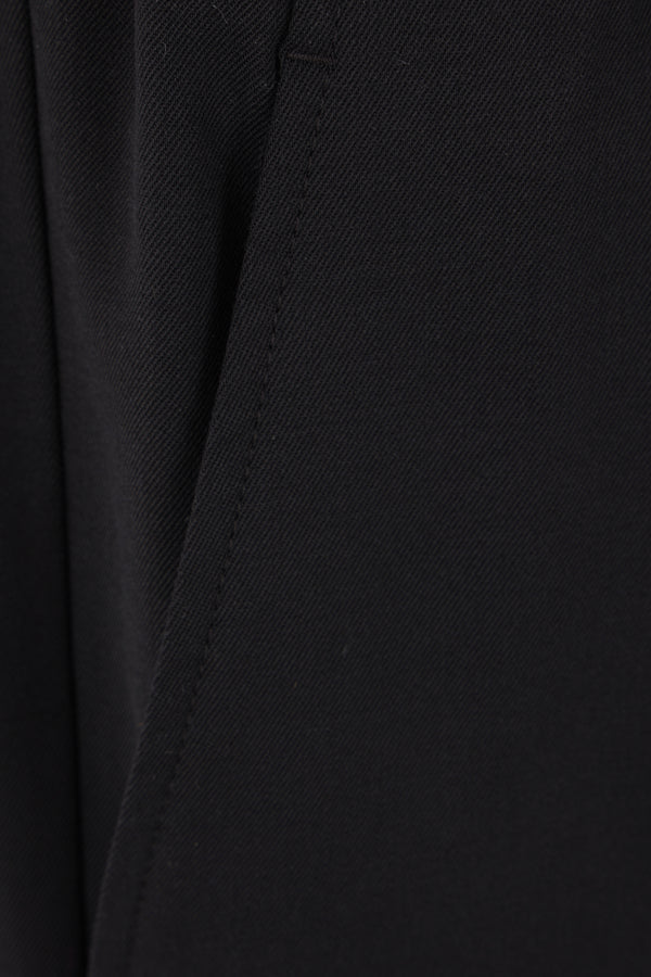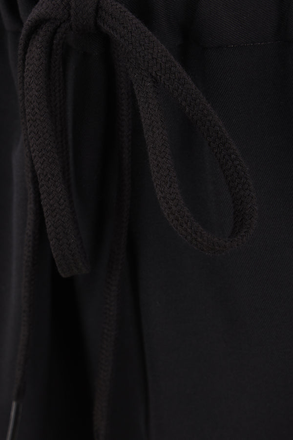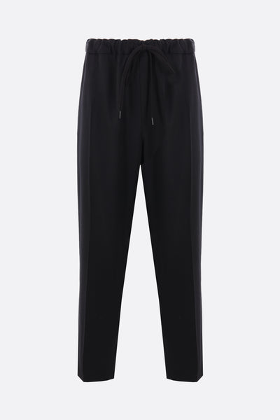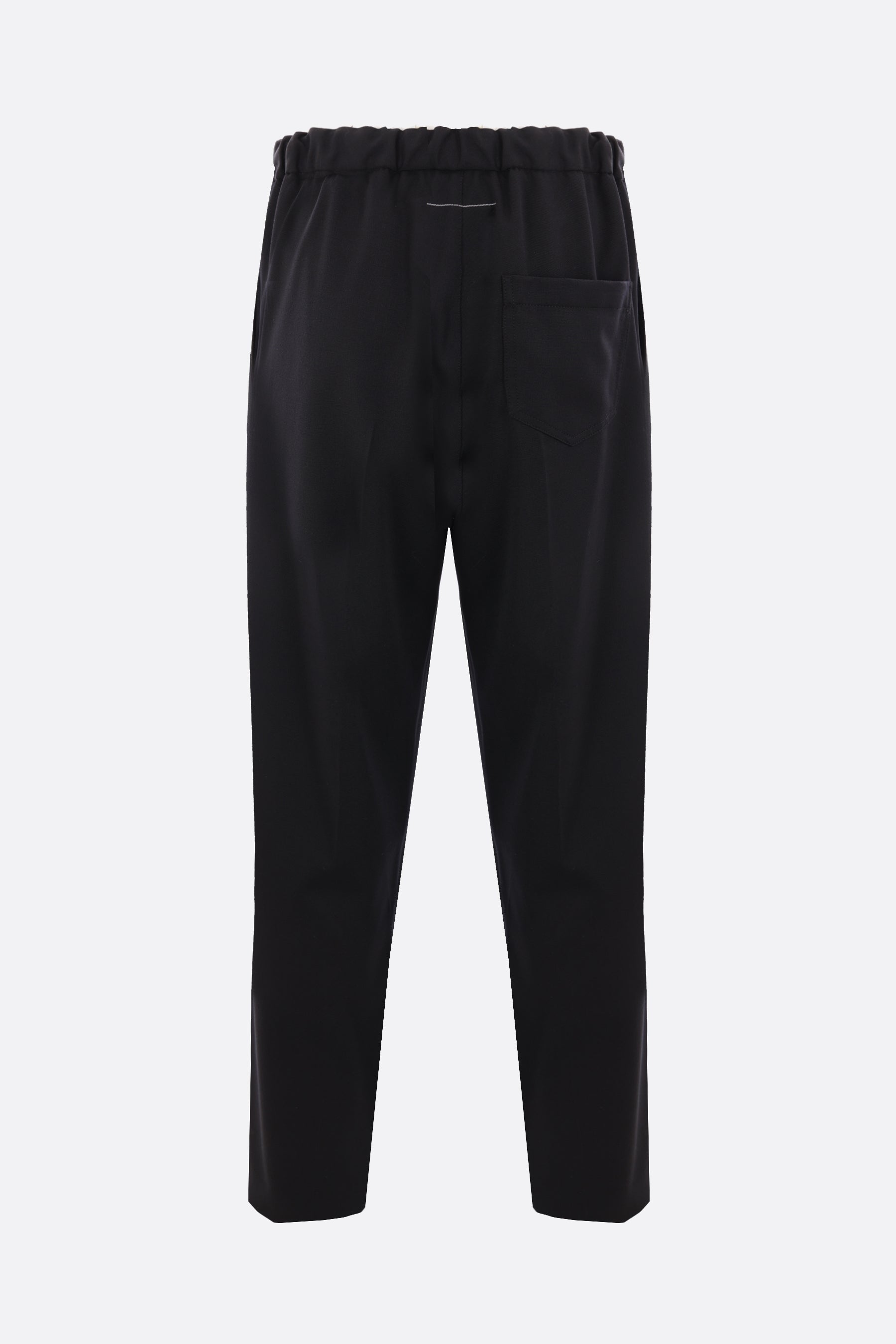 MM6 straight-leg trousers crafted in black wool blend. Featuring an elasticated waistband with drawstring, multiple pockets, a central crease, and an unlined interior. The design is completed with the Maison's signature white stitching on the back.
