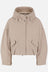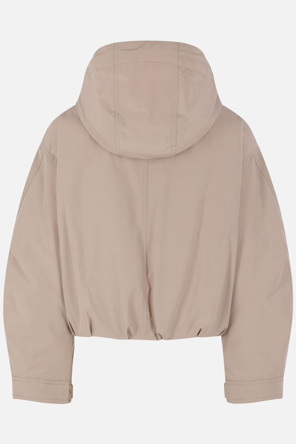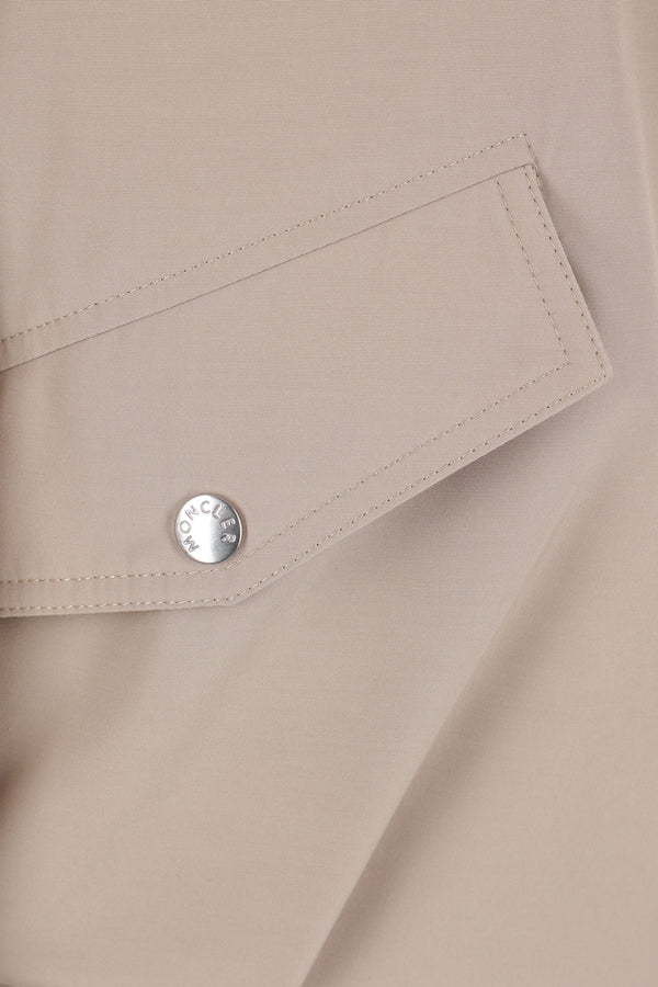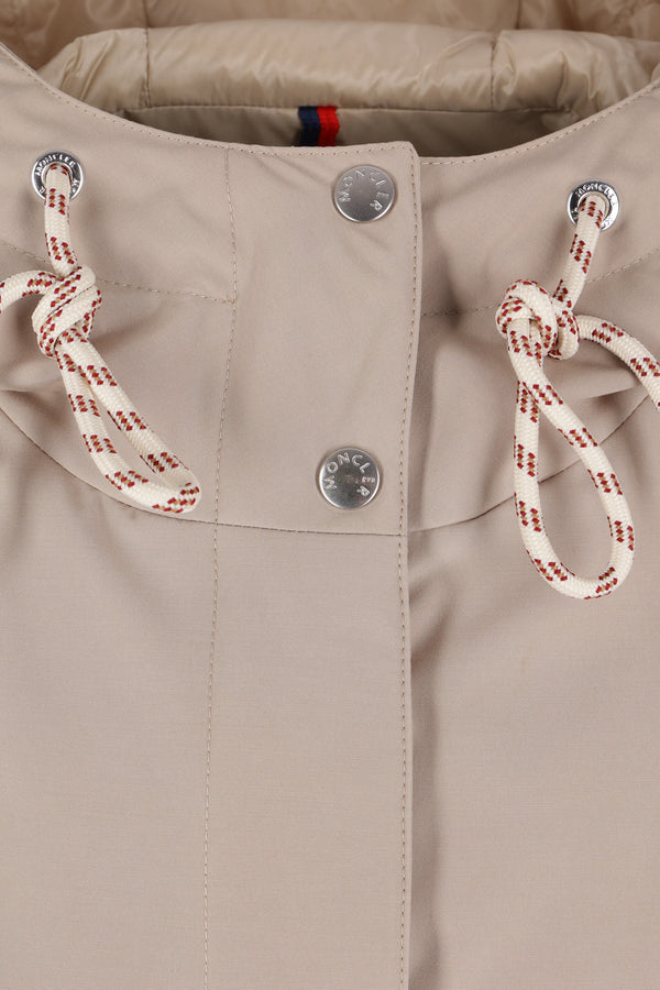 Moncler oversized, slightly cropped down jacket crafted in beige technical cotton with a logo patch on the left sleeve. It features a classic hood with drawstring, double-zip and snap-button closure, flap pockets, long sleeves with adjustable cuffs, and a balloon hem with drawstring.