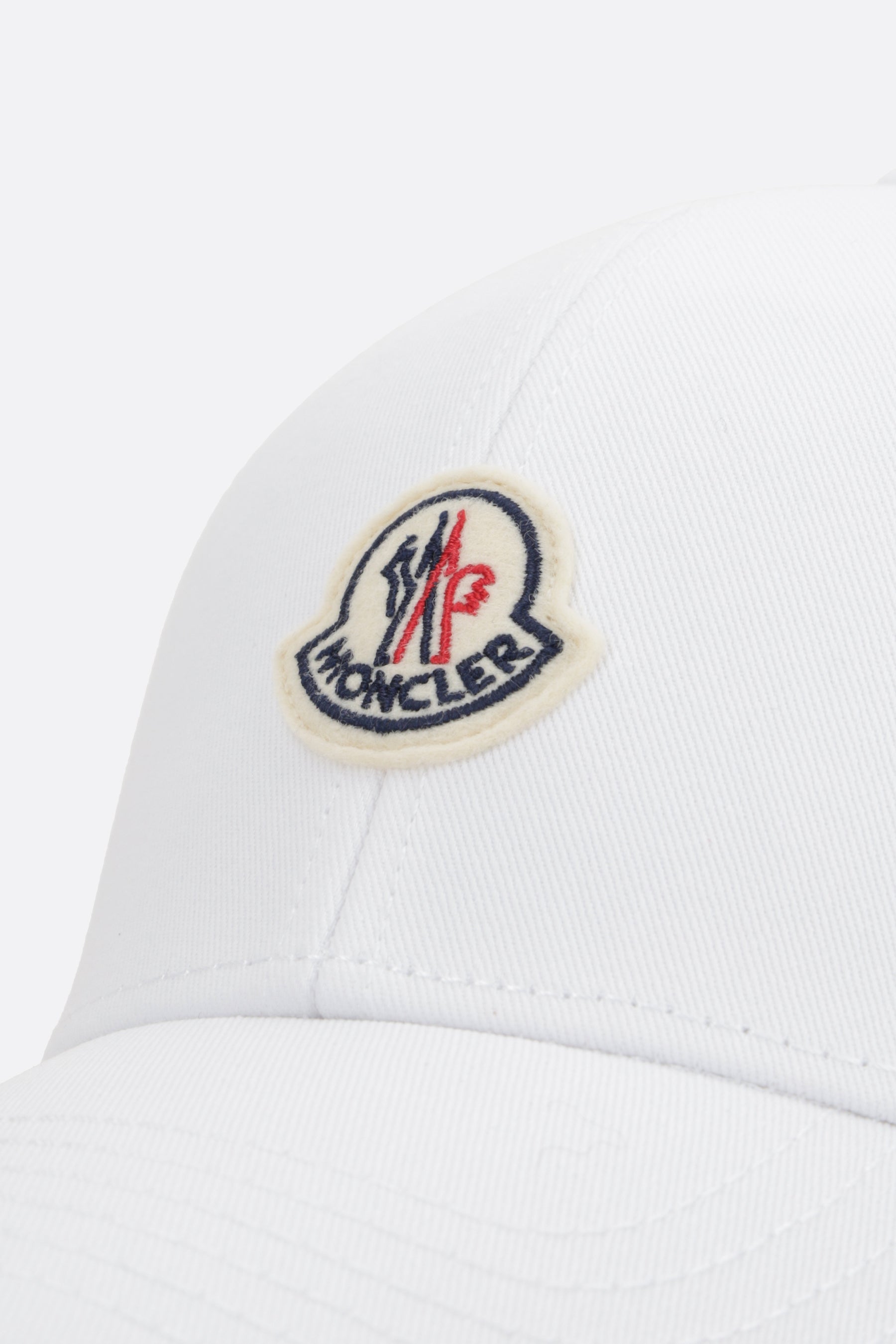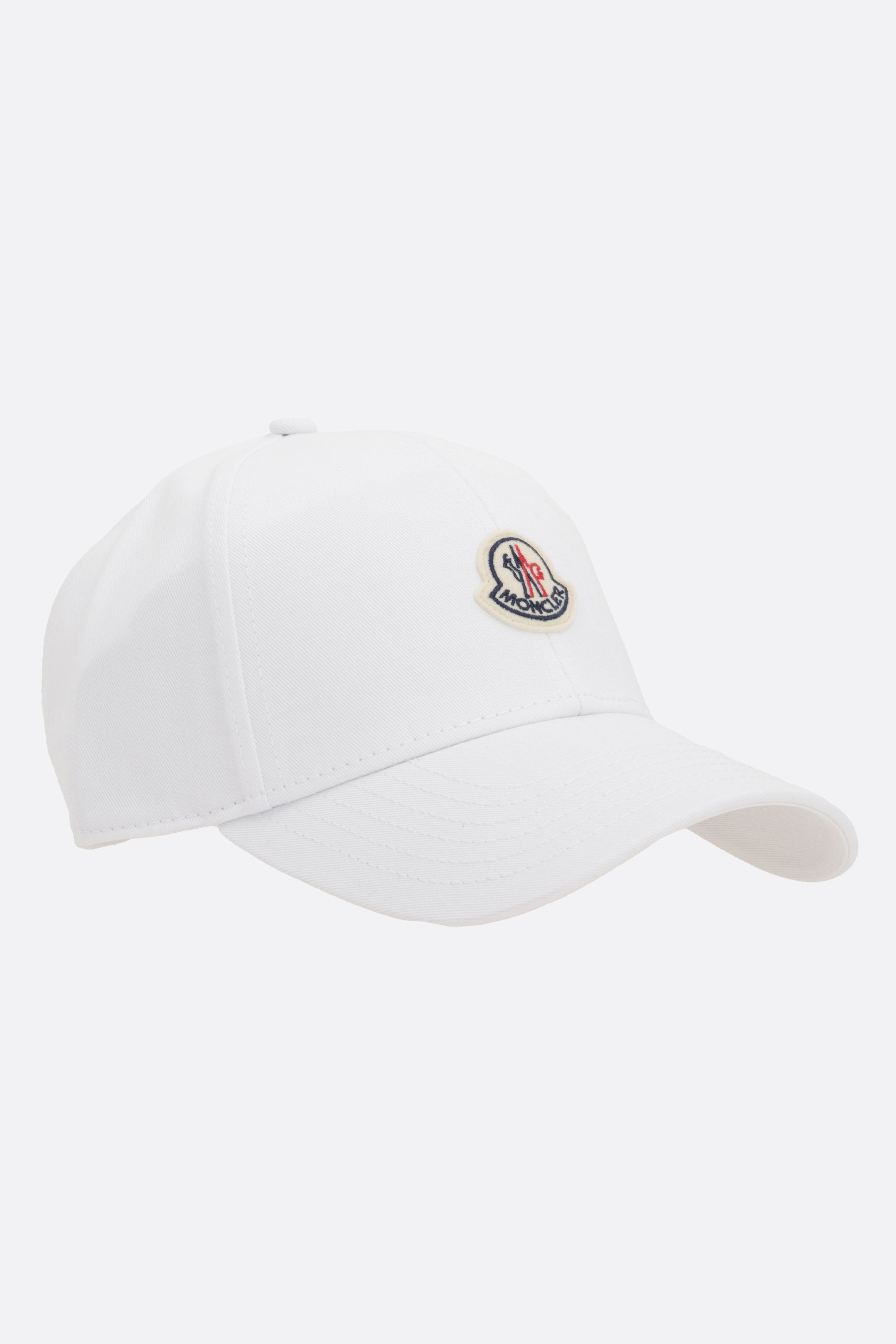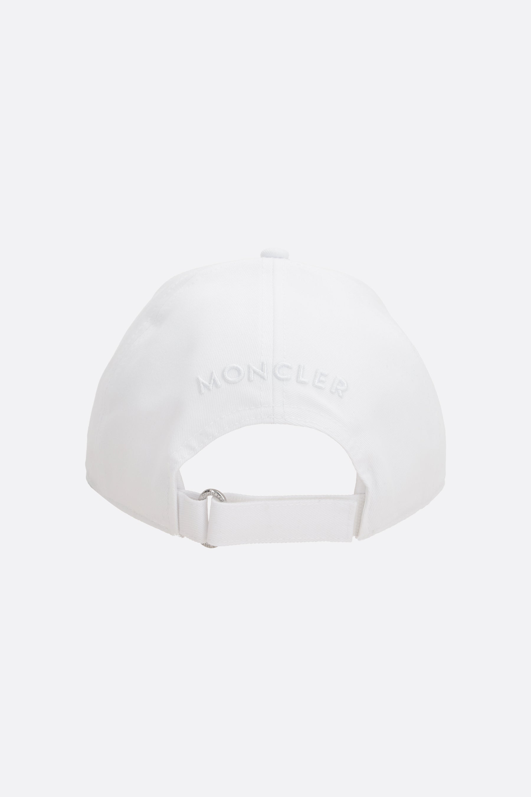 Moncler baseball cap made of white cotton gabardine, featuring a front logo patch and tone-on-tone embroidered logo lettering on the back. Designed with an adjustable velcro strap and a lined interior.