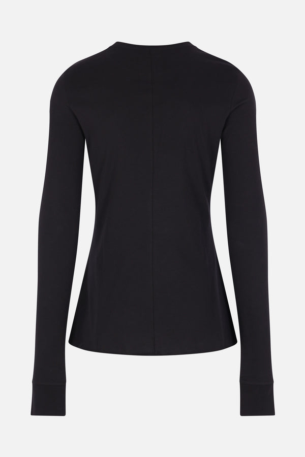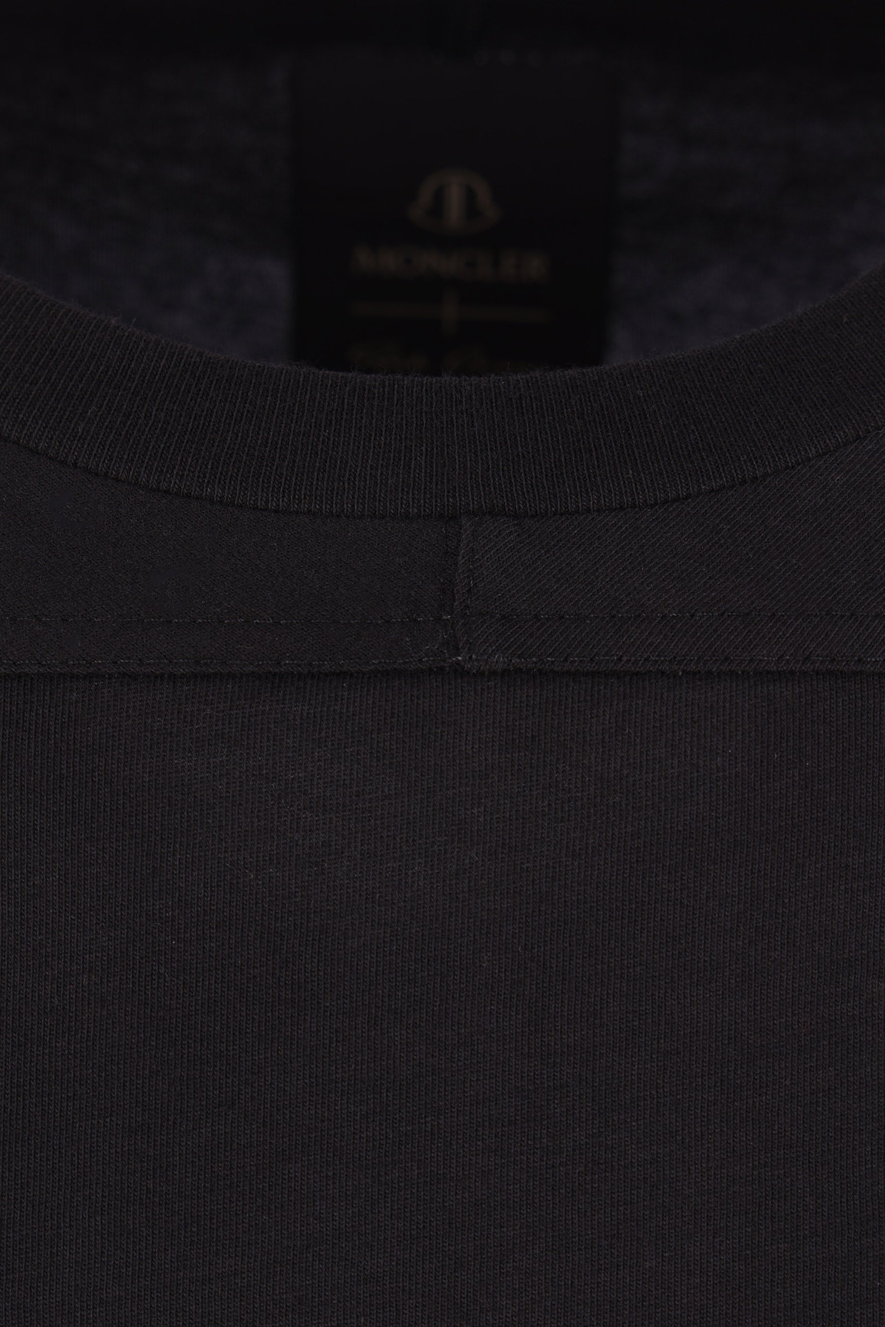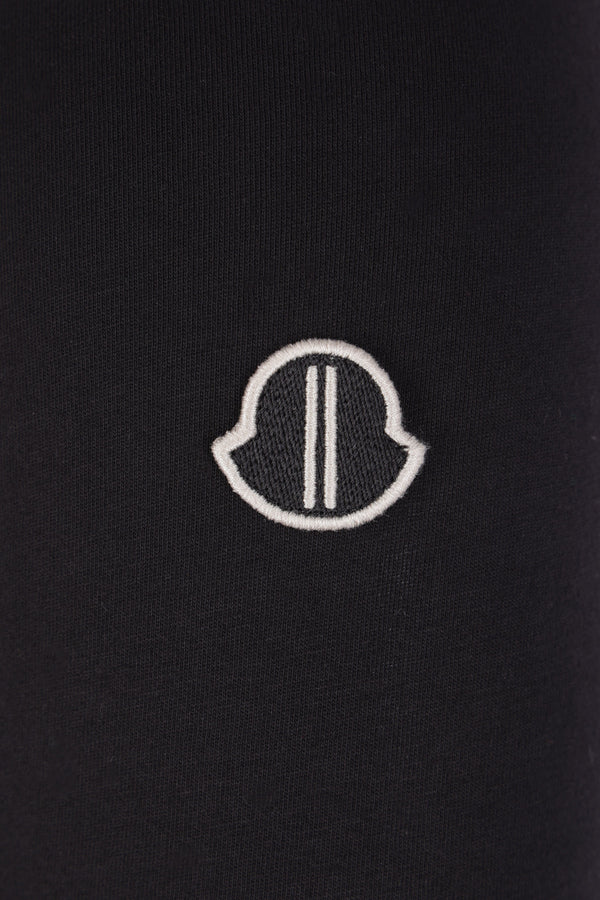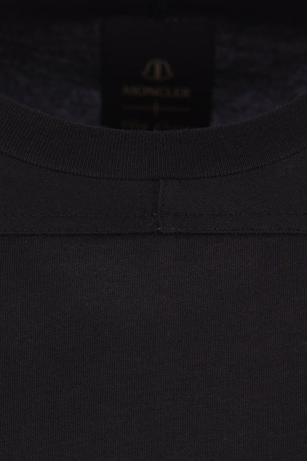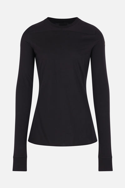 Moncler x Rick Owens long-fit t-shirt crafted from black cotton jersey with a logo patch on the left sleeve. Featuring a crew neckline, extra-long sleeves, and a rounded hem with raw-cut finish.