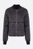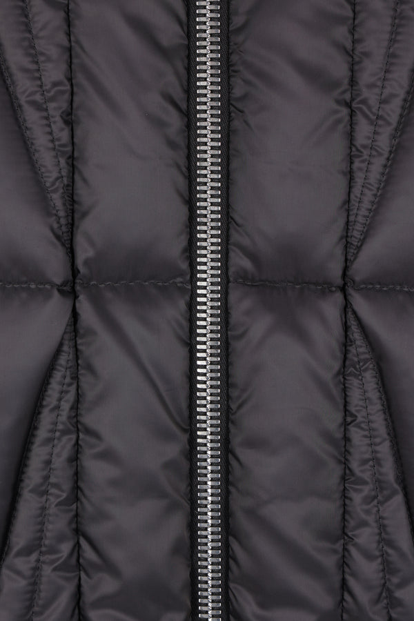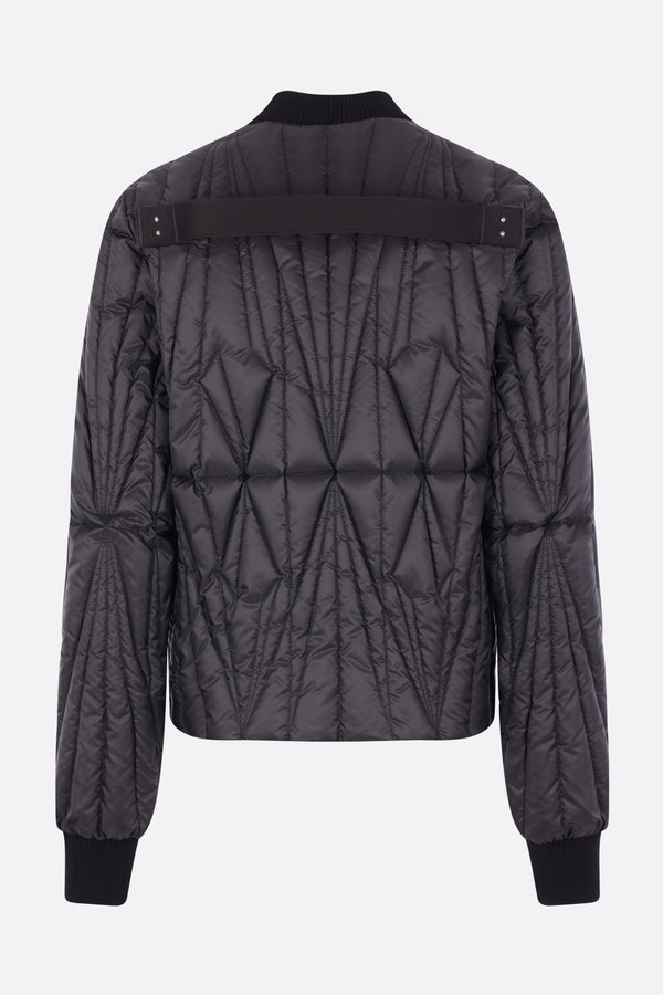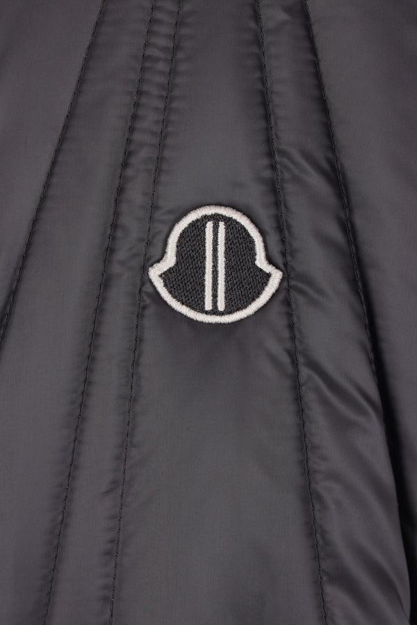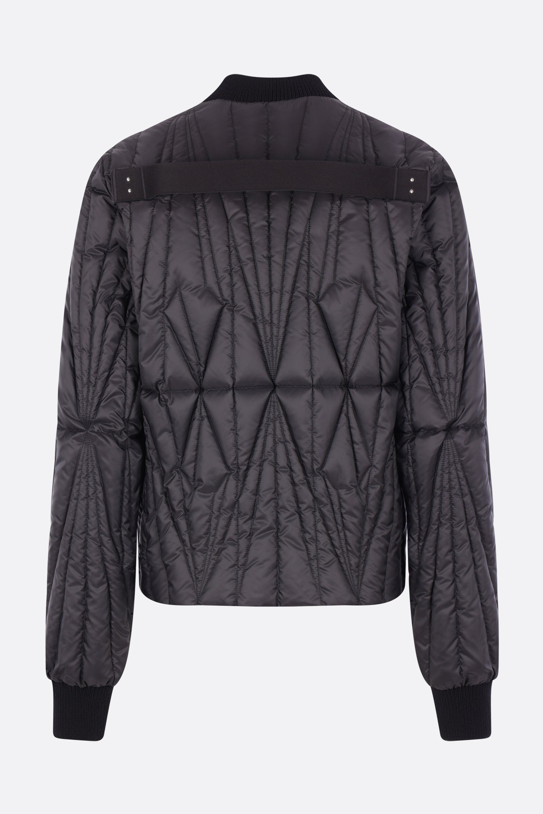 Moncler x Rick Owens down jacket crafted from black nylon with graphic quilting and a logo patch on the left sleeve. Featuring a rib-knit bomber collar, front zip closure, welt pockets, long sleeves with rib-knit cuffs, and a straight hem. The design is completed with a signature webbing strap on the back yoke.