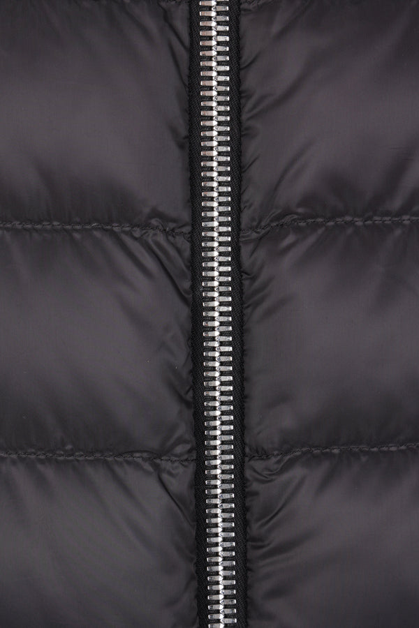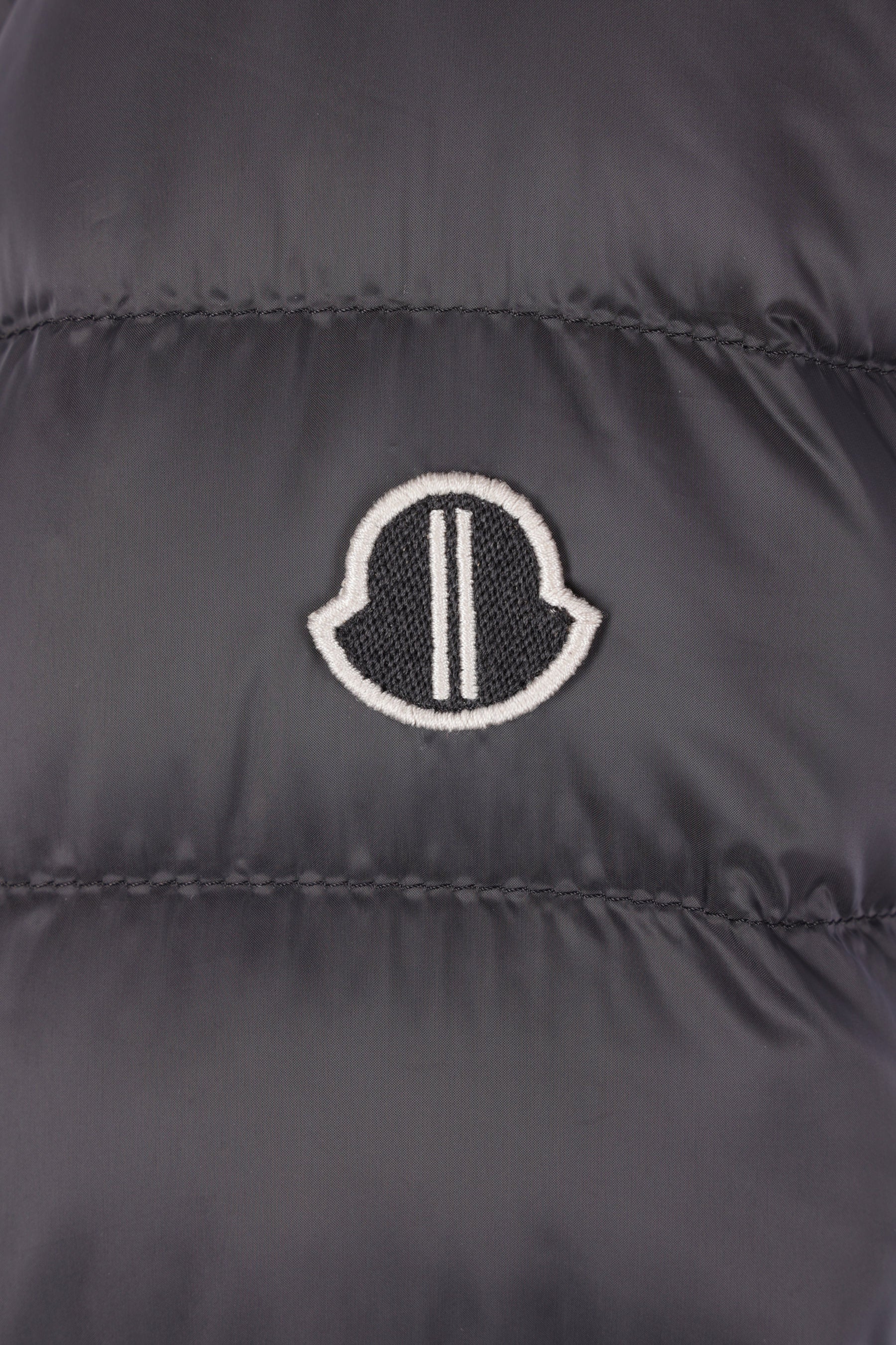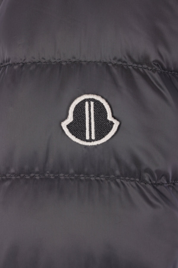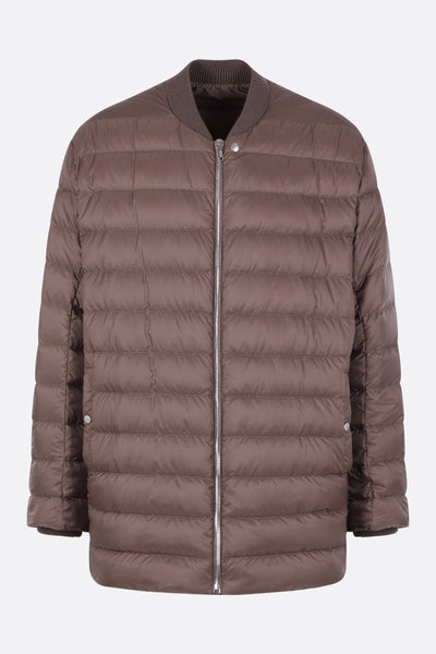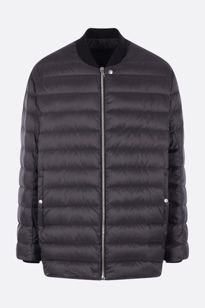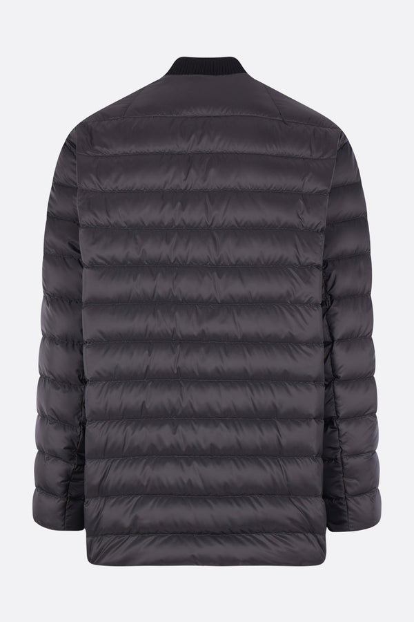 Moncler x Rick Owens down jacket crafted from black nylon with a logo patch on the left sleeve. Featuring a rib-knit bomber collar, front zip closure, welt pockets, long sleeves with rib-knit cuffs, and a straight hem.