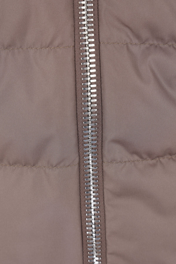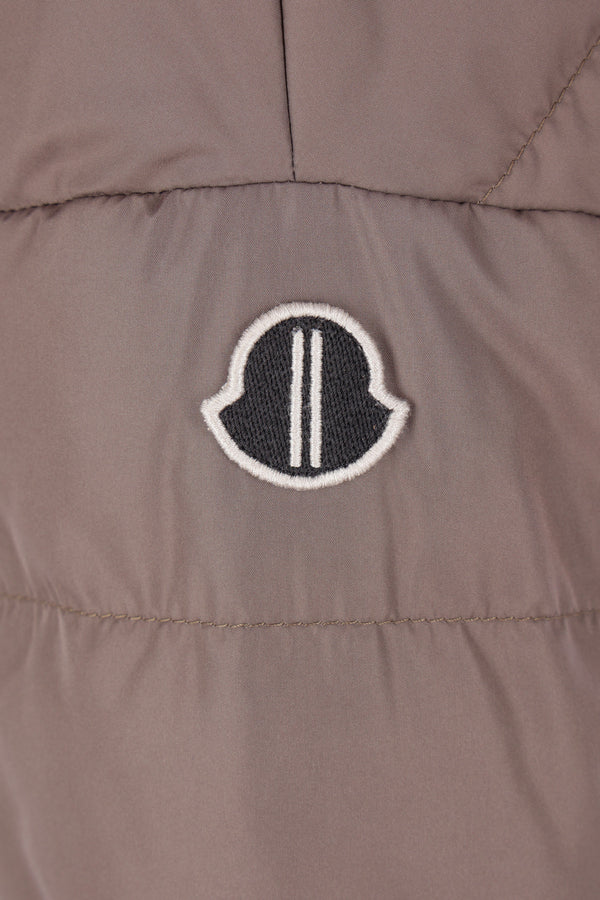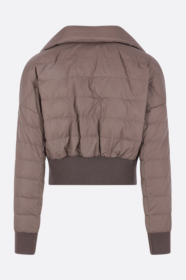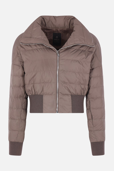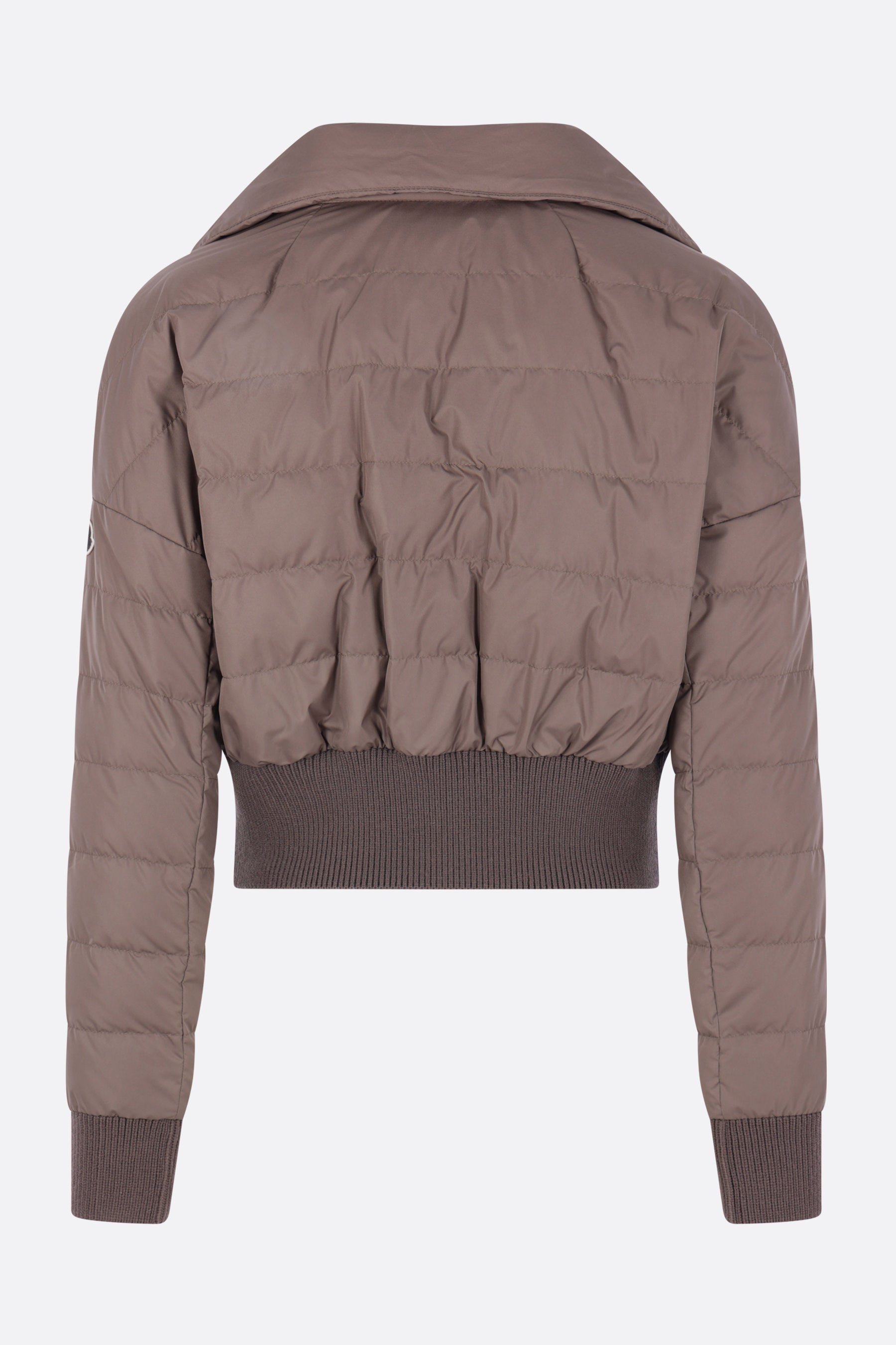Moncler x Rick Owens cropped down jacket crafted from brown nylon with a logo patch on the left sleeve. Featuring a high collar, front zip closure, rib-knit edges, long sleeves, and a straight hem.