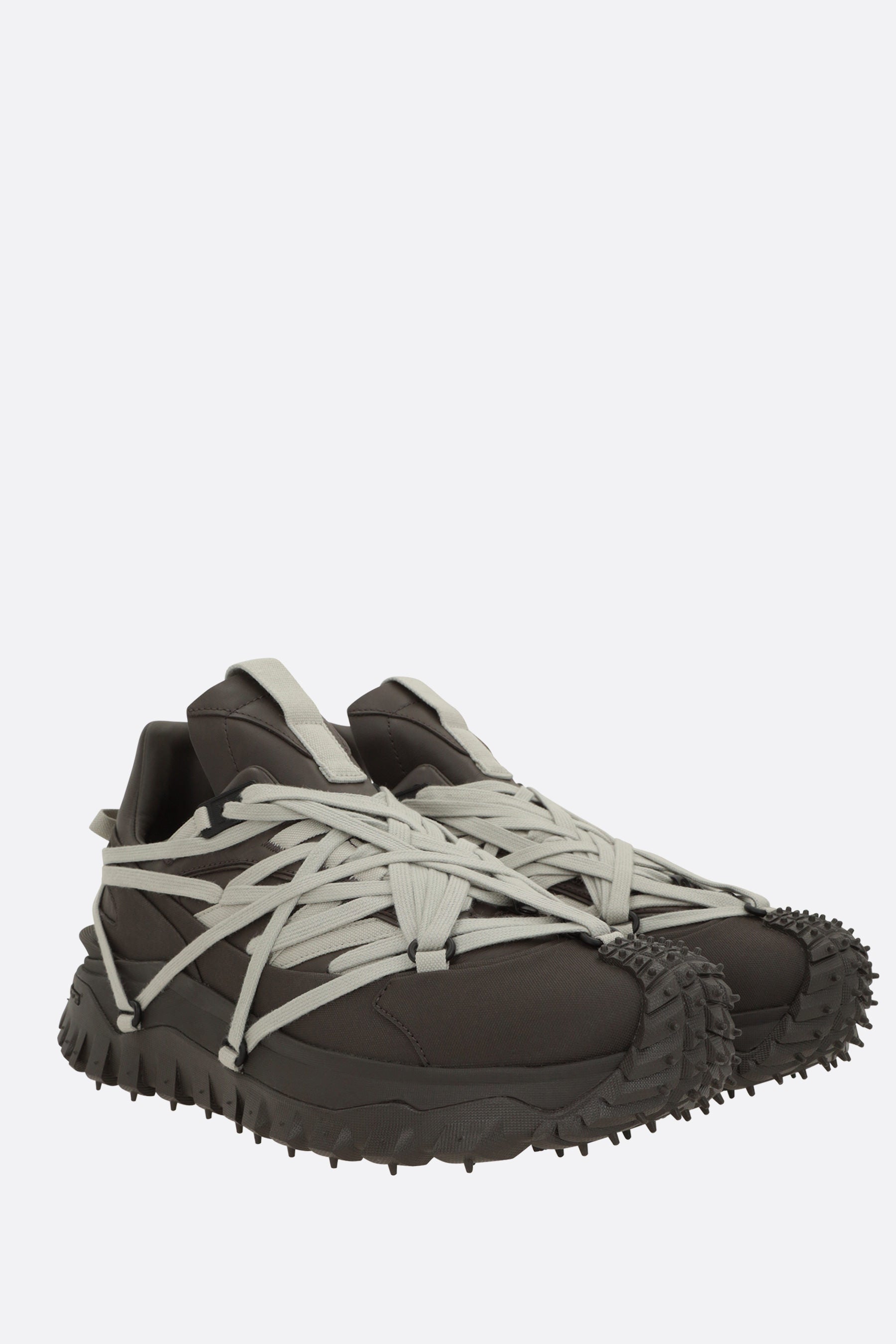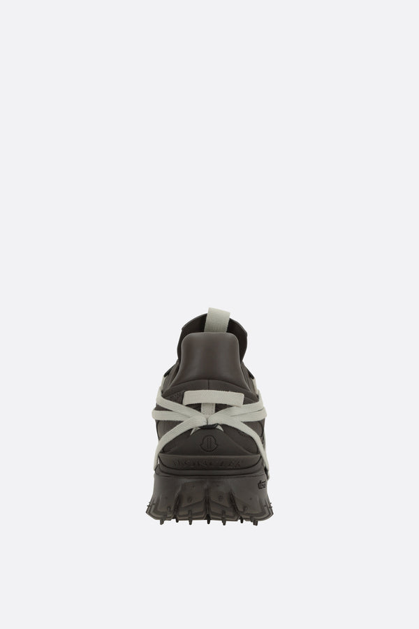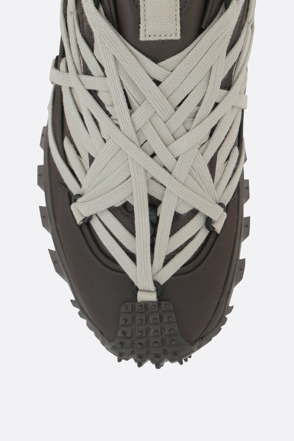 Moncler x Rick Owens low-top sneakers crafted from smooth leather, canvas, and brown rubber. Featuring contrasting laces forming a pentagram shape on the upper, round toe, reinforced heel, fabric and leather linings, and Vibram Megagrip rubber sole.