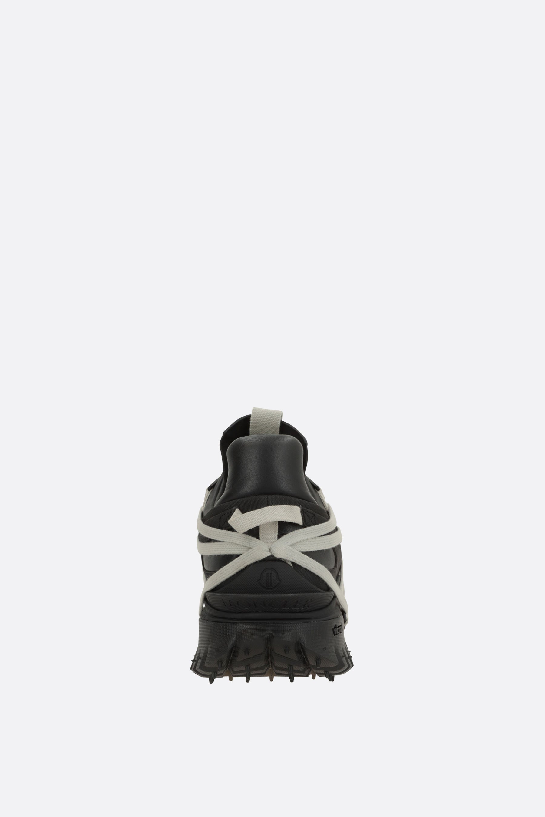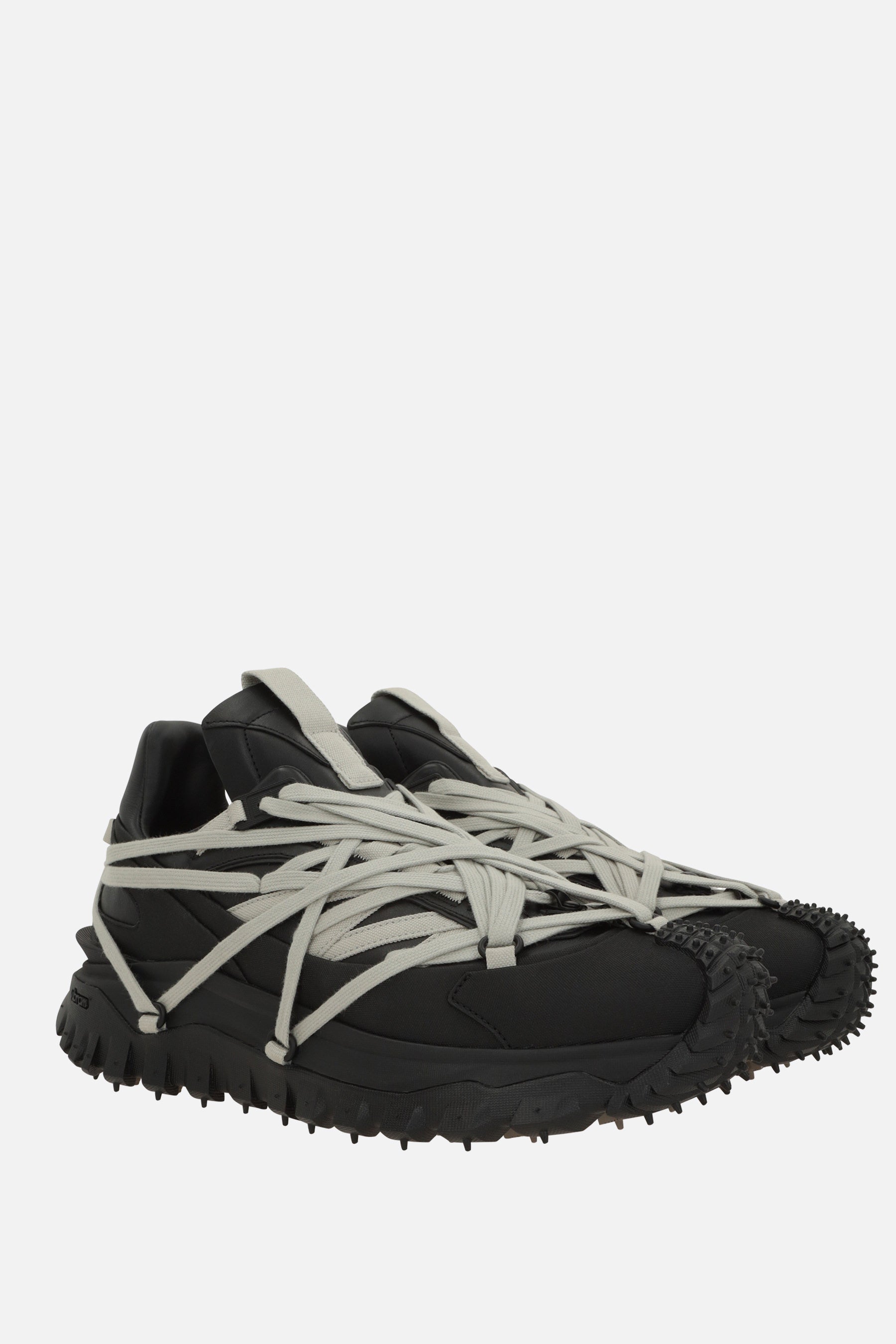 Moncler x Rick Owens low-top sneakers crafted from smooth leather, canvas, and black rubber. Featuring contrasting laces forming a pentagram shape on the upper, round toe, reinforced heel, fabric and leather linings, and Vibram Megagrip rubber sole.