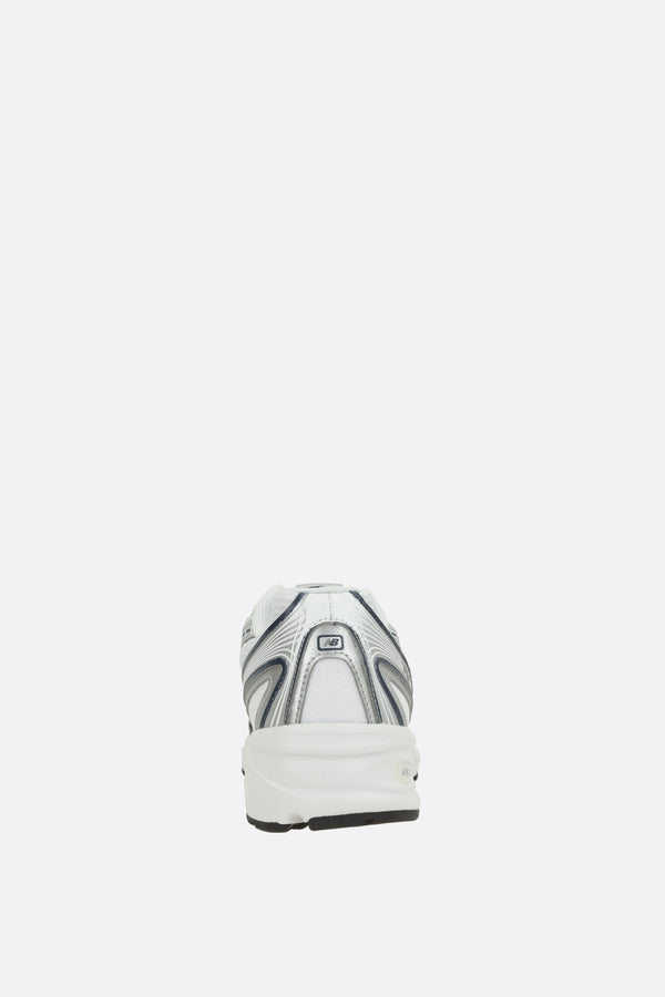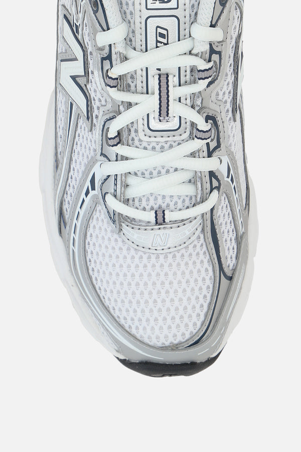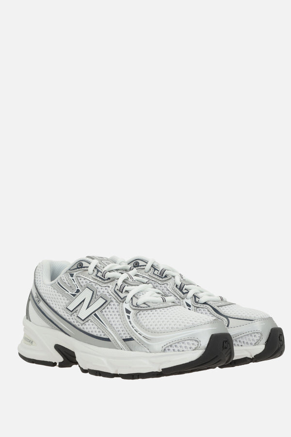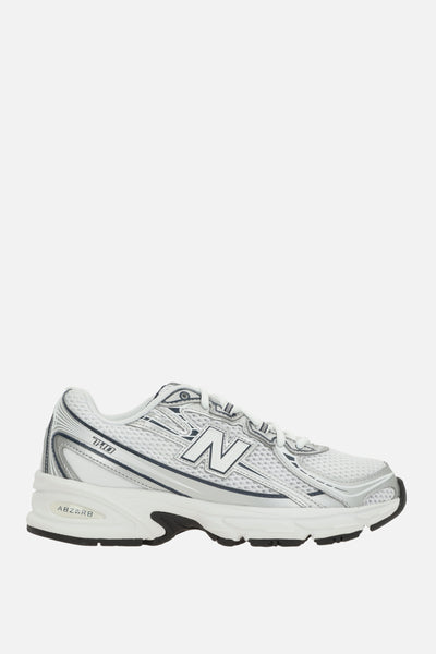 New Balance low-top sneakers made of white mesh with silver faux leather details. Featuring a lace-up closure, round toe, fabric linings, an ABZORB-cushioned midsole, and a rubber outsole. The design is completed with N patches on the sides and the NB 740 logo printed on the tongue.
