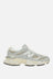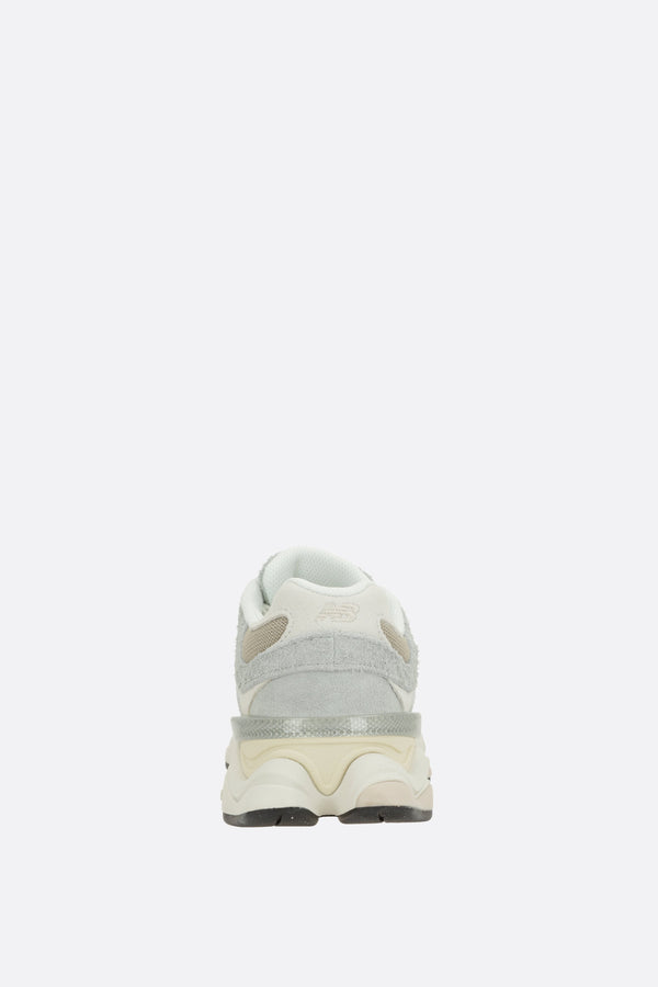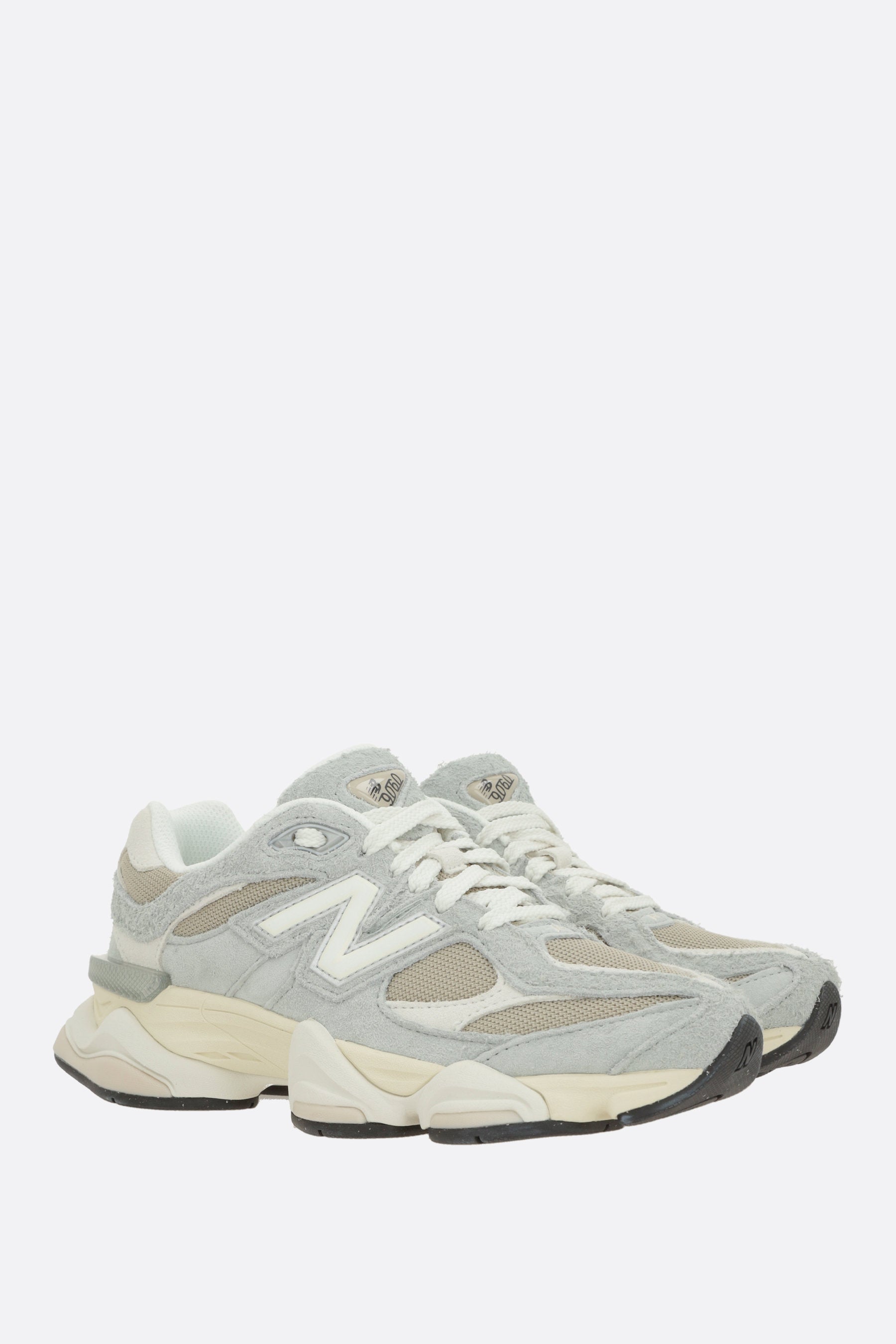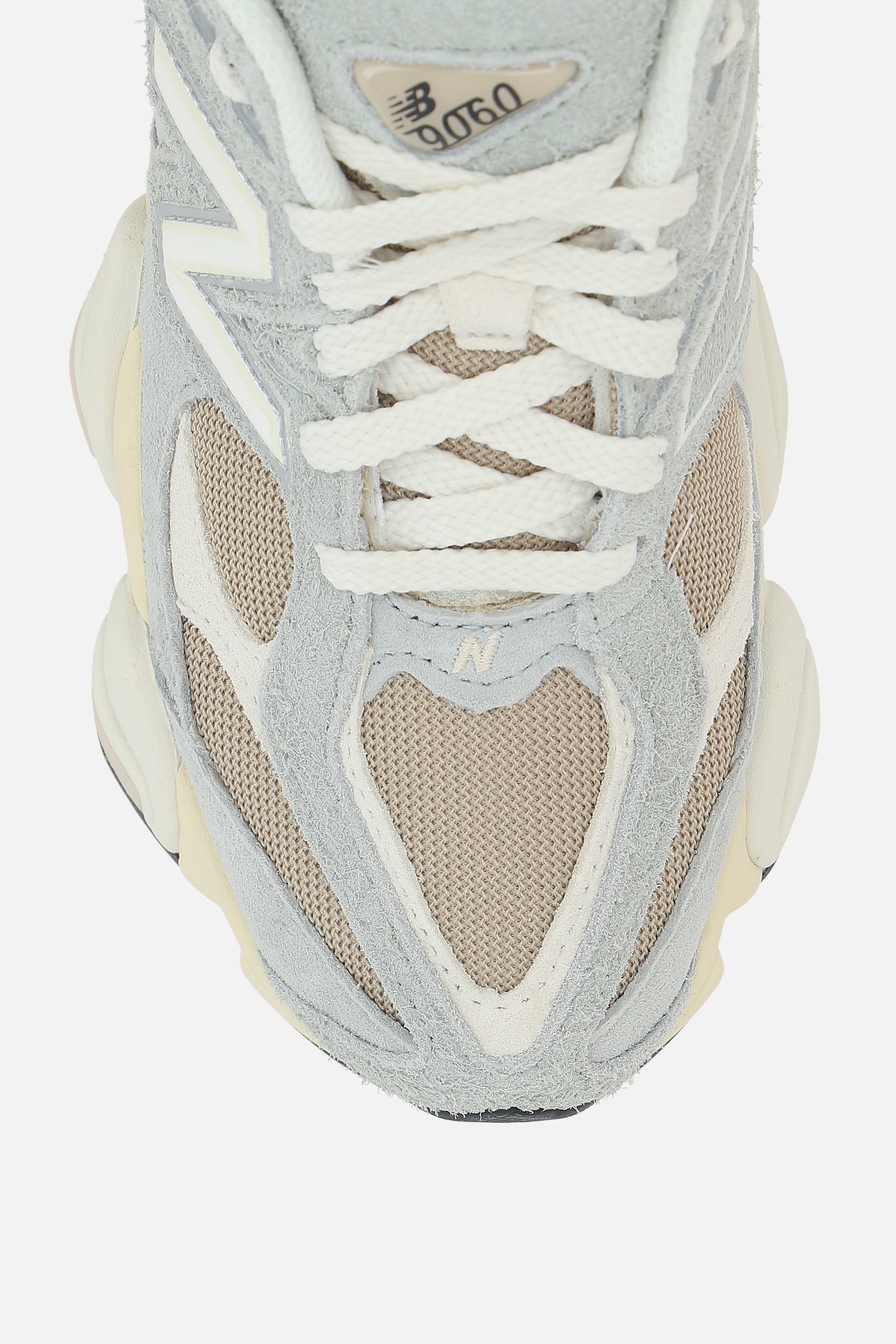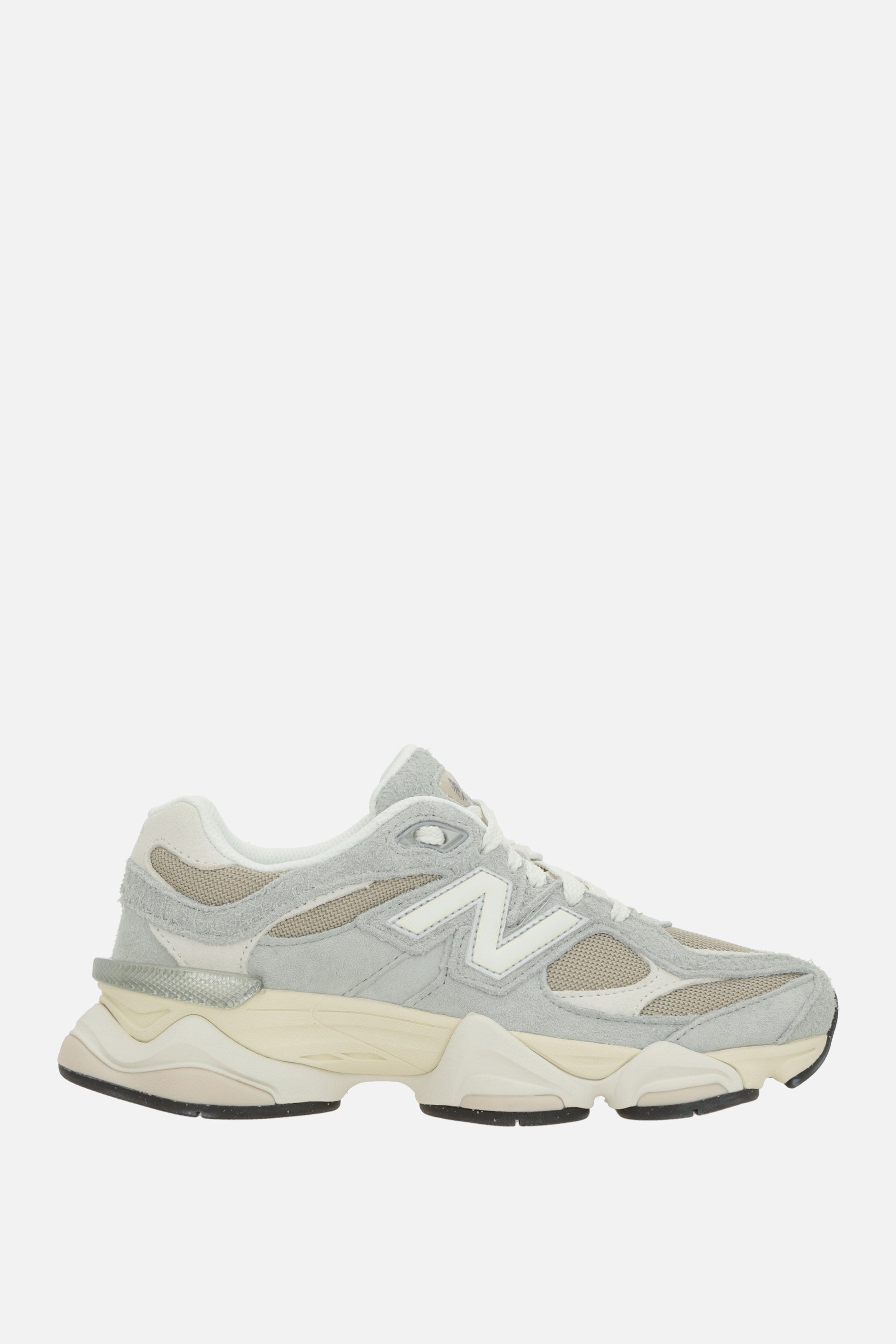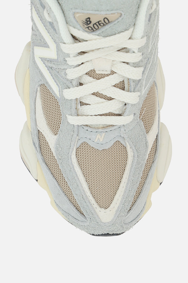 New Balance low-top sneakers made of beige mesh and light grey suede with contrasting details. Featuring a lace-up closure, round toe, fabric linings, a dual-density midsole with ABZORB and SBS cushioning, and a rubber outsole. The design is completed with reflective embroidered N logos on the sides, an NB 9060 patch on the tongue, and an embroidered NB detail on the heel.