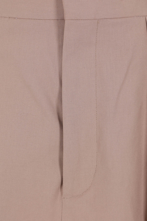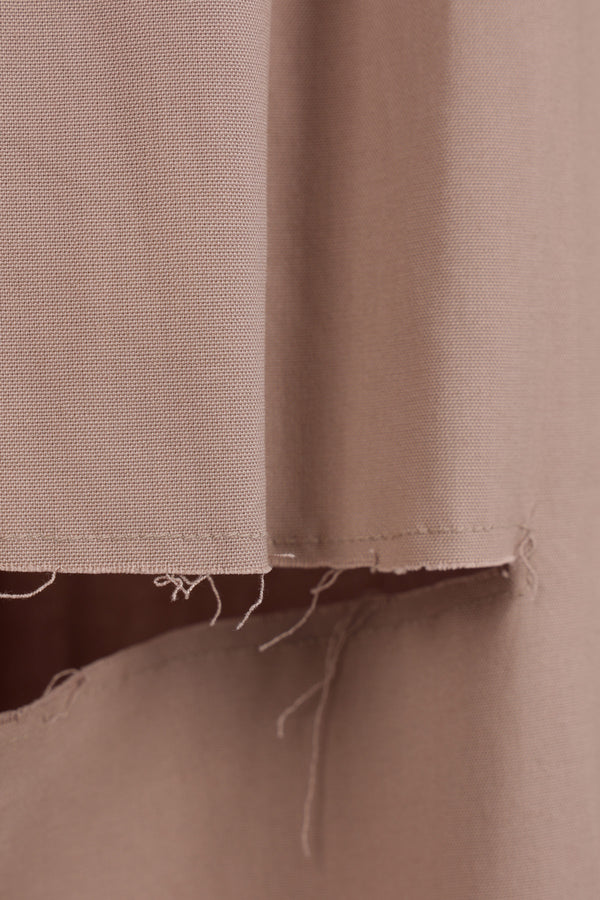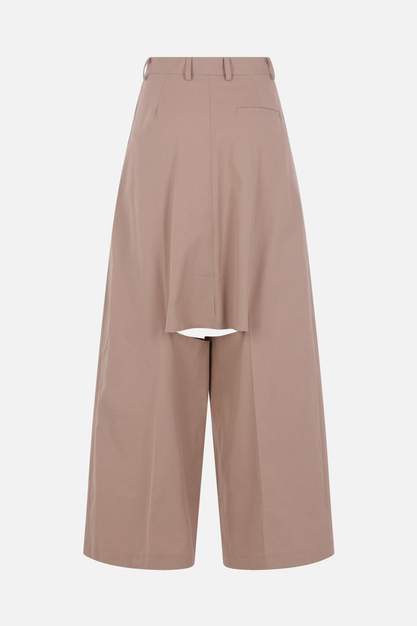 Niccolò Pasqualetti skirt trousers crafted from camel-colored cotton canvas with a deconstructed frayed-edge design. Featuring a hook, button, and zip closure, belt loops, multiple pockets, double pleats, a center crease, and an unlined interior.