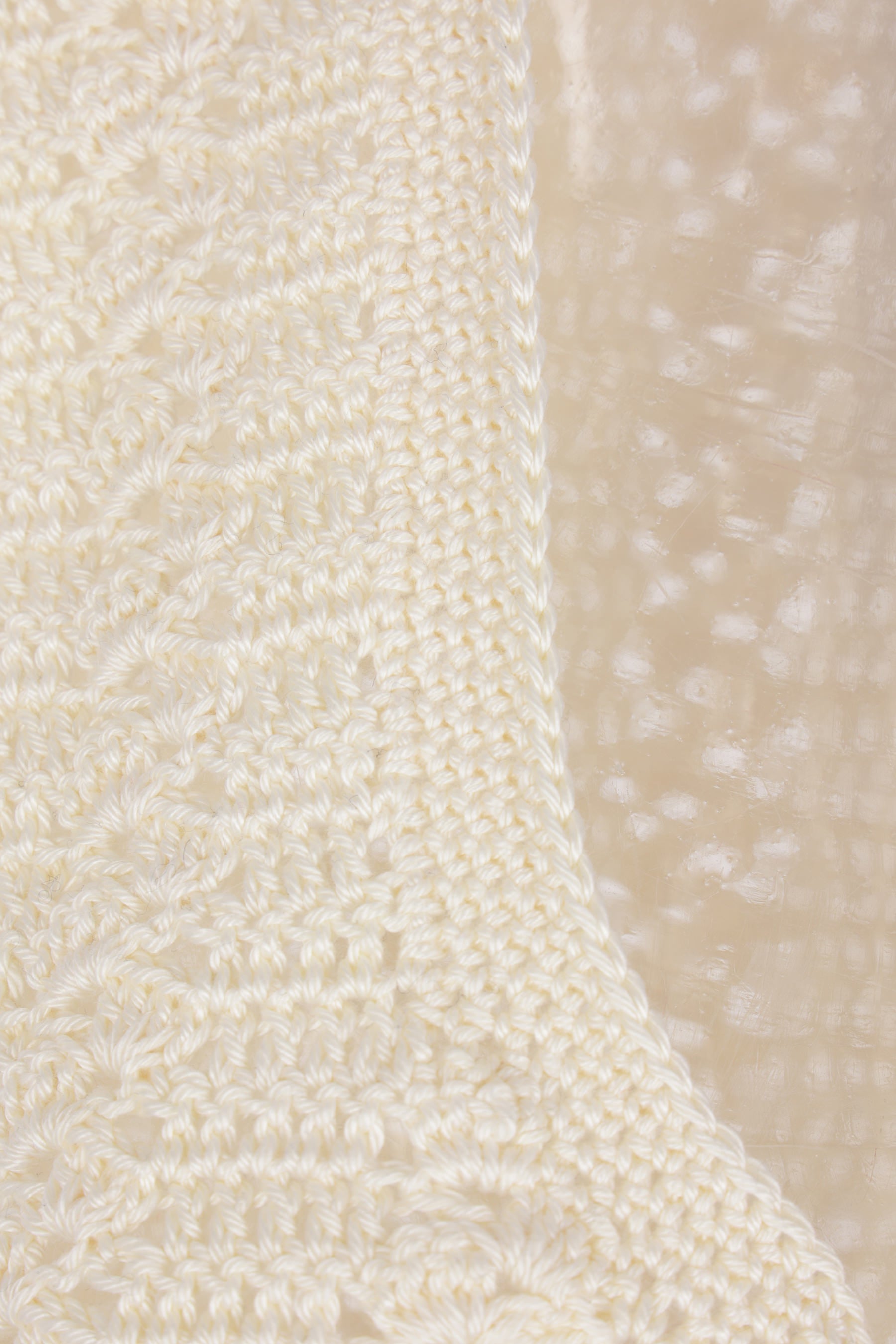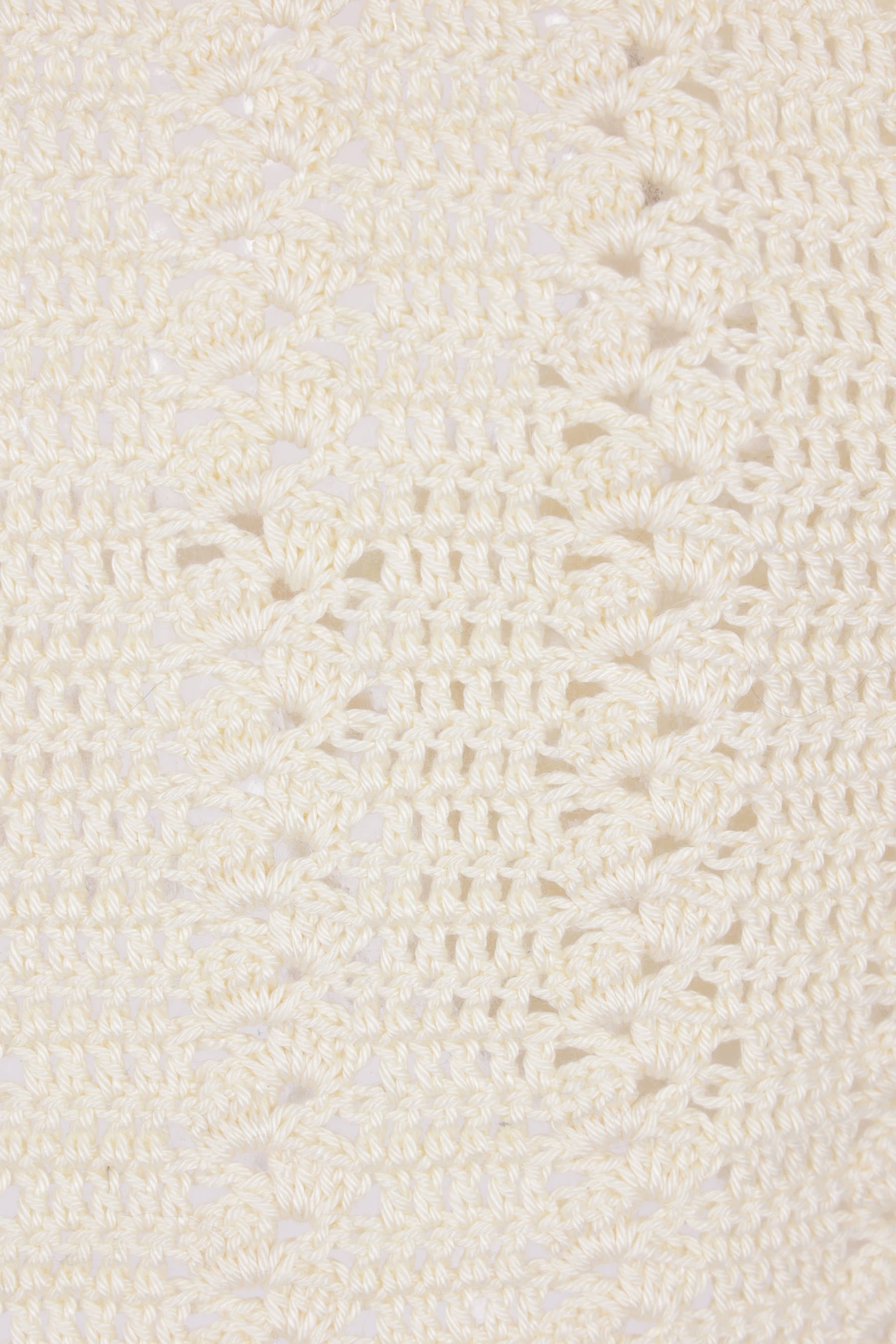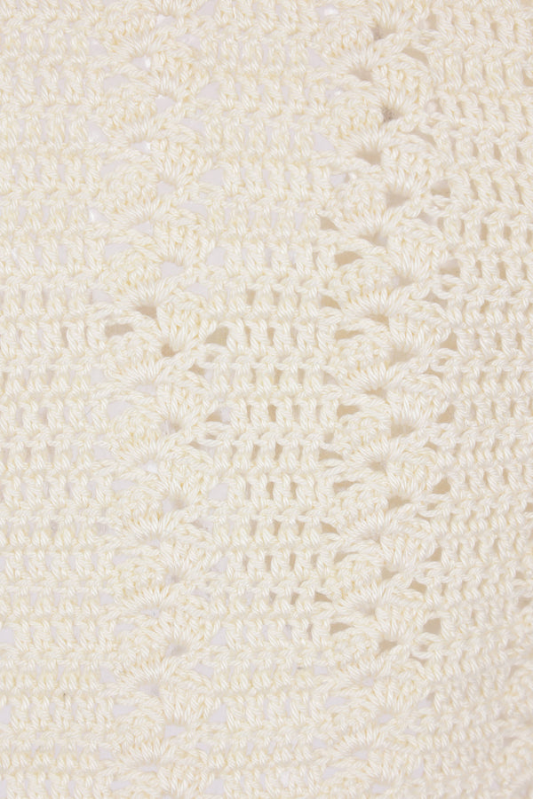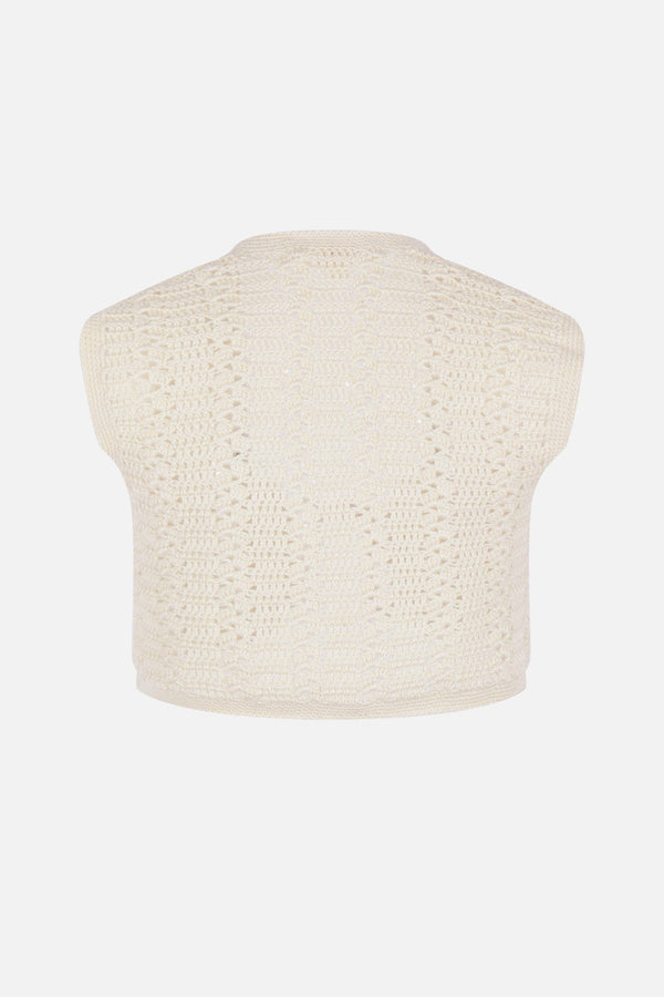 Niccolò Pasqualetti cropped sleeveless top crafted from cream cotton crochet. Featuring a V-neckline, front tie closure adorned with synthetic pearls, and a straight hem.