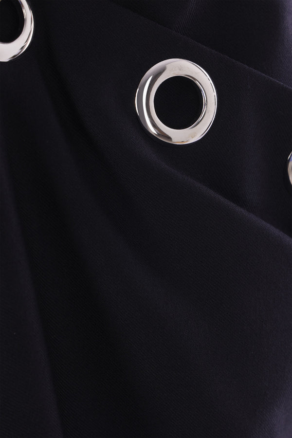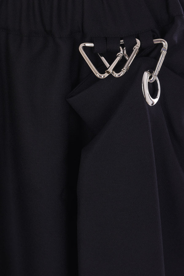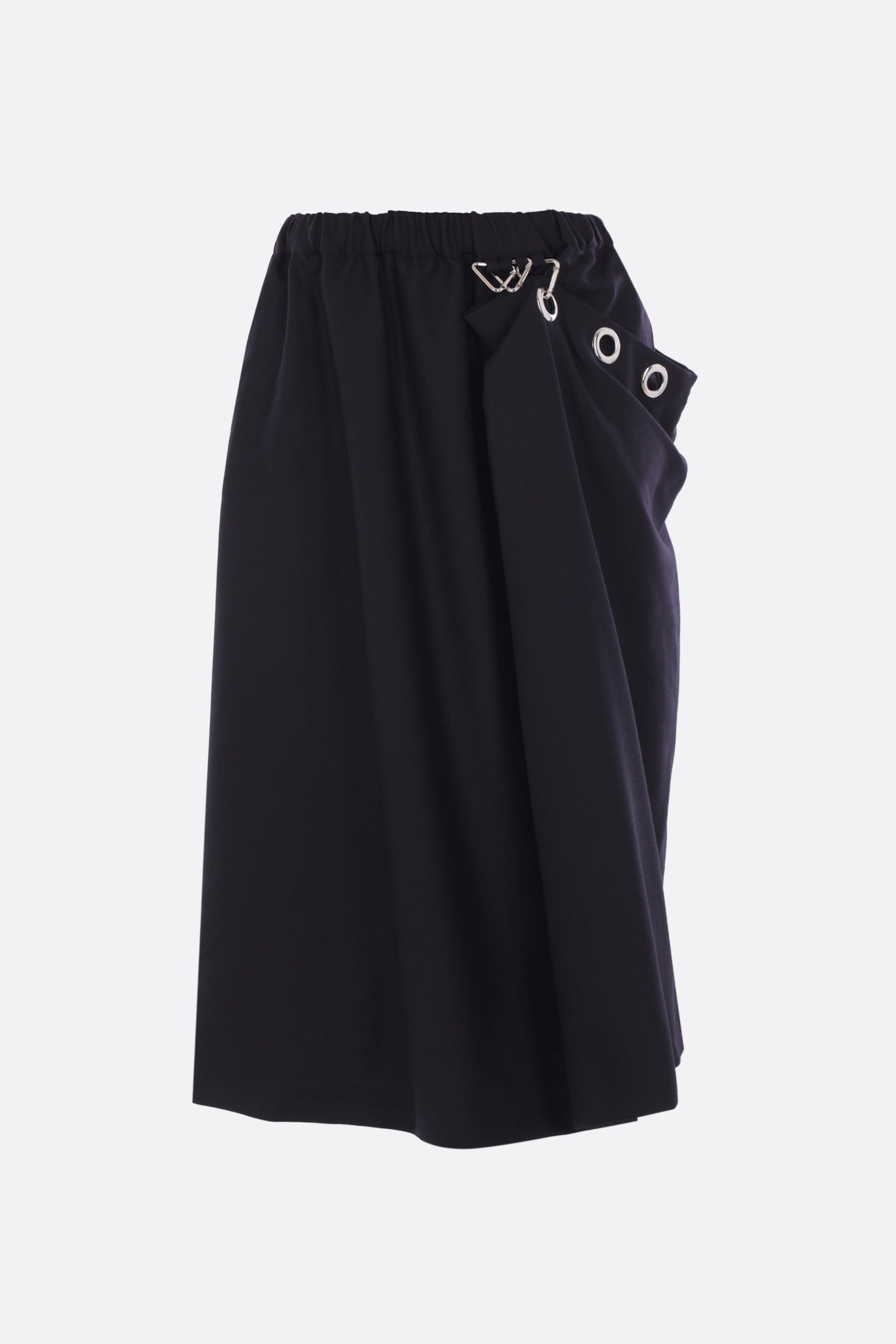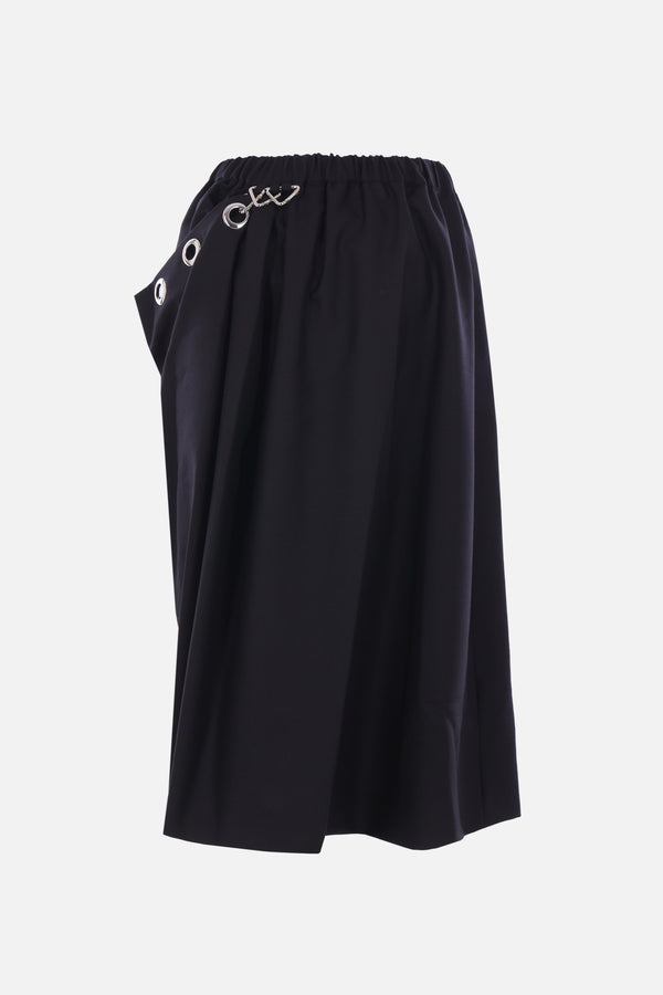 Noir Kei Ninomiya midi skirt made from black wool gabardine. Features elasticated waistband with drawstring, hidden side pockets, side pocket detail with metal eyelets and hooks, and lined interior.