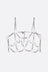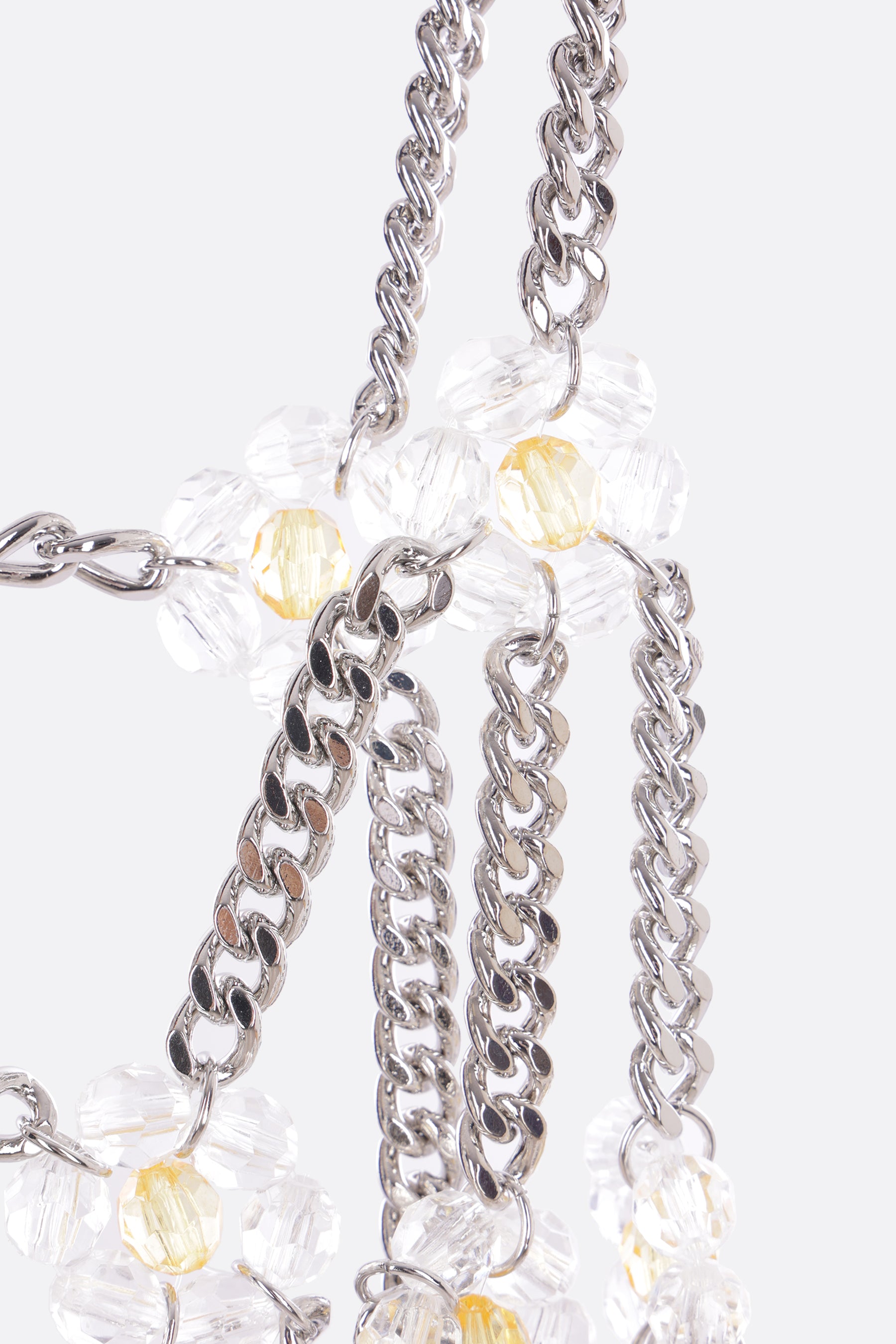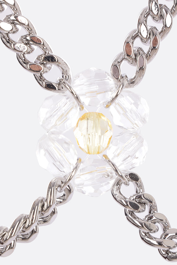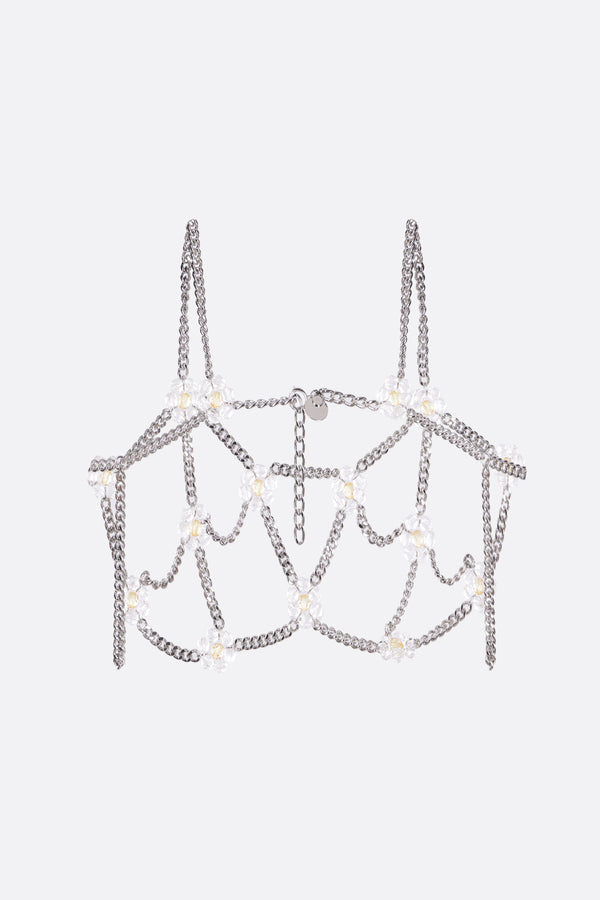 Noir Kei Ninomiya cropped top made from metal chain with diamond pattern and resin floral details. Features adjustable clasp closure at the back.