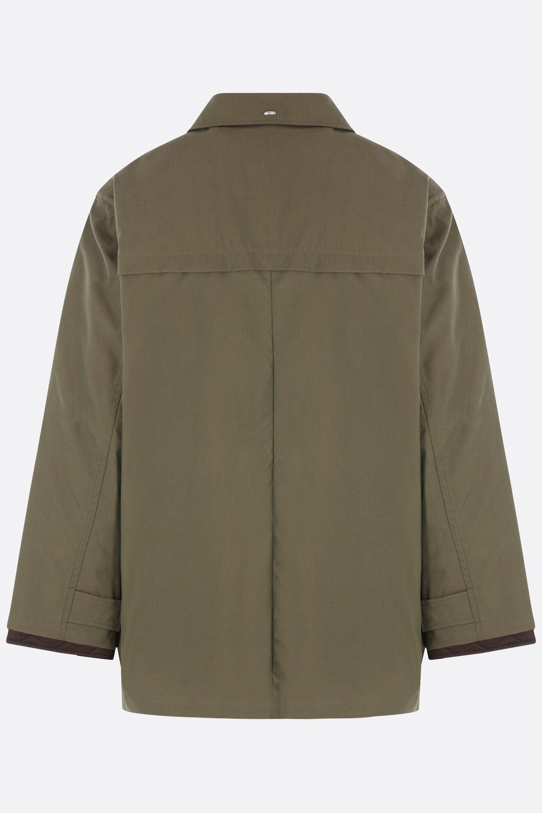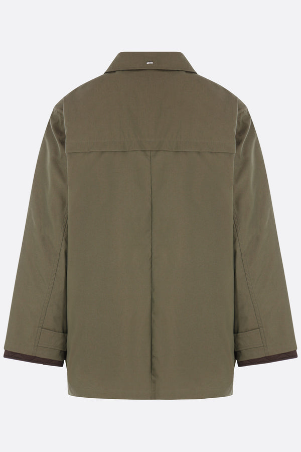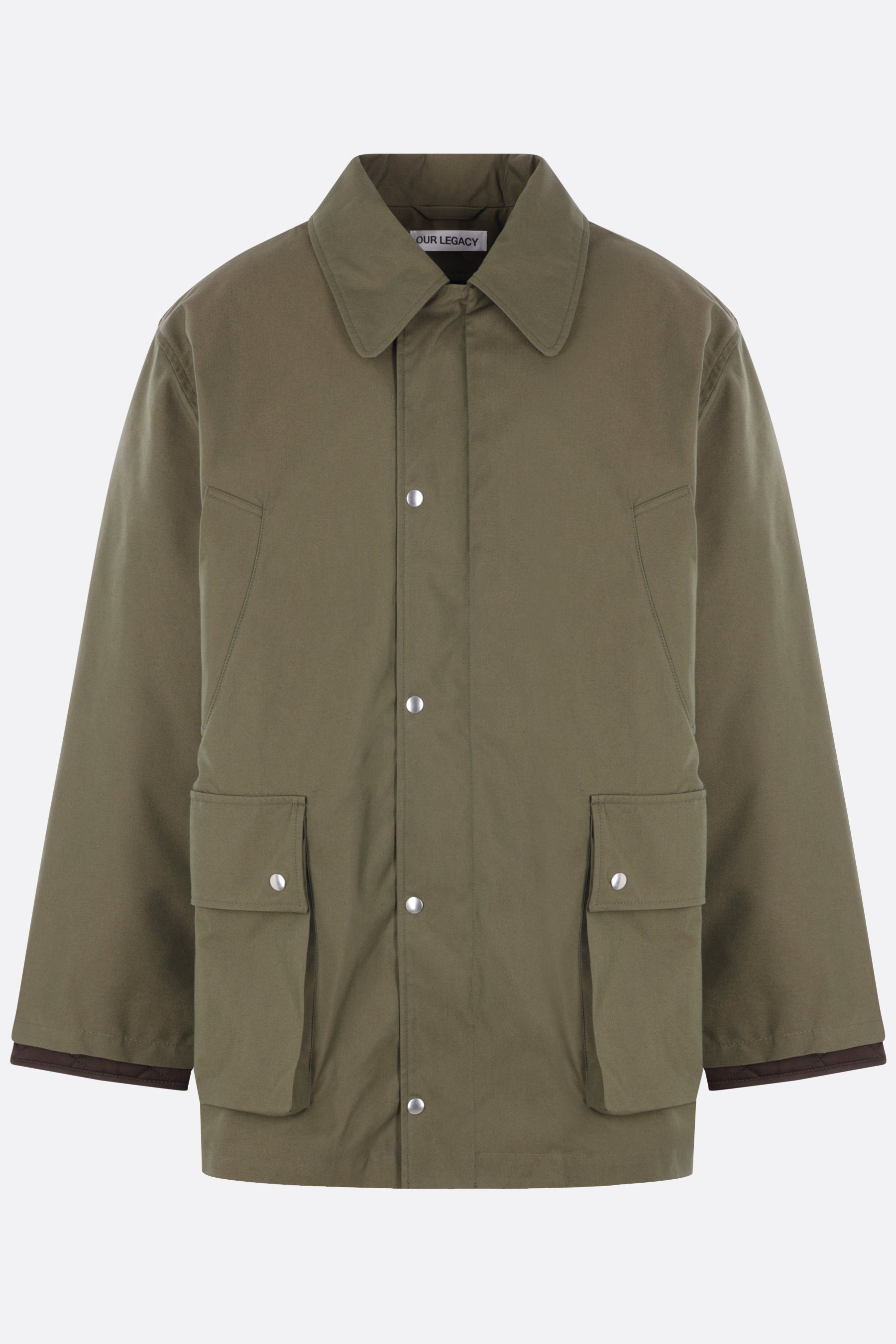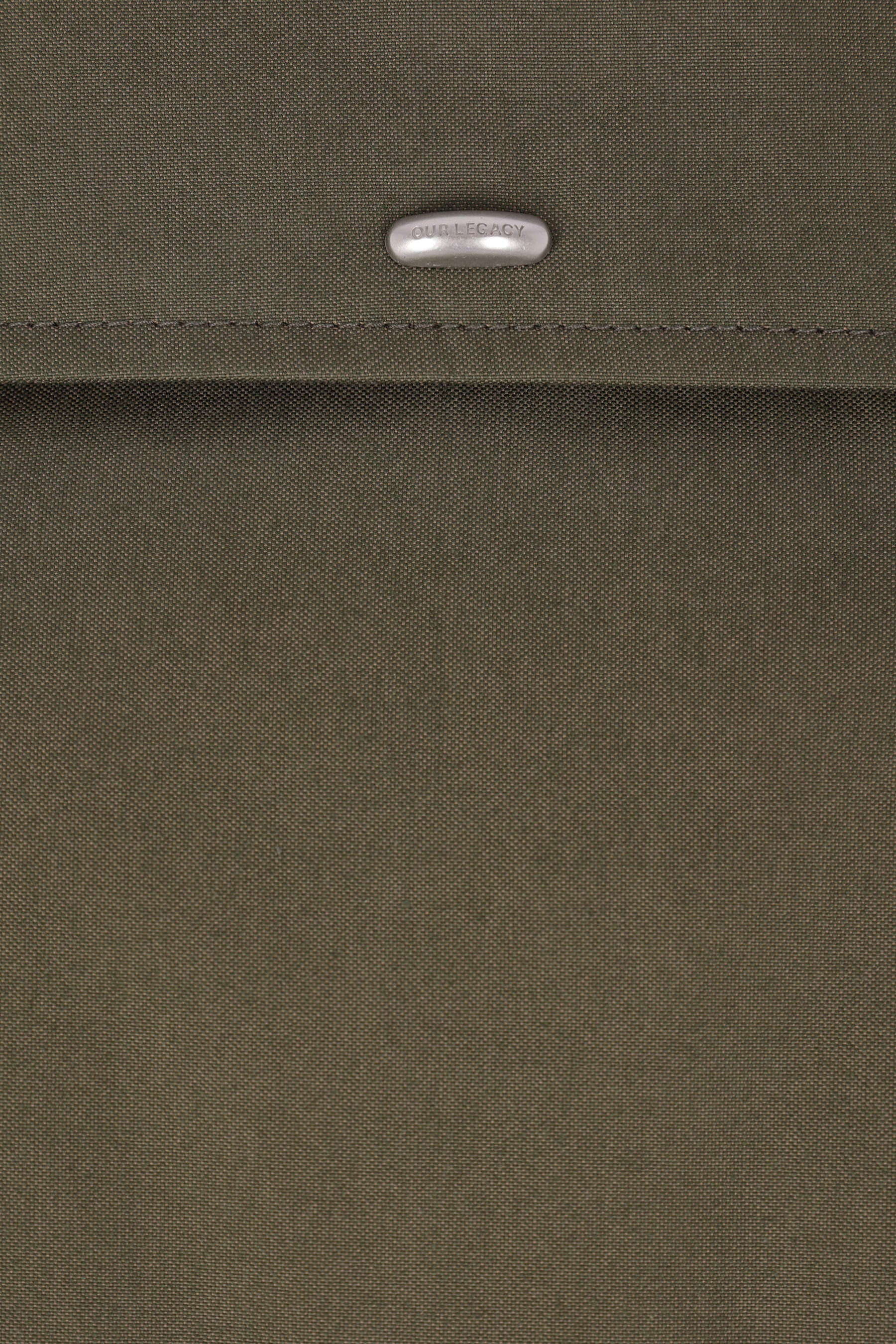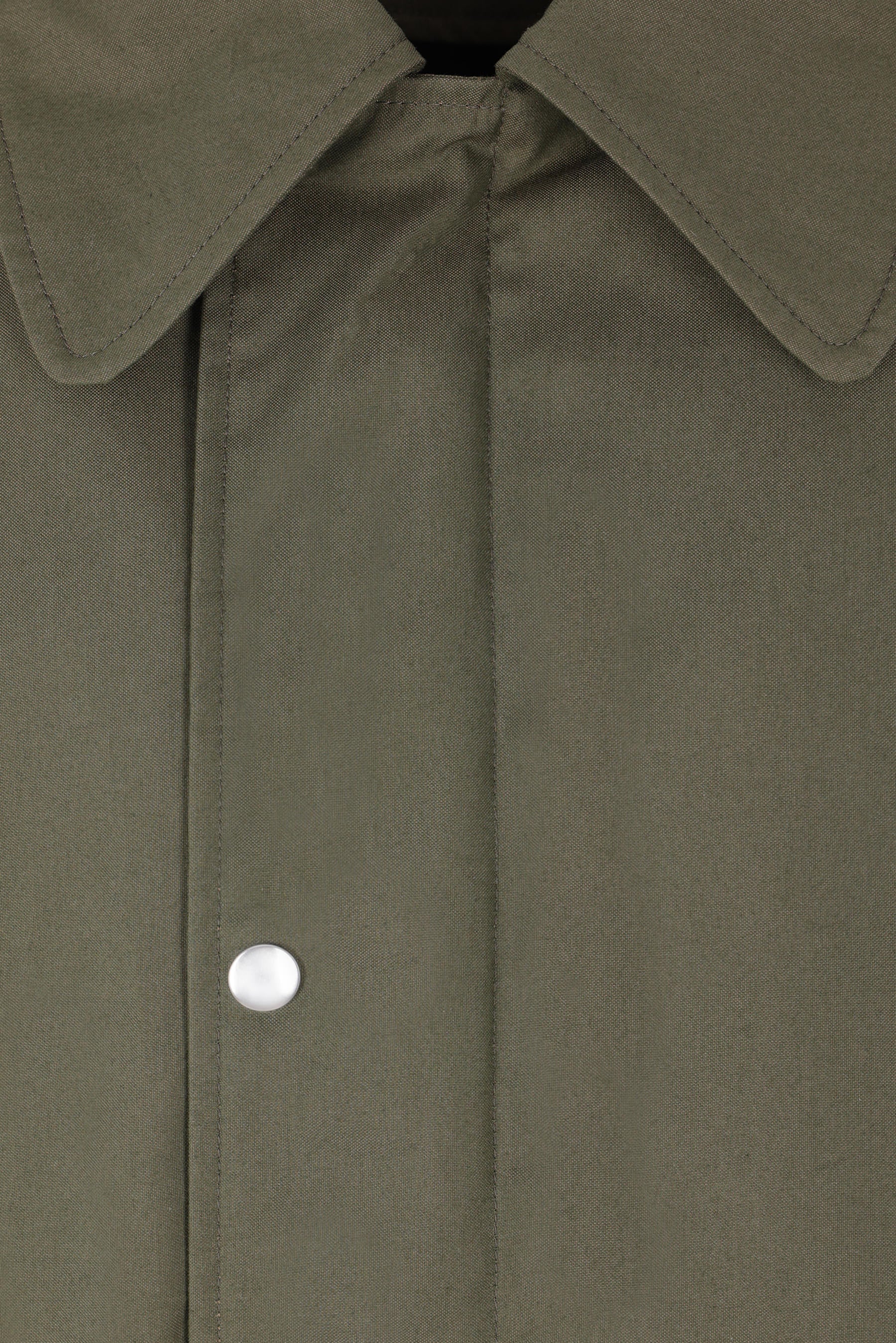 Our Legacy jacket crafted from olive green technical panama. Features a point collar, zip and snap-button closure, multiple pockets, long sleeves with adjustable cuffs, straight hem, and a removable quilted lining.