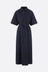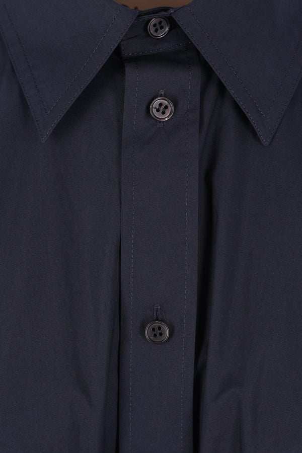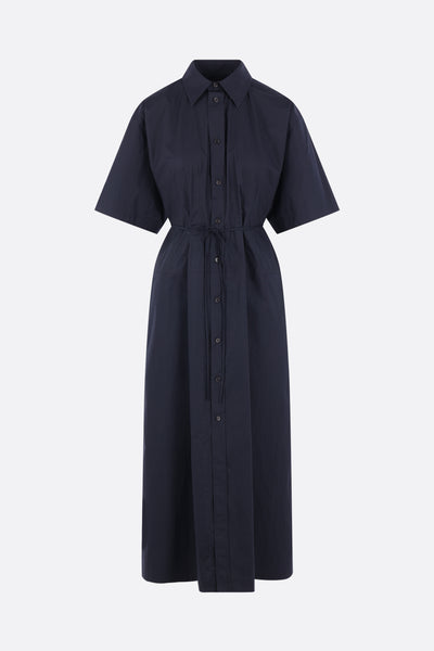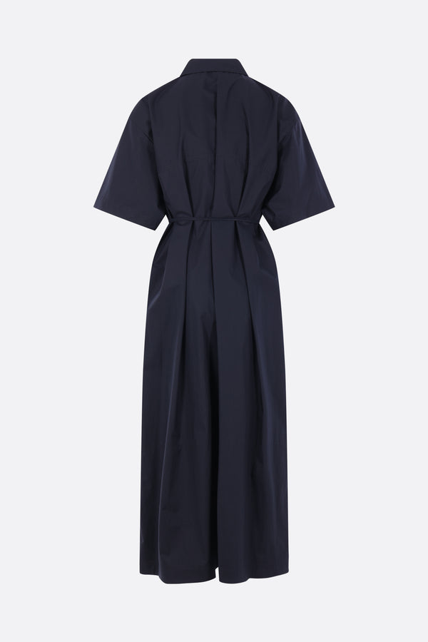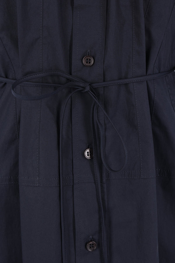 Plan C shirt dress crafted from dark blue technical cotton. Featuring a pointed collar, front button closure, short sleeves, a thin waist tie to knot at the back, invisible side pockets, and an unlined interior.