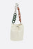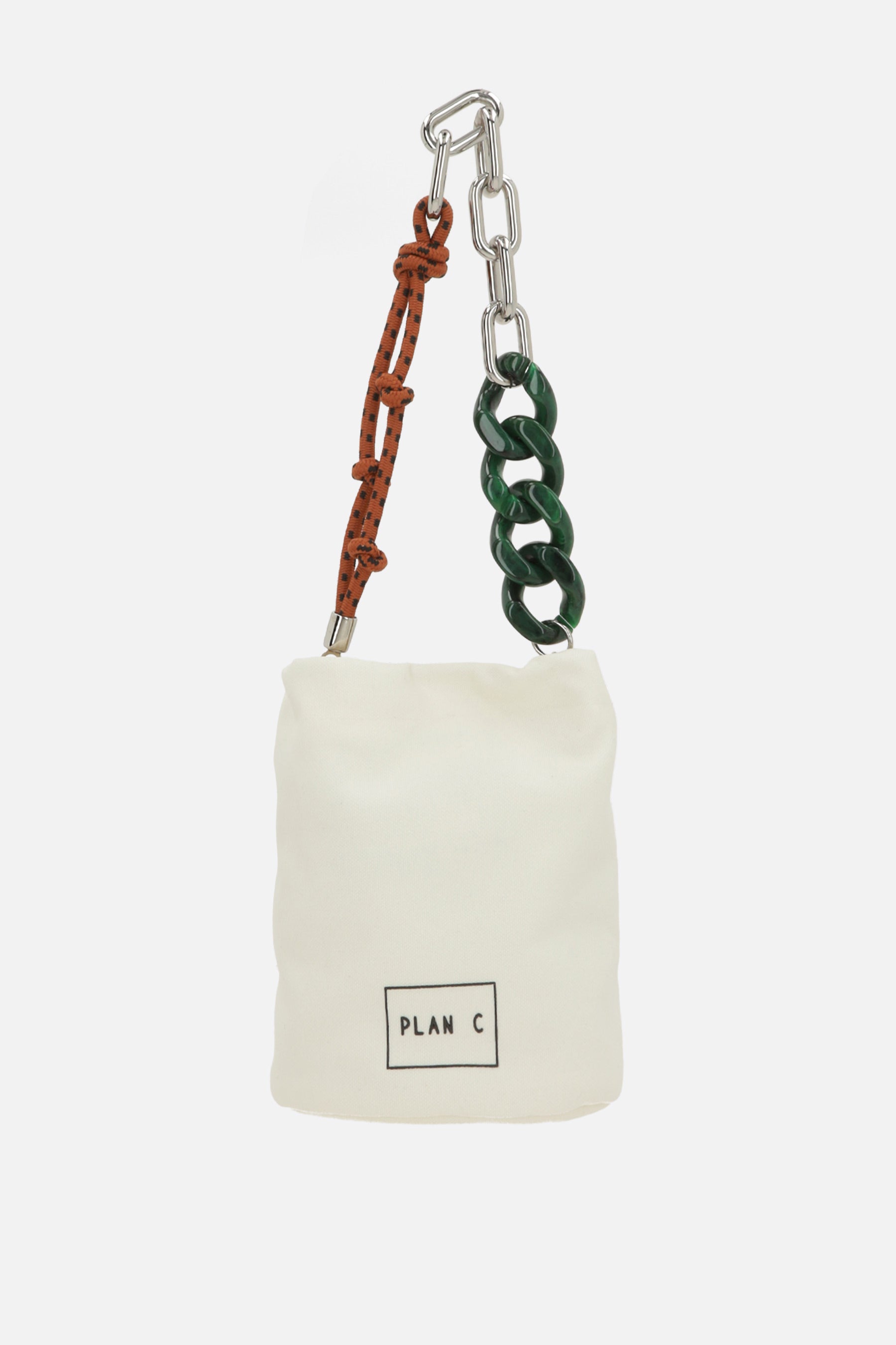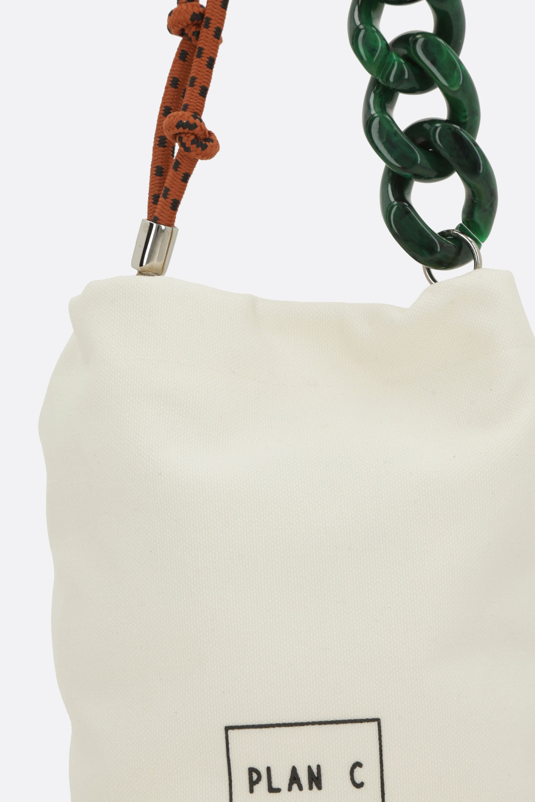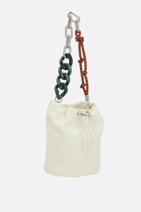 Plan C bucket bag crafted from ivory canvas with a logo print on the back. It features silver-tone hardware, a drawstring closure, and a removable multimaterial chain handle. The interior is lined with tone-on-tone canvas.
