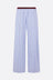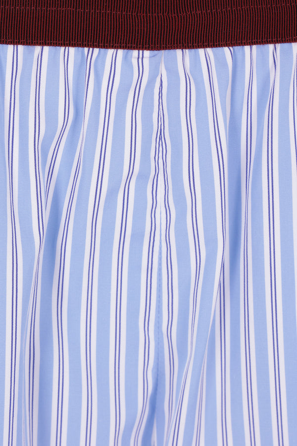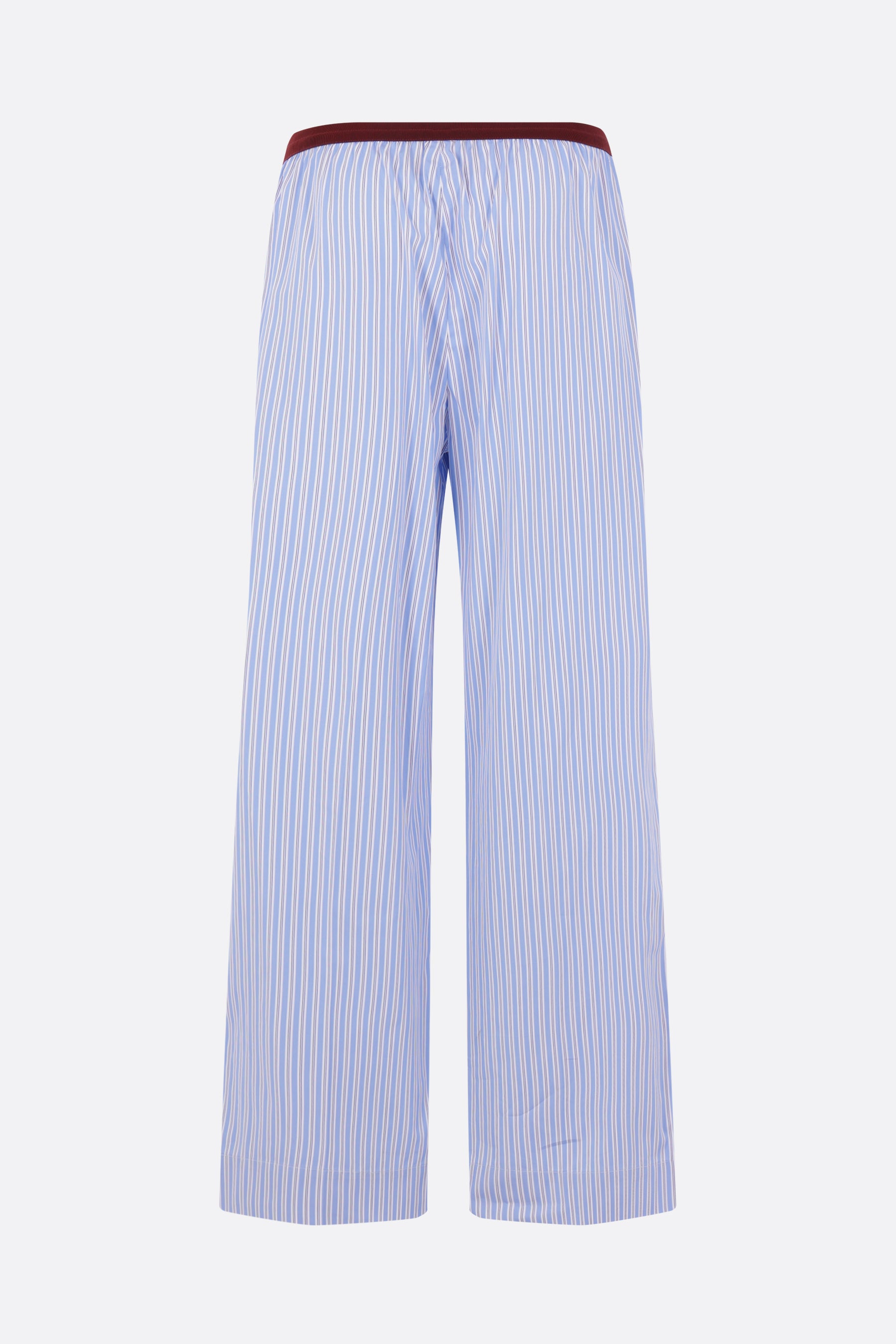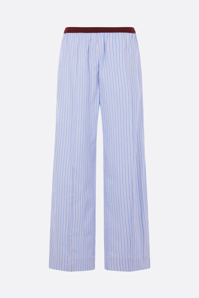 Plan C wide-leg trousers crafted from blue-and-white striped cotton poplin. Featuring a burgundy grosgrain elastic waistband and invisible side pockets.