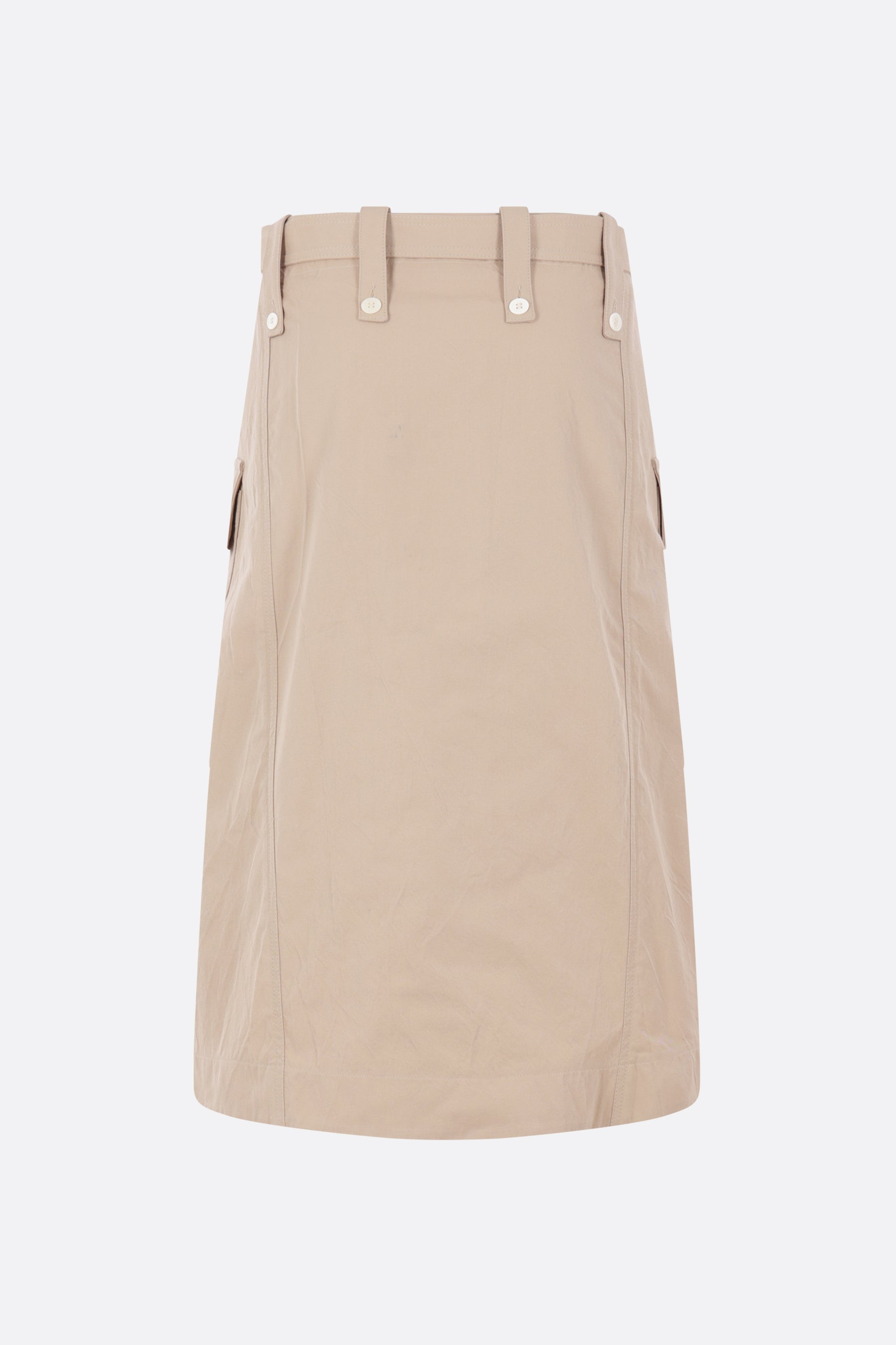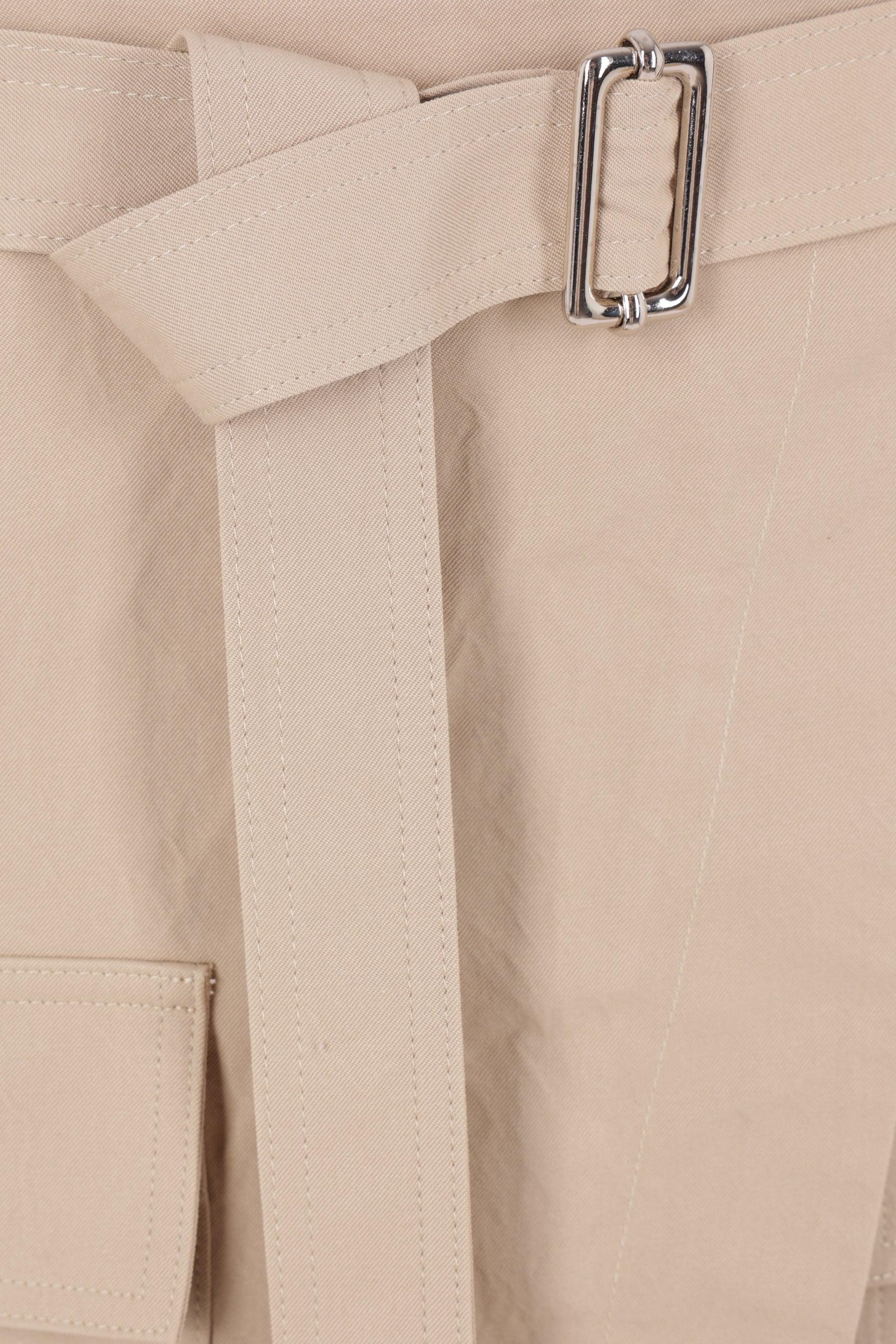 Plan C wrap skirt crafted from sand-colored technical cotton twill. Featuring a buttoned waist closure, matching belt with loops, cargo pockets, and a straight hem.