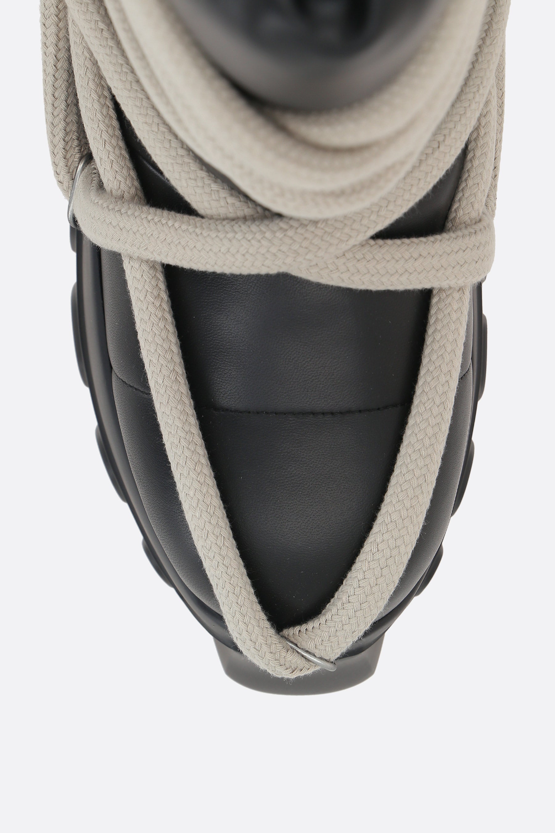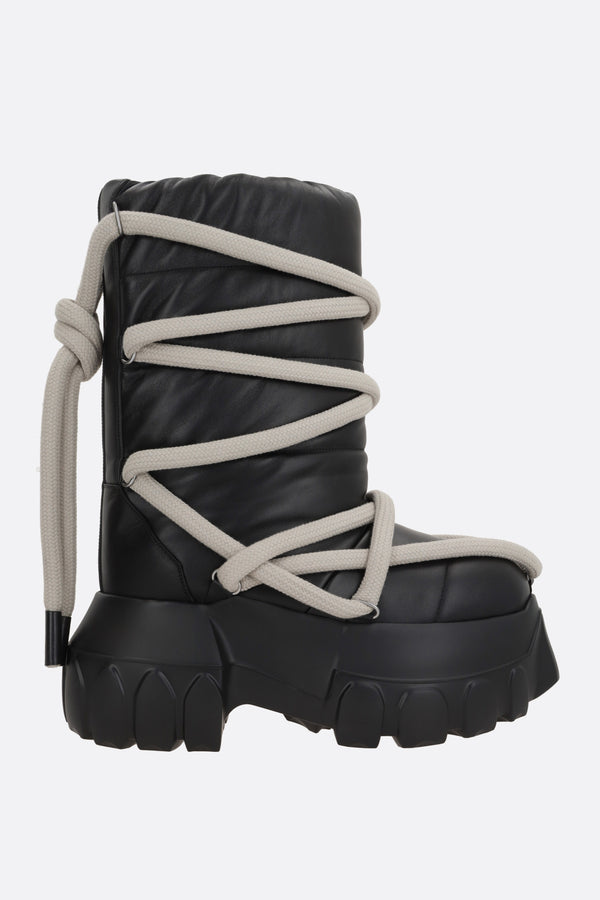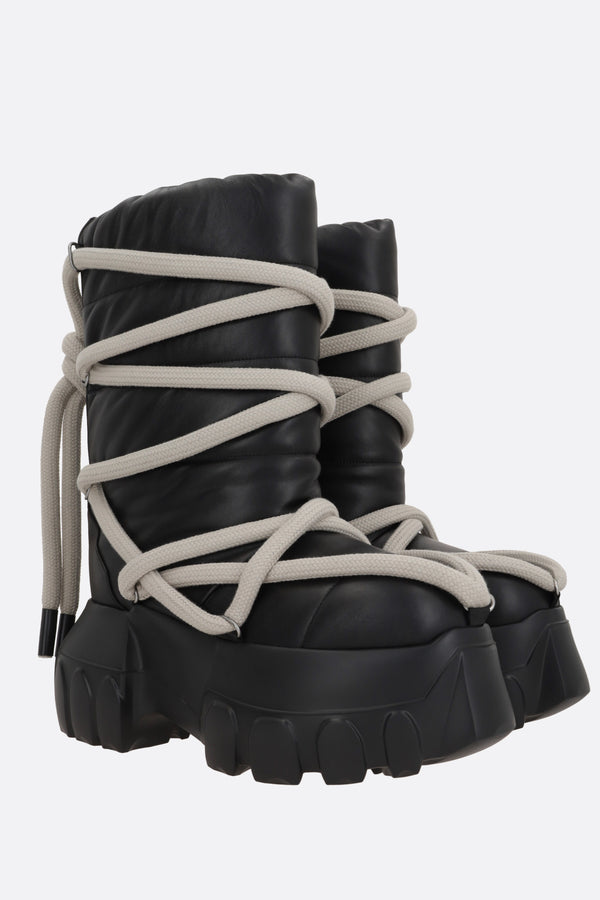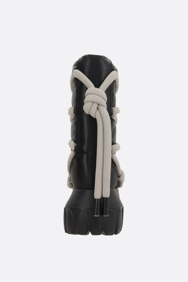 Rick Owens boots crafted from black quilted padded leather. Featuring oversized laces, round toe, fabric/leather lining, and a double-height mega tractor sole.