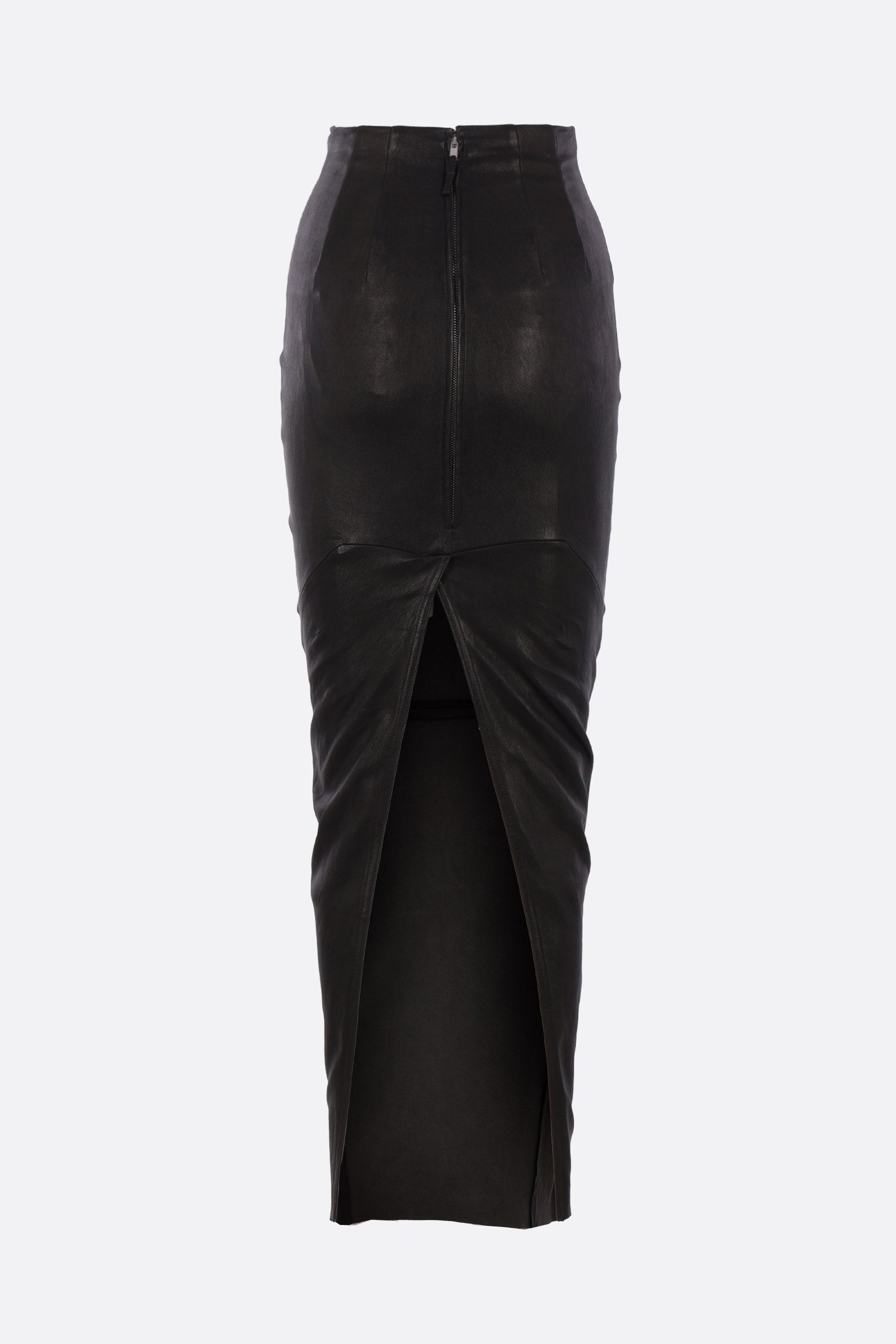 Rick Owens long skirt crafted from black leather. Featuring a rear zip closure, central back slit, stretch cotton lining, and a raw-cut hem.