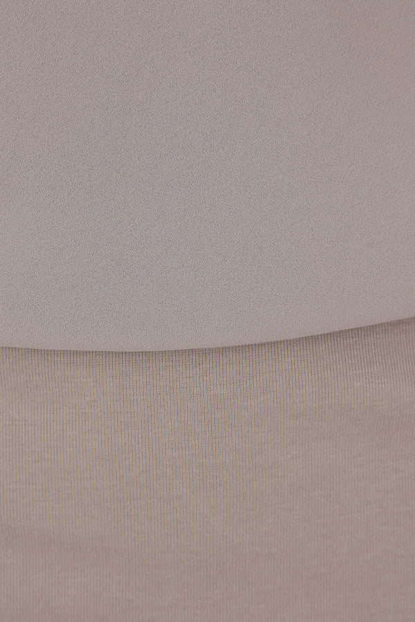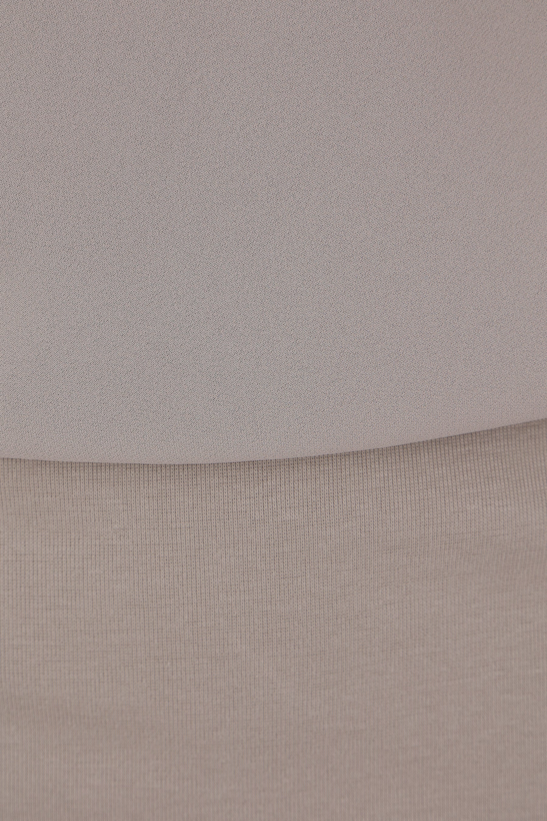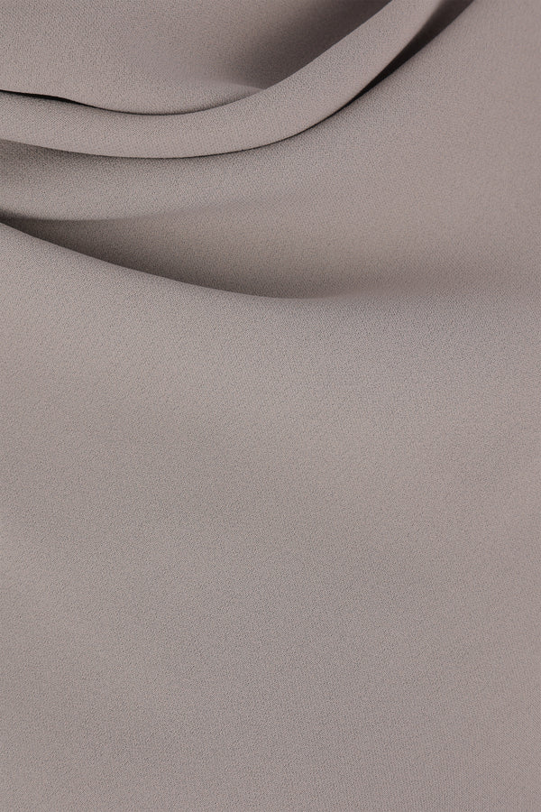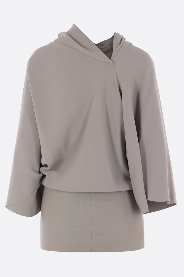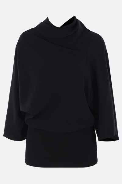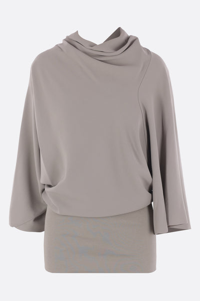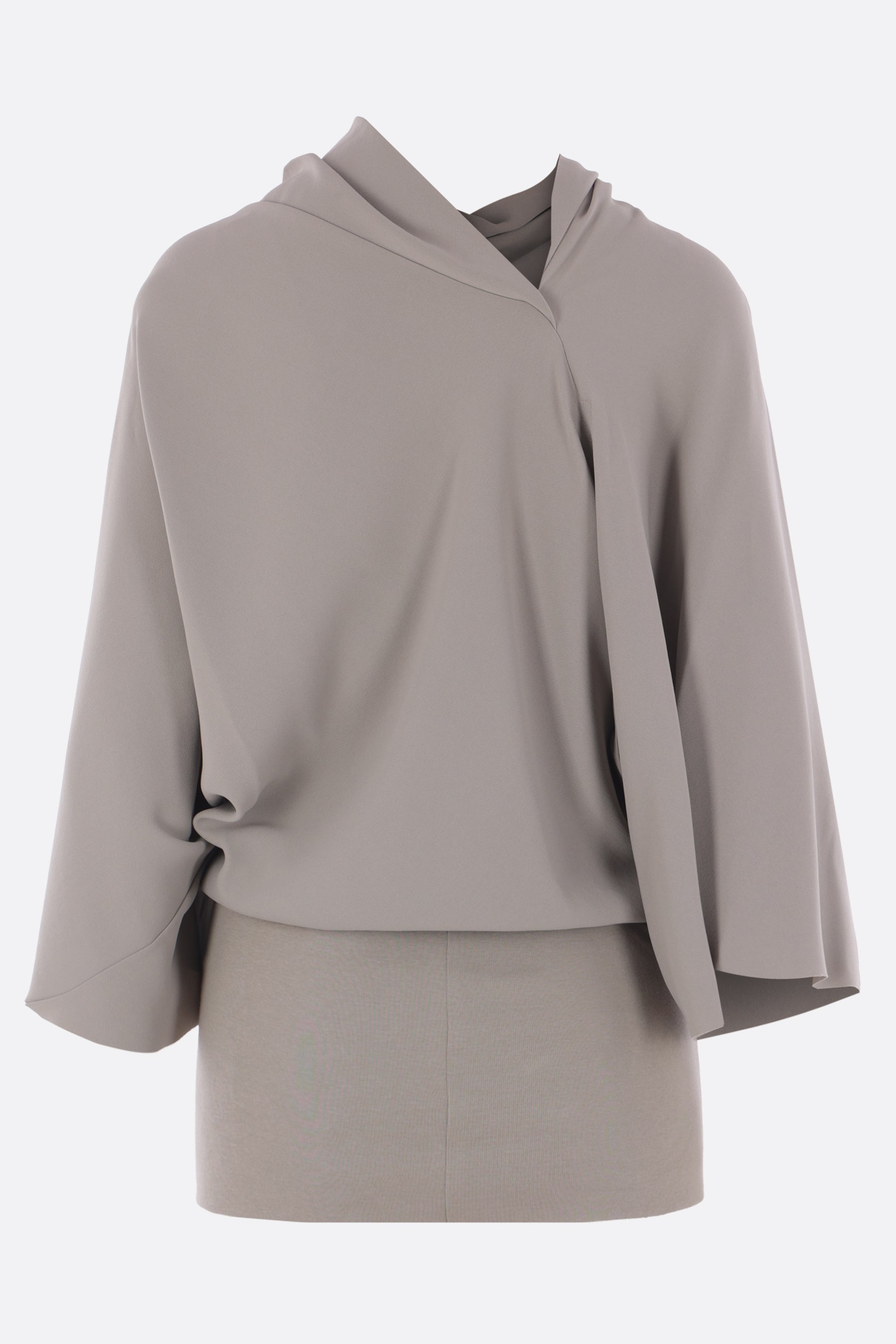 Rick Owens top made from pearl grey crepe. Features a draped neckline with an asymmetric detail at the back, elbow-lenght wide sleeves with raw edges, and a straight jersey hem.