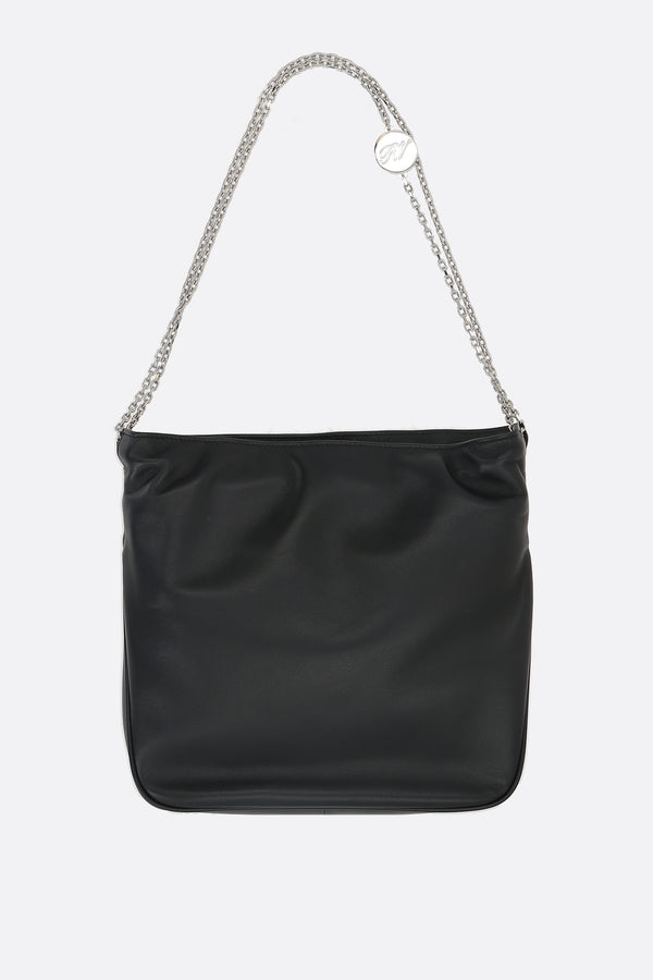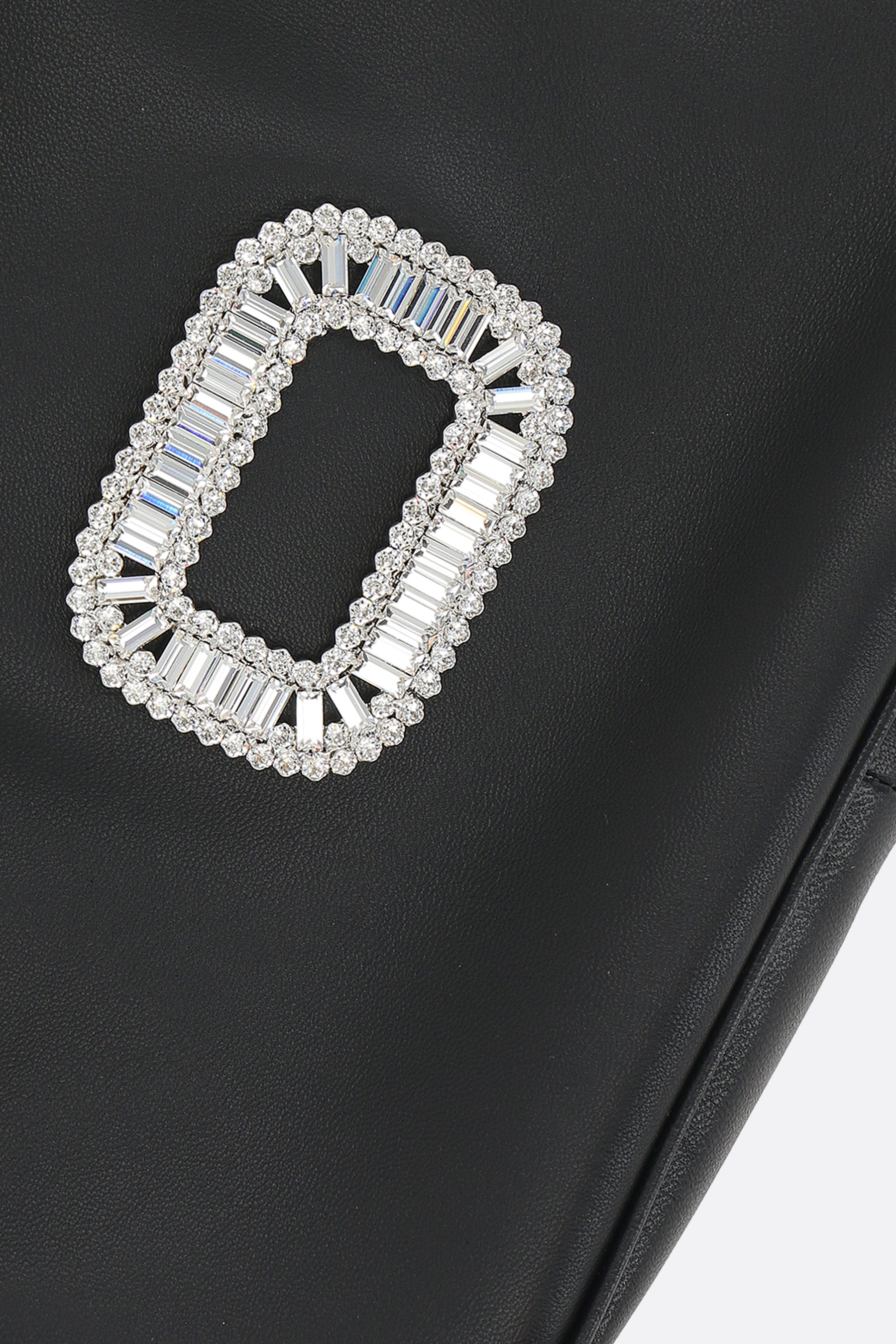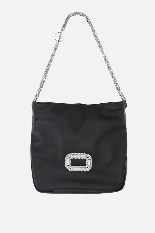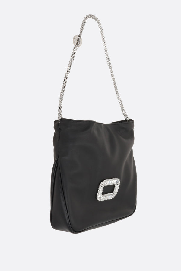 Roger Vivier shoulder bag crafted from black nappa leather, featuring a Pilgrim buckle adorned with baguette-cut crystals. Designed with silver-tone hardware, a double metal chain strap with RV charm, and a pink satin-lined interior with a card slot.