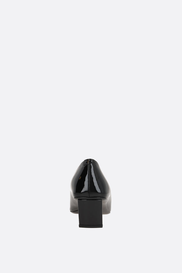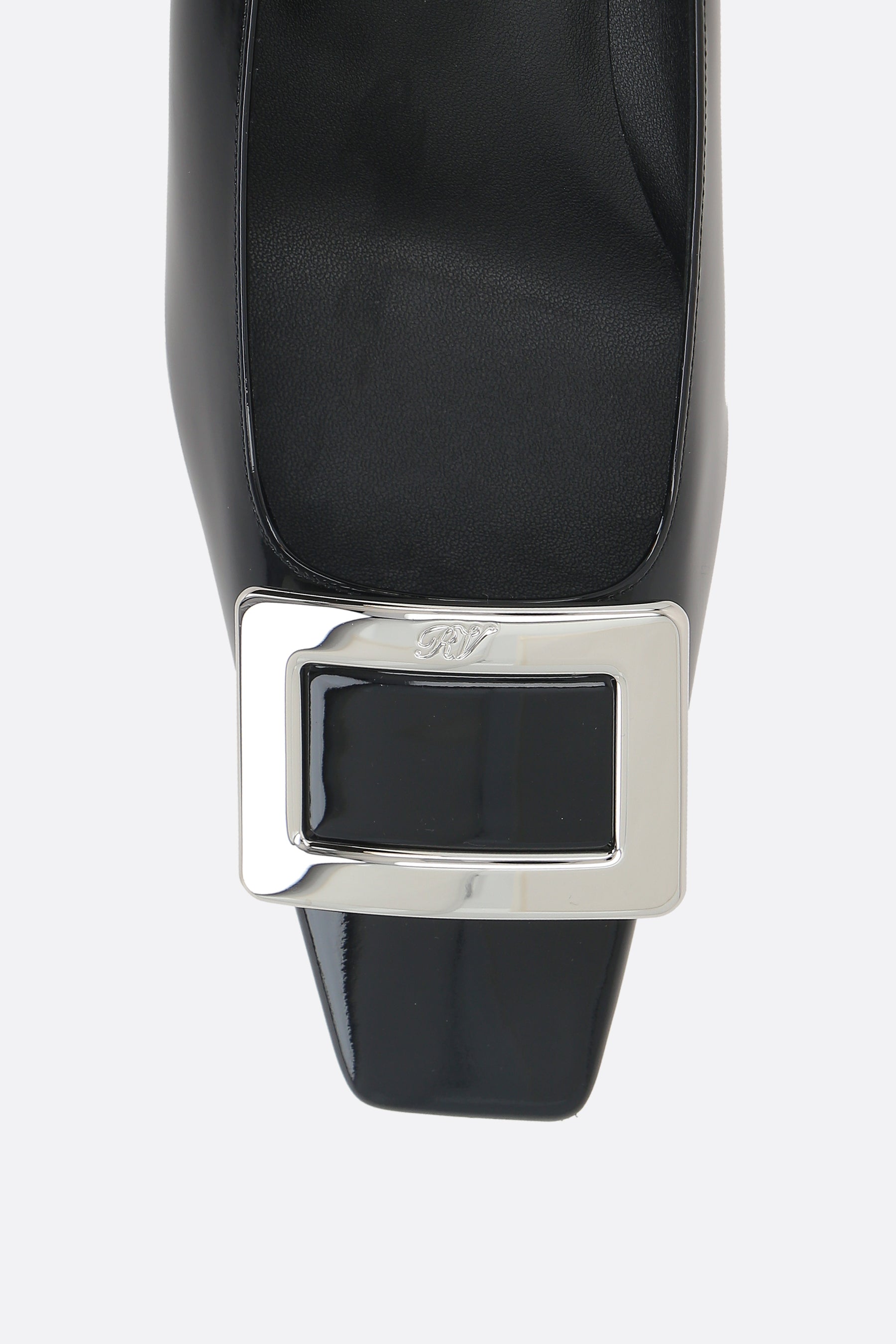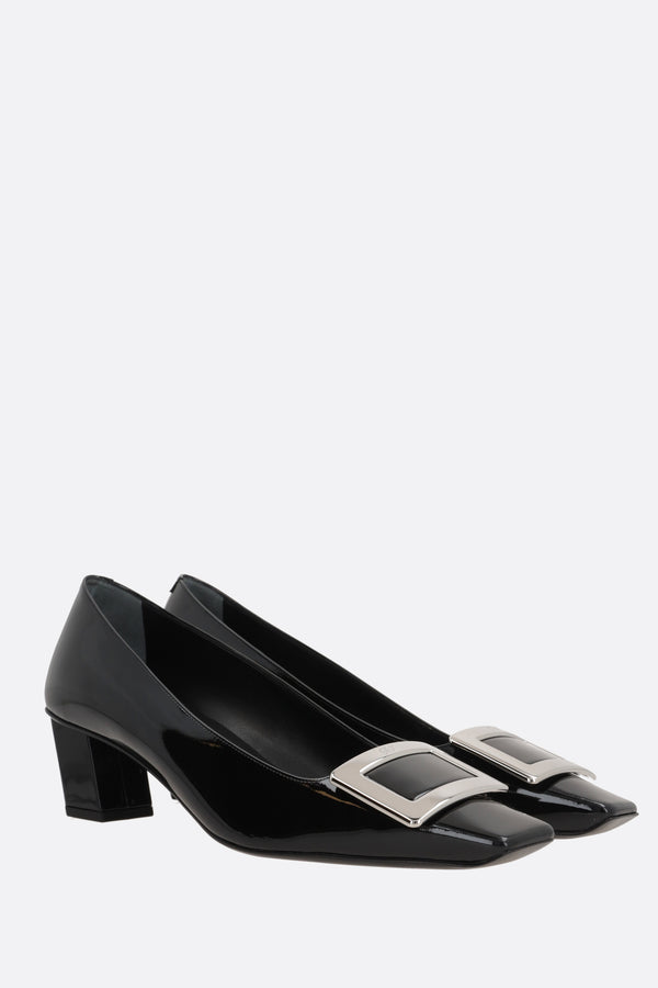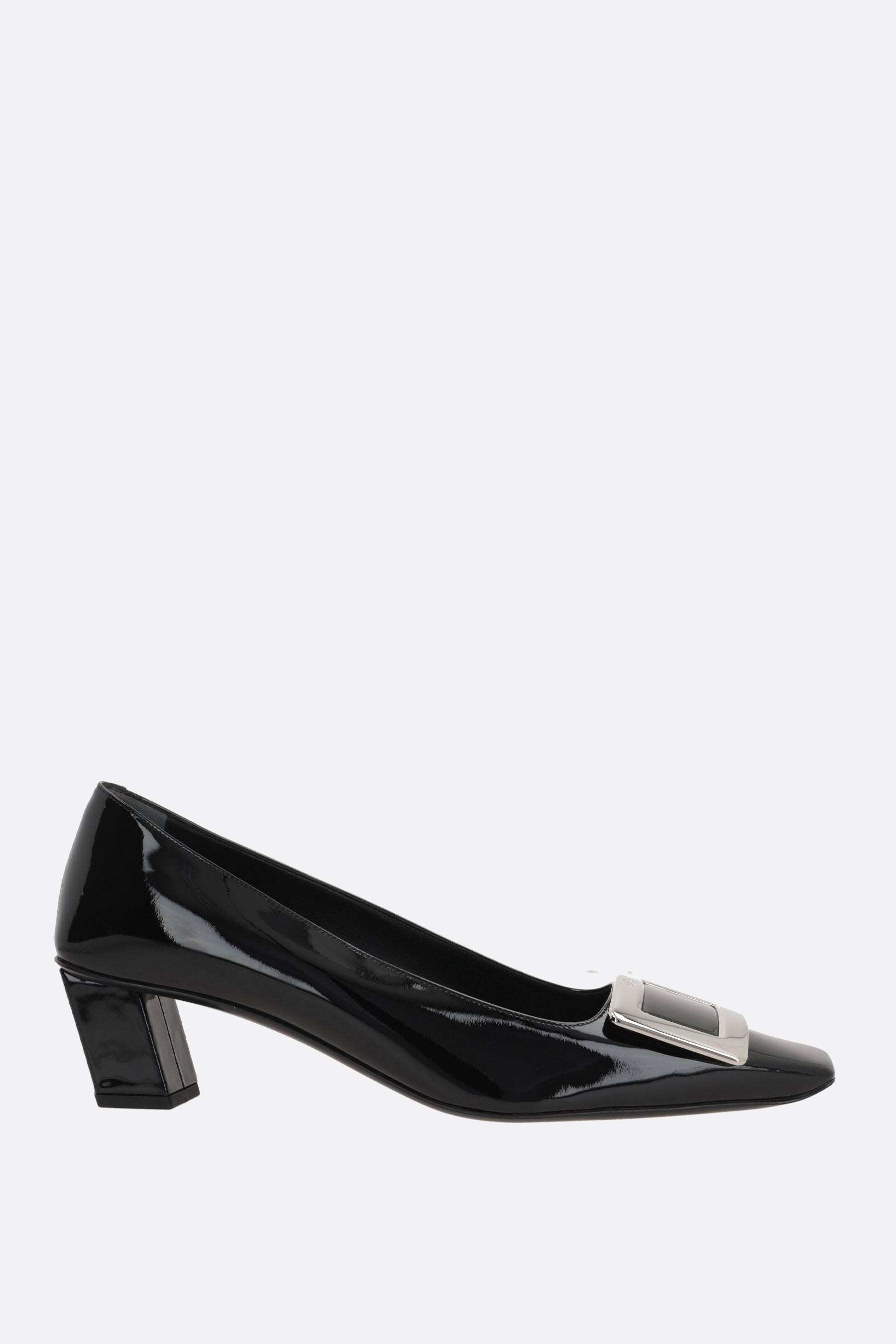 Roger Vivier pumps crafted in black patent leather, featuring the iconic metal buckle. Designed with a square toe, leather lining, and leather sole. The look is completed by the signature covered Skyscraper heel.