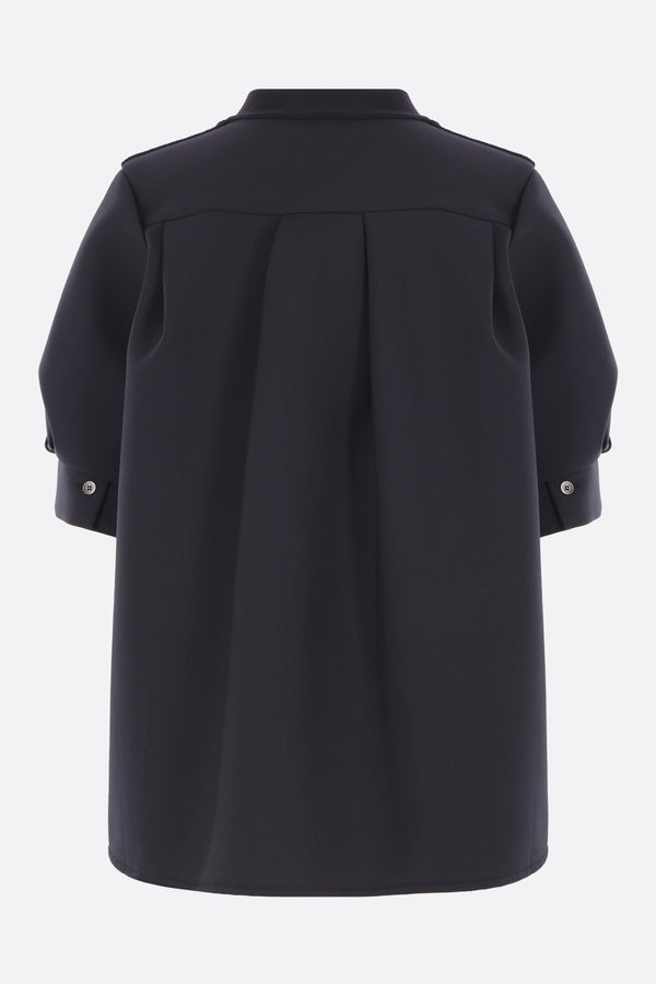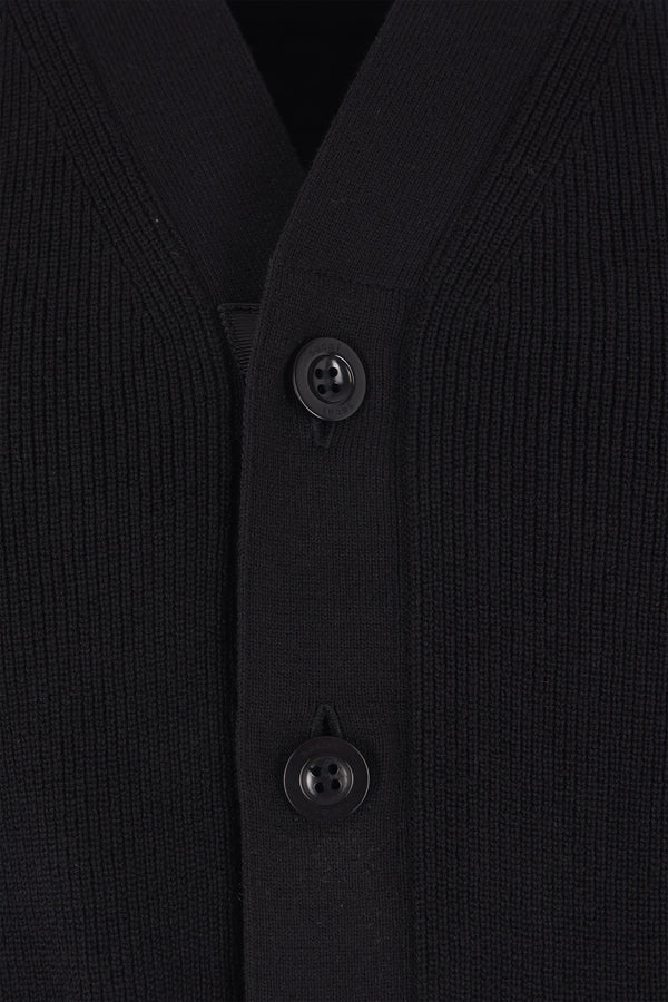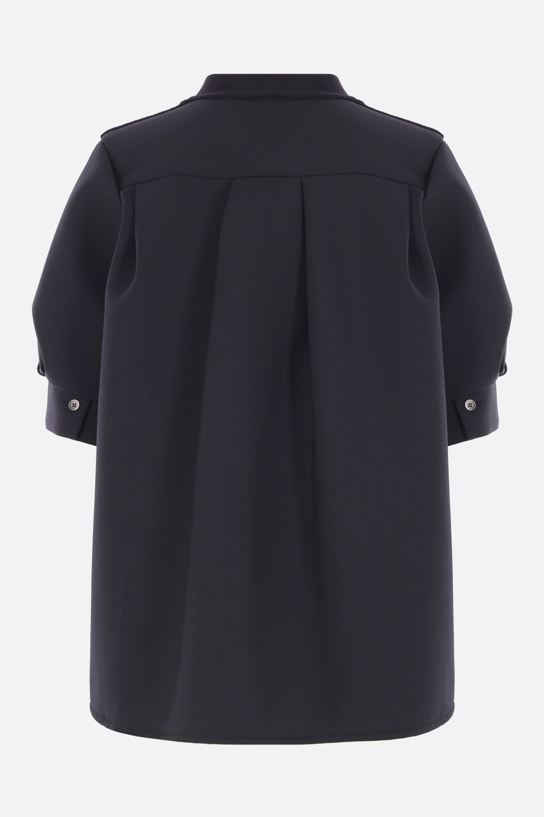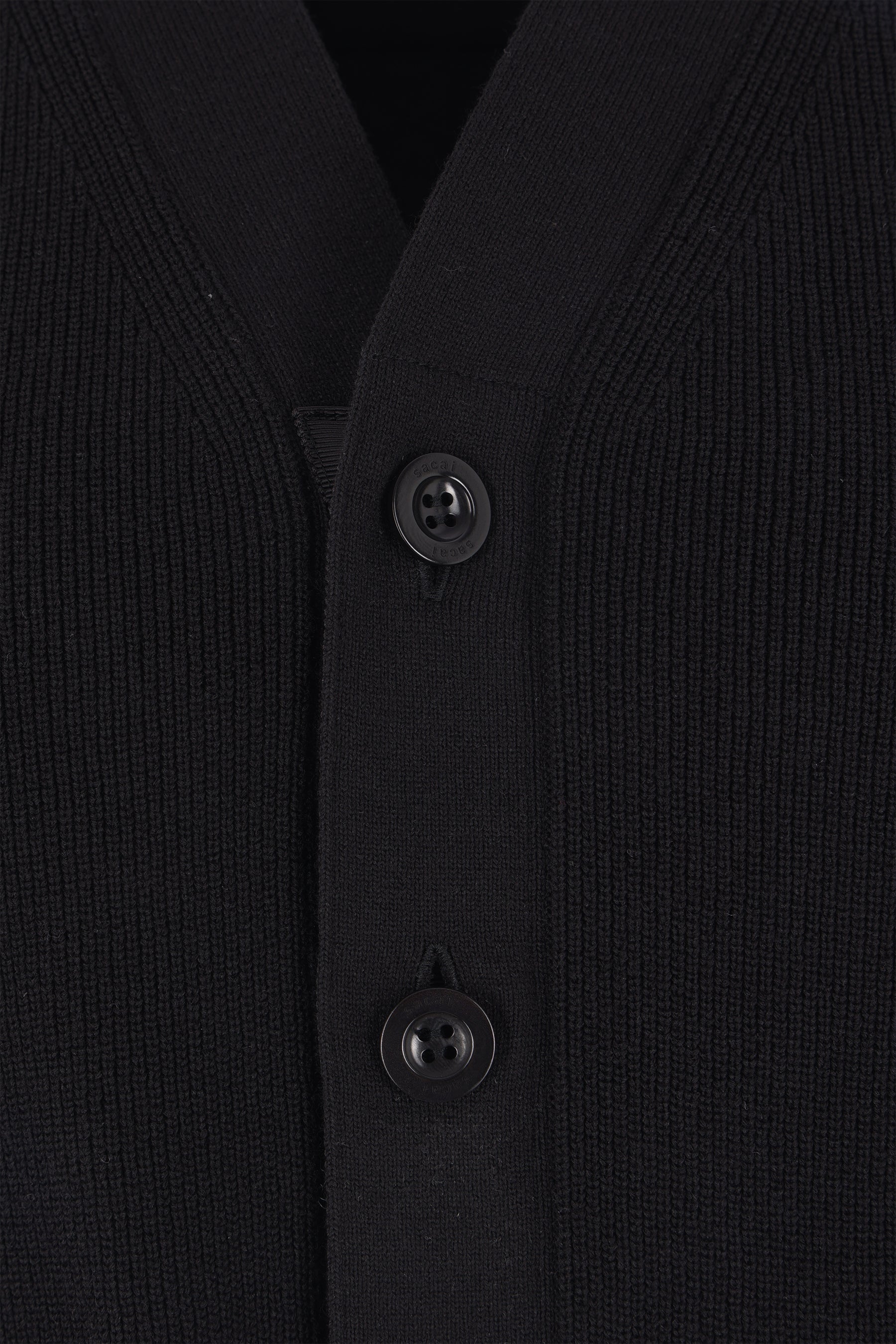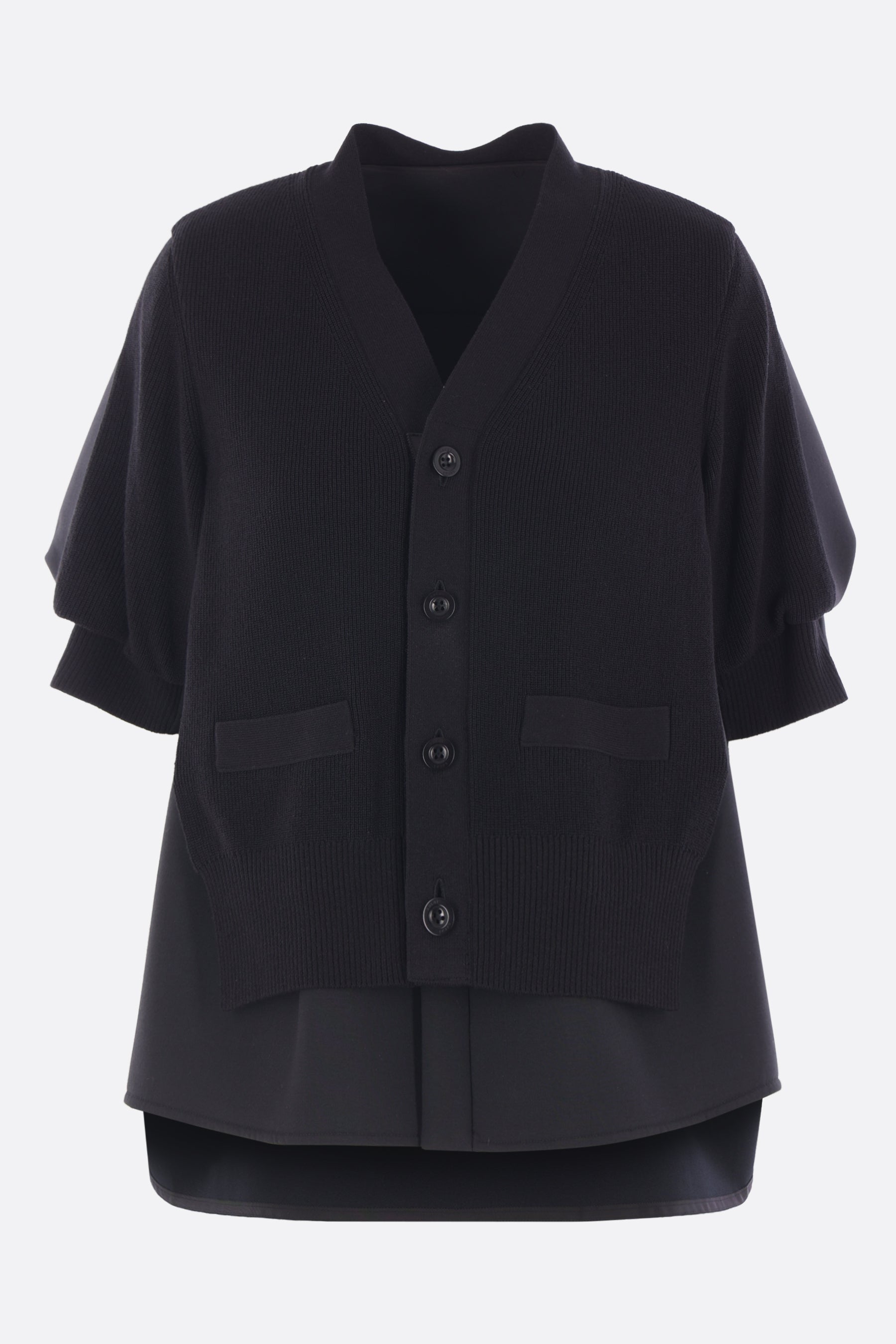 Sacai deconstructed cardigan crafted from black cotton-blend knit and neoprene. Featuring a V-neckline, front button closure, welt pockets, short sleeves with buttoned cuffs, pleated detail at the back, and a rounded hem.