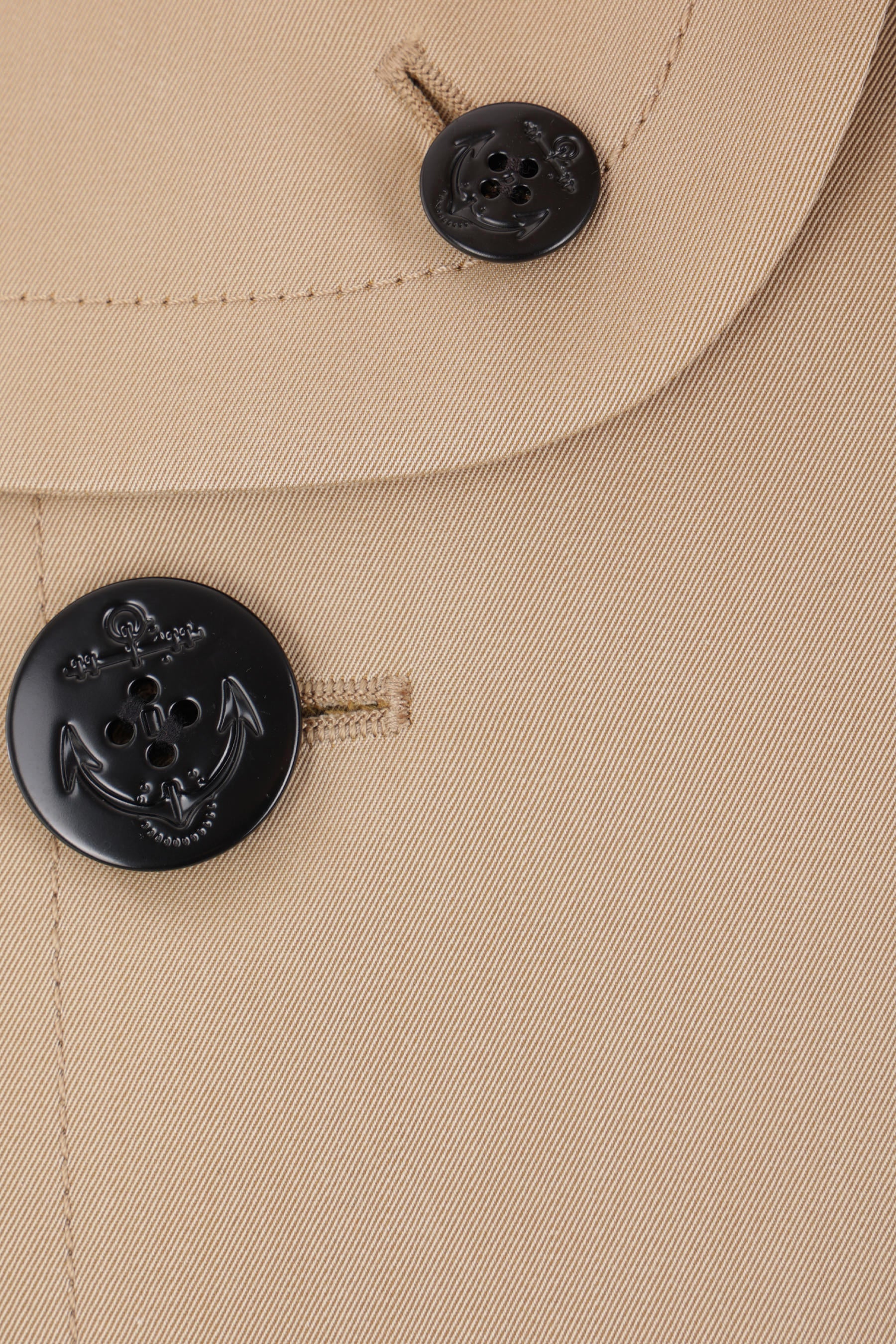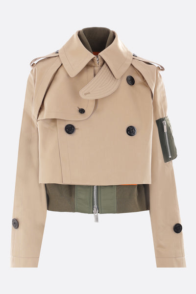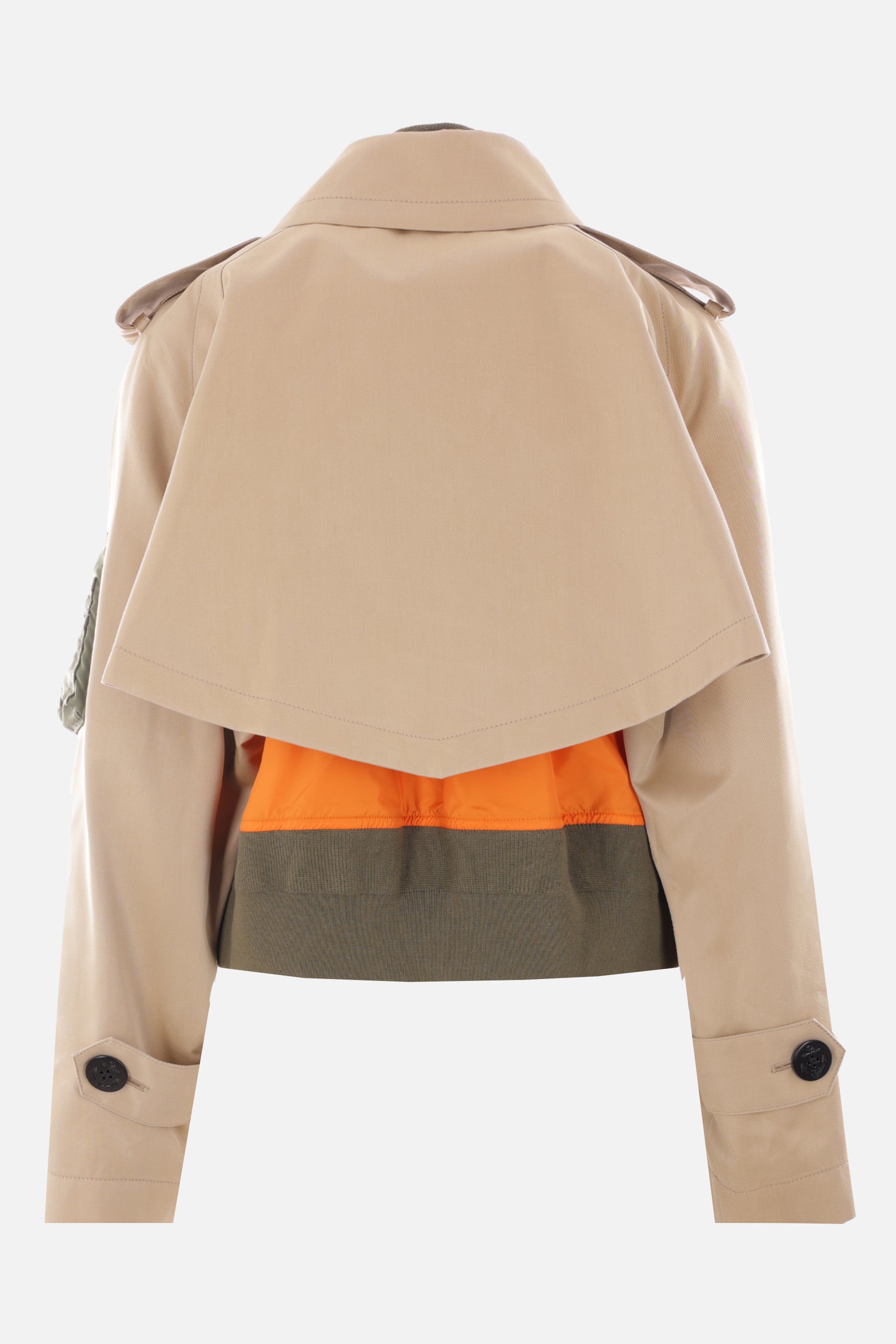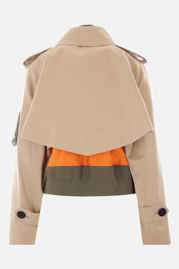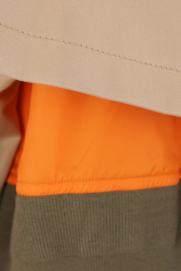 Sacai double-breasted trench coat crafted in beige technical cotton gabardine. It features pointed collar, button closure, multiple pockets, long sleeves and button tab at shoulders / at cuffs. The design is completed by an internal sleeveless bomber jacket in orange nylon with contrasting ribbed knit edges.