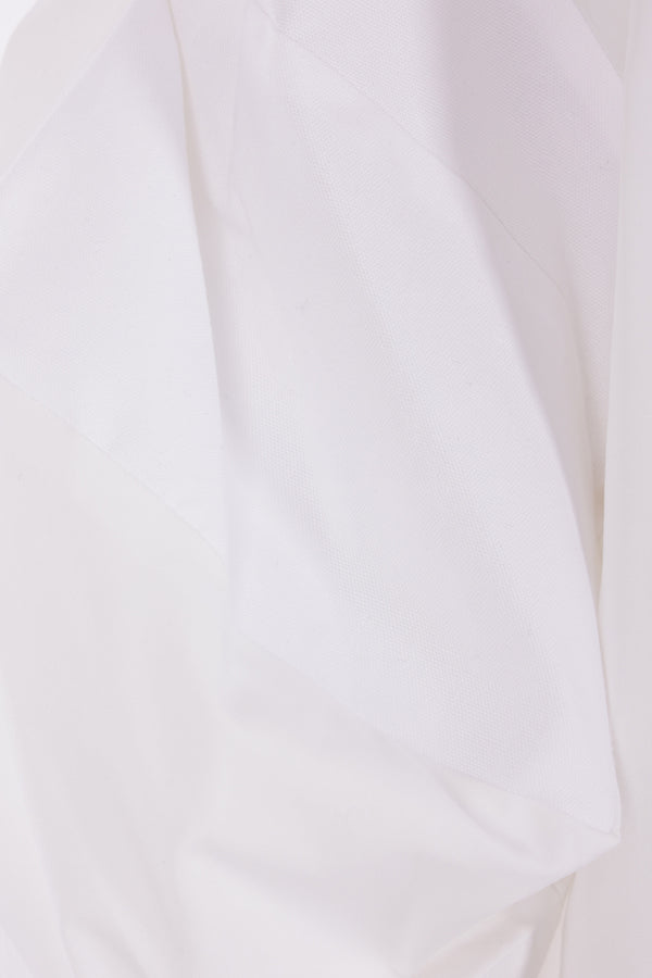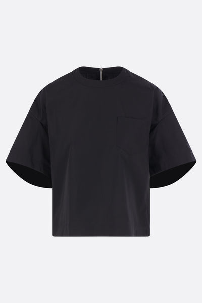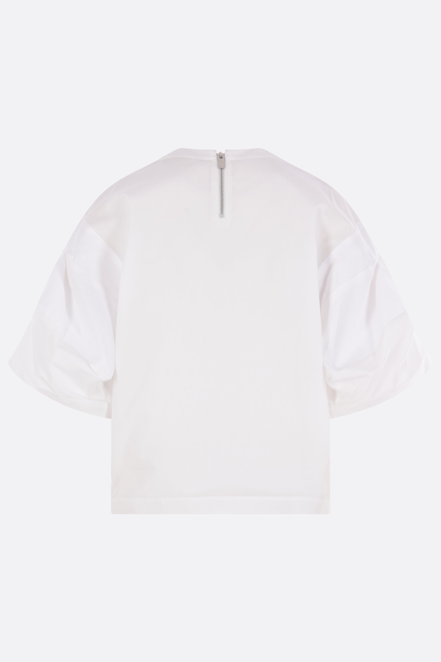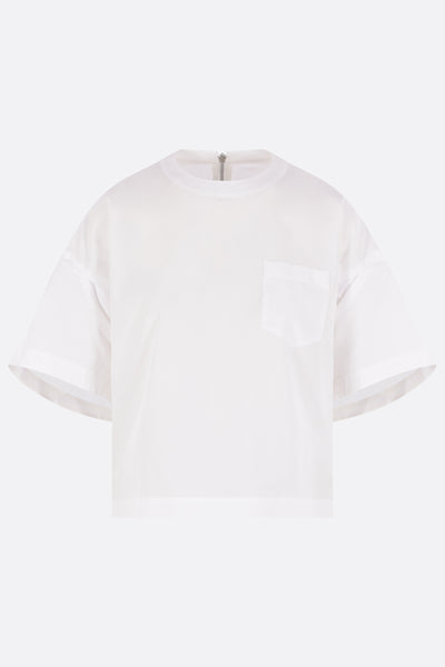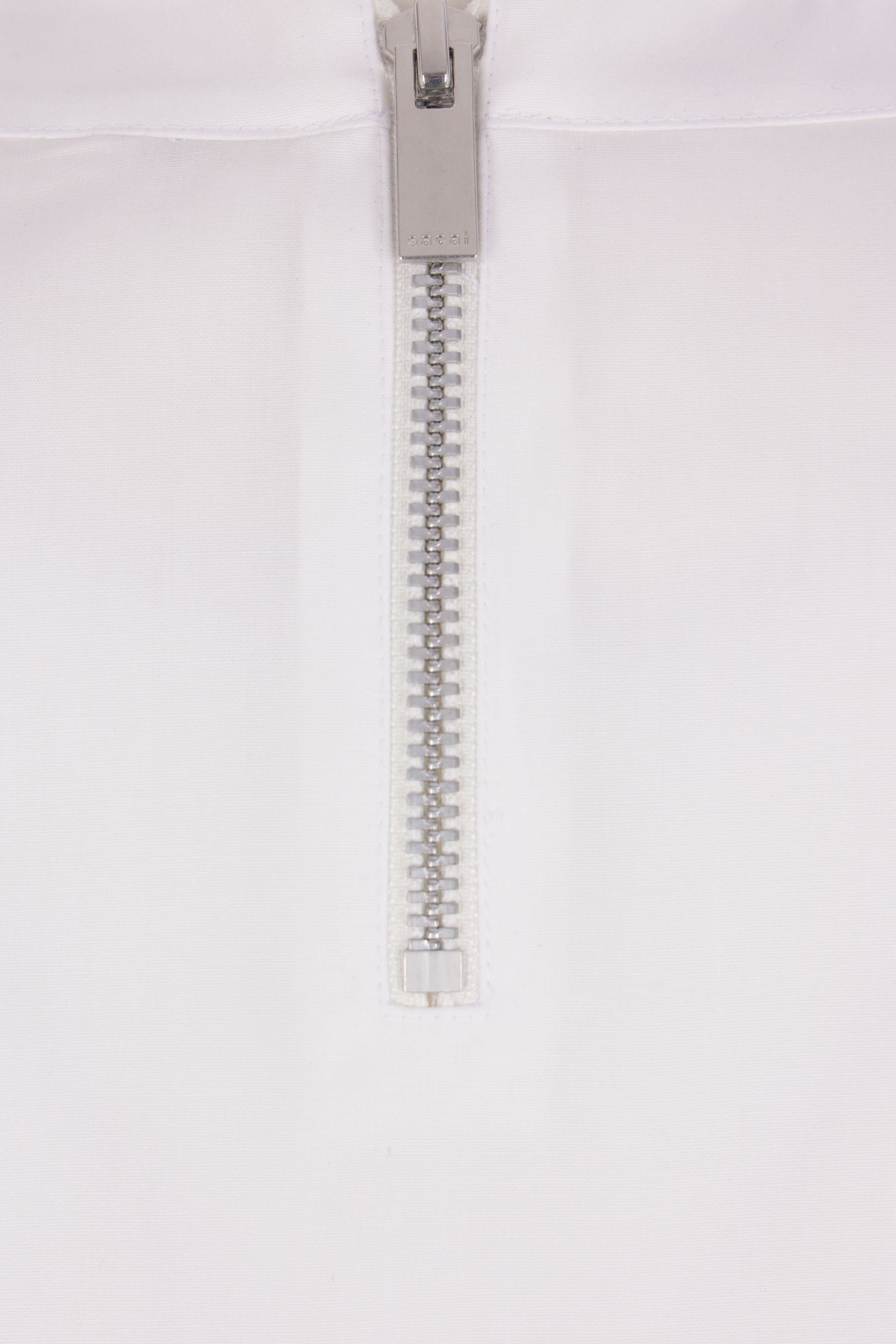Sacai blouse crafted from white cotton-blend poplin. It features a crew neckline, a zip closure at the back, a chest pocket, puff short sleeves, and a straight hem that is longer at the back with small side slits.