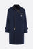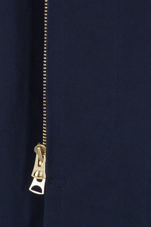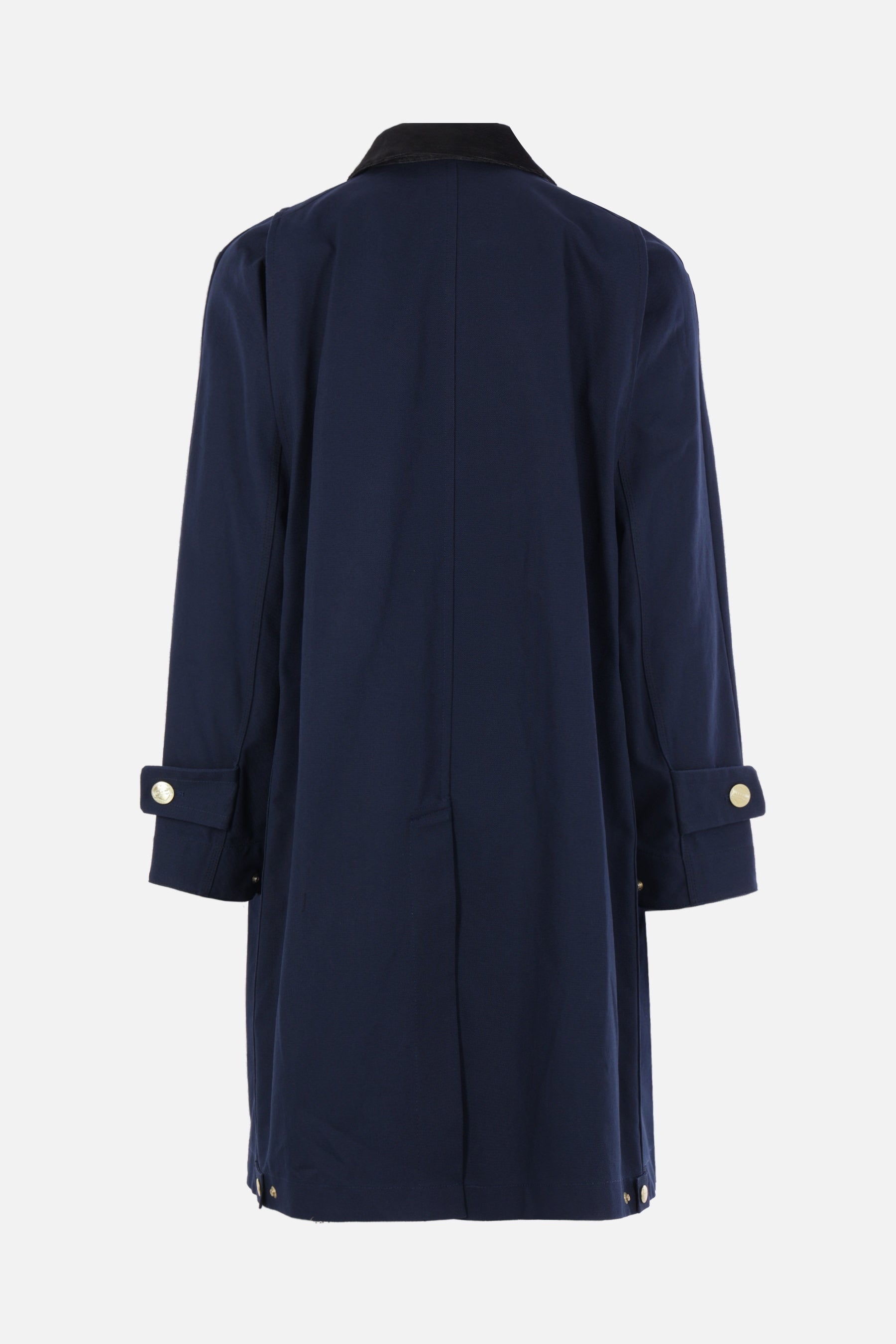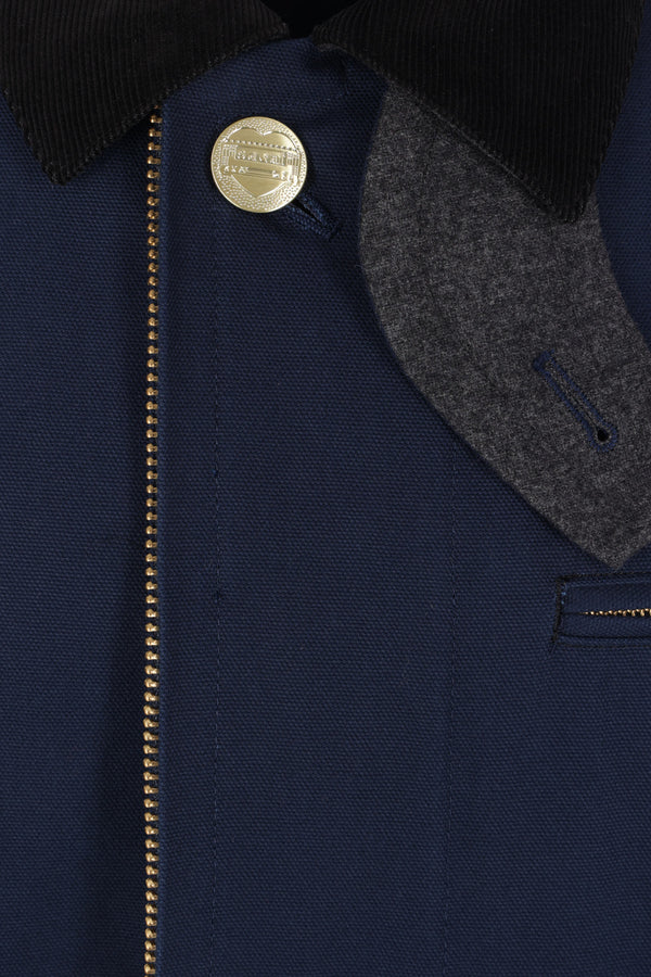 Sacai x Carhartt WIP coat crafted from blue cotton canvas, featuring a chest logo patch. Designed with a black corduroy pointed collar with felt undercollar, front closure with metal buttons or a double-slider zip, multiple pockets, long sleeves with buttoned cuffs and tabs, a central back vent, and an unlined interior.