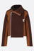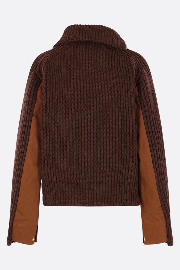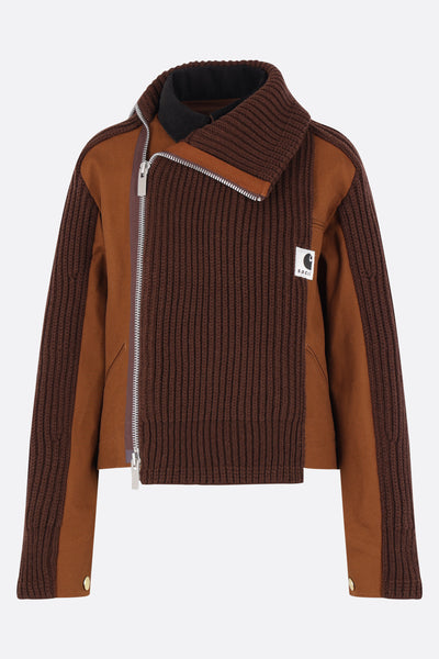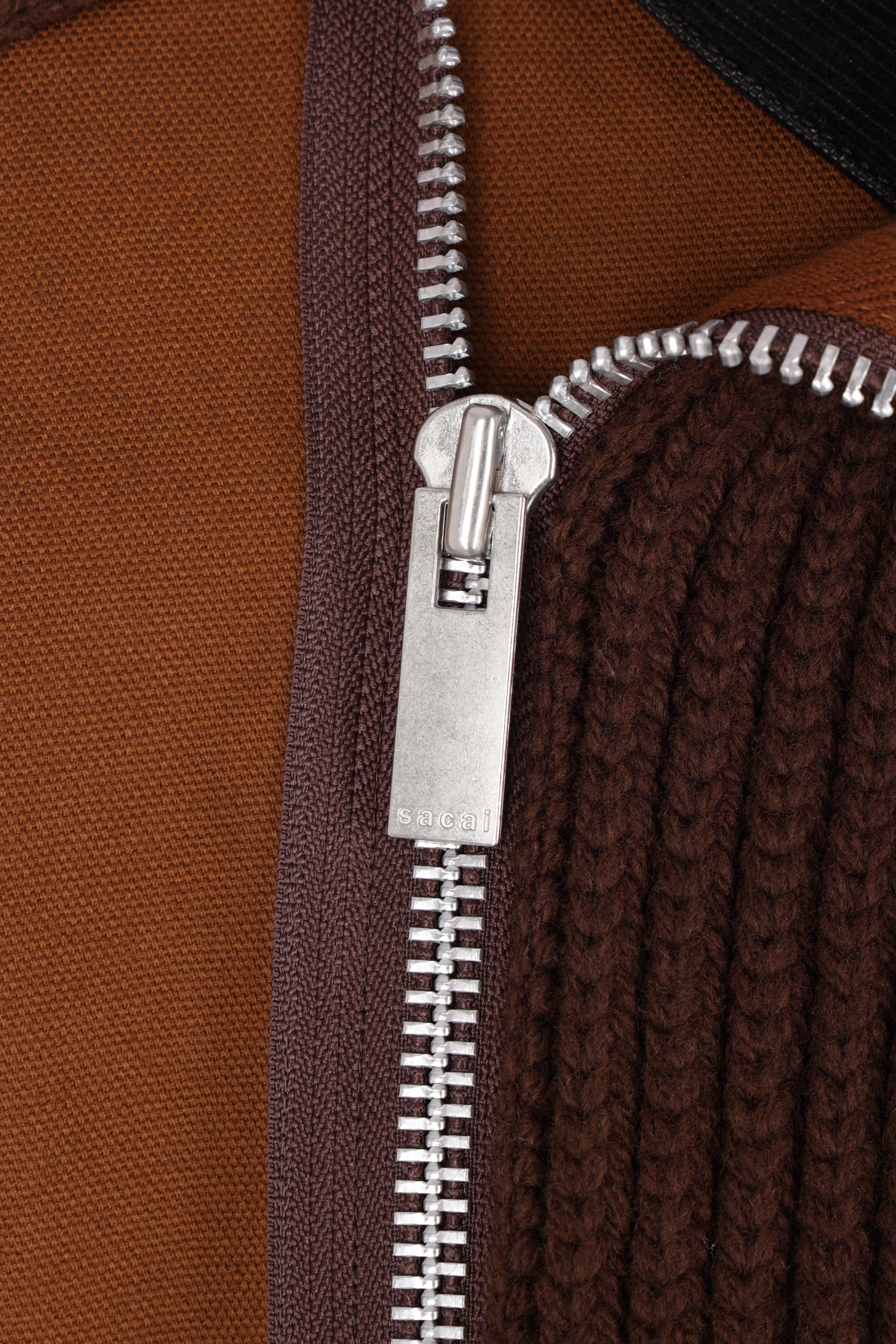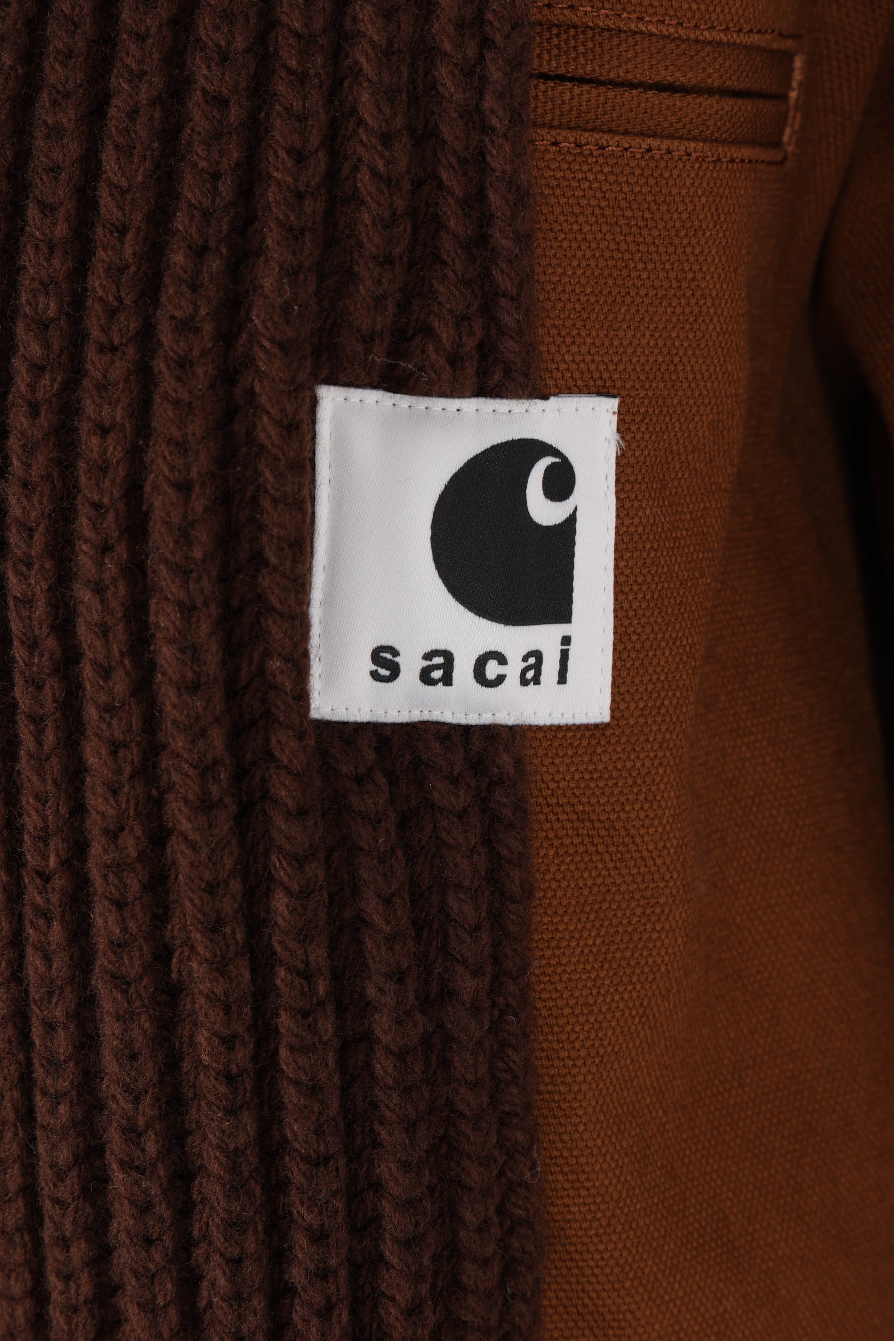 Sacai x Carhartt Wip deconstructed jacket crafted from brown cotton canvas and wool-blend ribbed knit. Featuring a corduroy pointed collar, off-center double-slider zip closure, multiple pockets, long sleeves with buttoned cuffs, and a straight hem with adjustable side tabs. Partially lined interior. The design is completed with a Sacai/Carhartt logo patch on the chest.