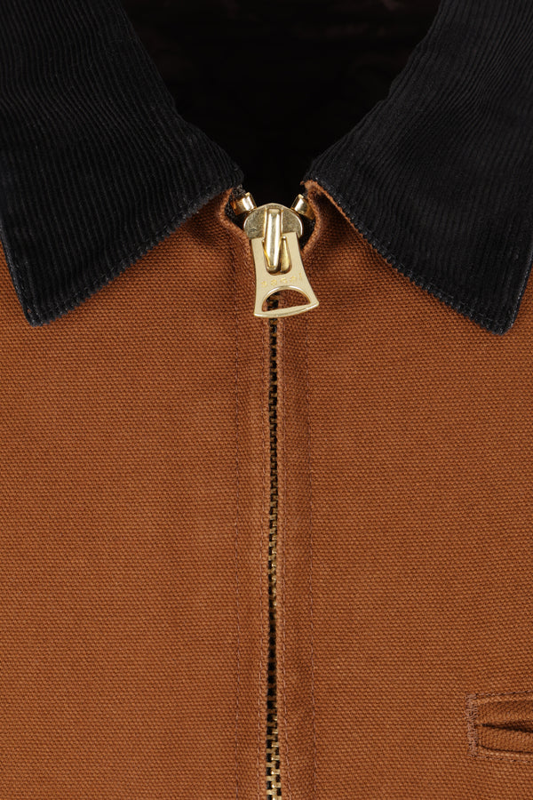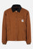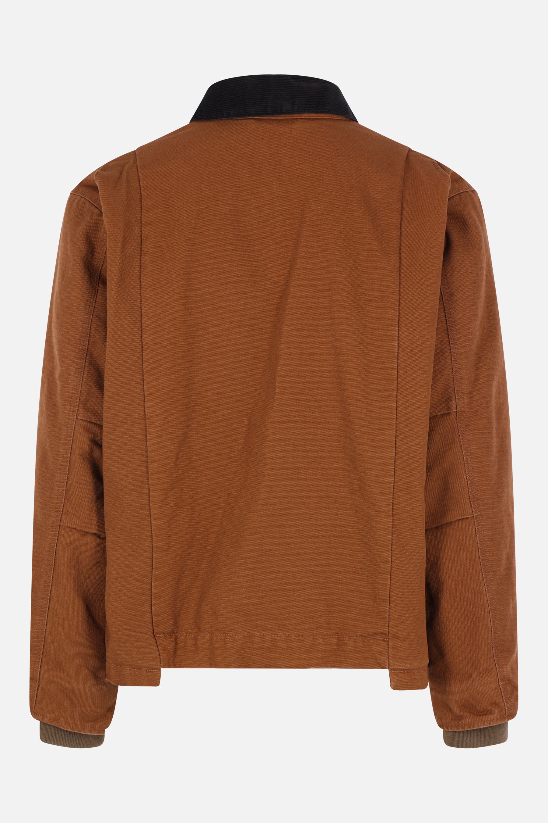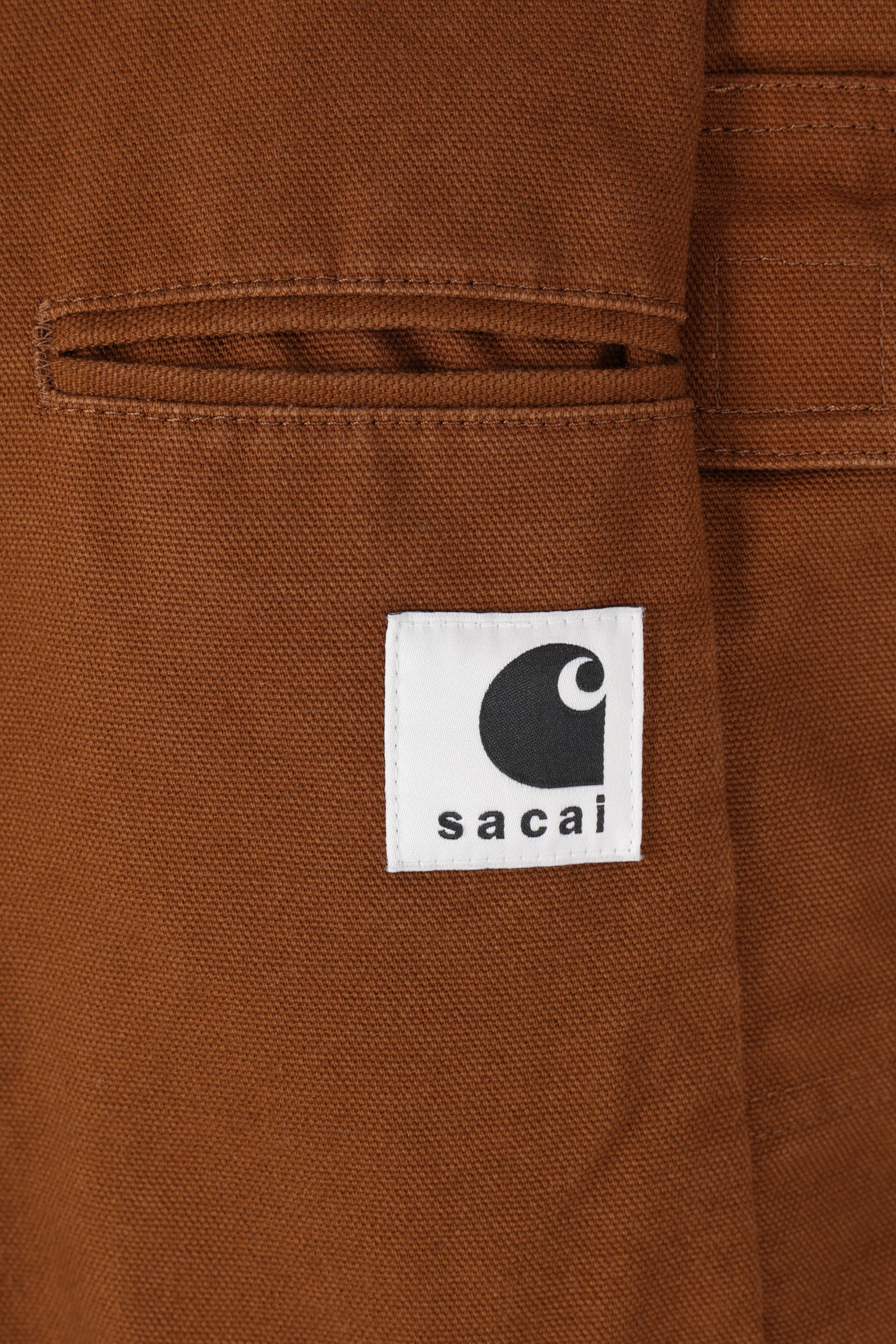 Sacai x Carhartt Wip padded jacket crafted from brown cotton canvas with a Sacai/Carhartt logo patch on the chest. Featuring a black corduroy pointed collar, double-slider front zip closure, multiple deconstructed pockets, long sleeves with ribbed cuffs, pleats on the elbows and shoulders, deconstructed hem, and quilted interior.