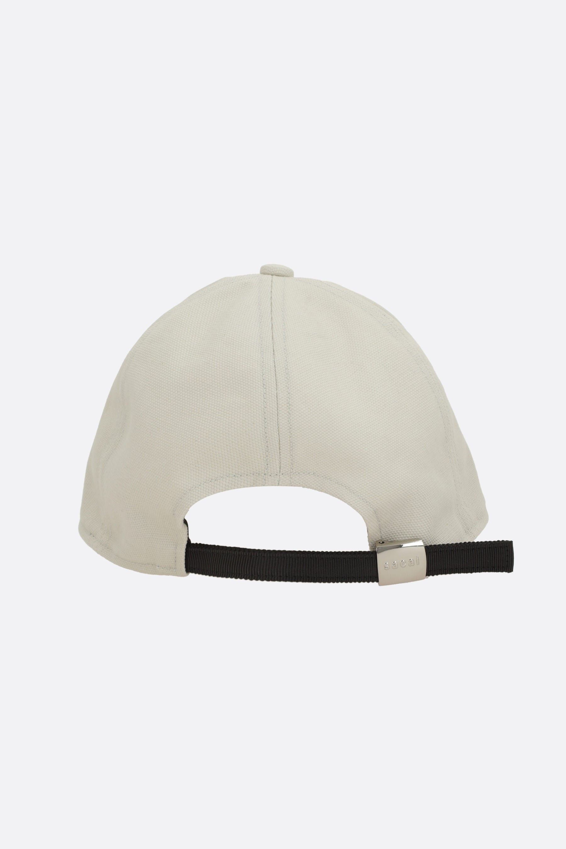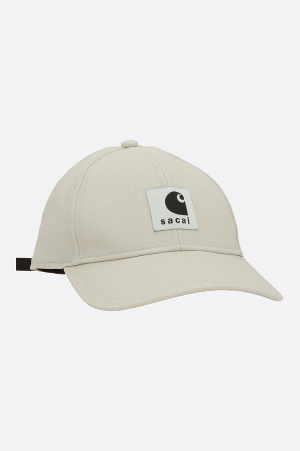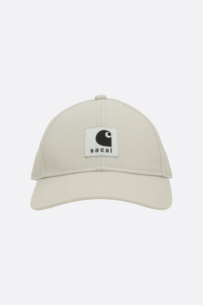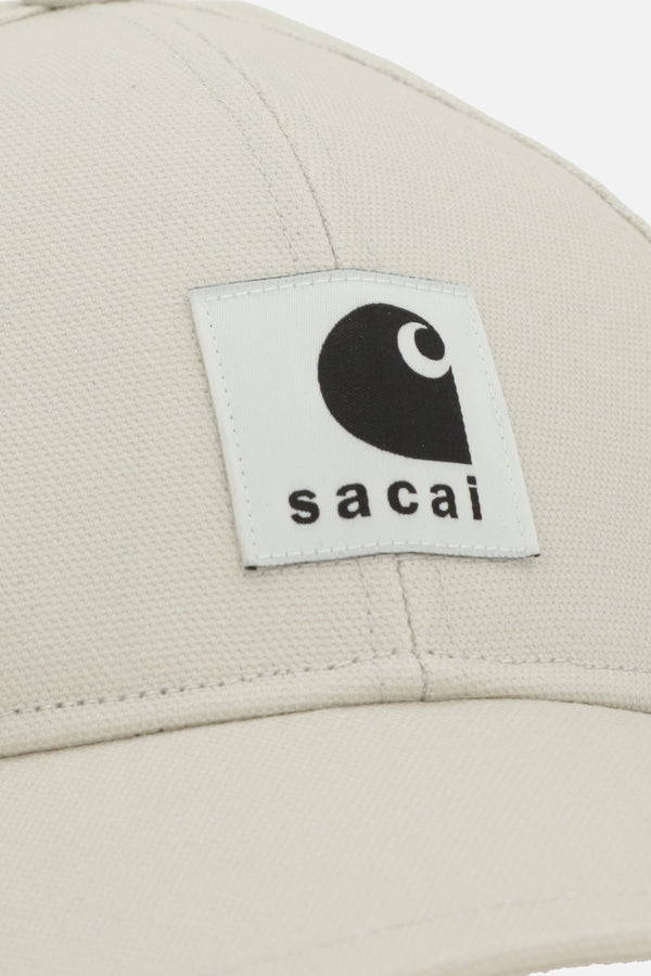Sacai x Carhartt WIP baseball cap crafted from ivory cotton canvas, featuring a front logo patch. Designed with an adjustable strap with metal buckle and an unlined interior.
