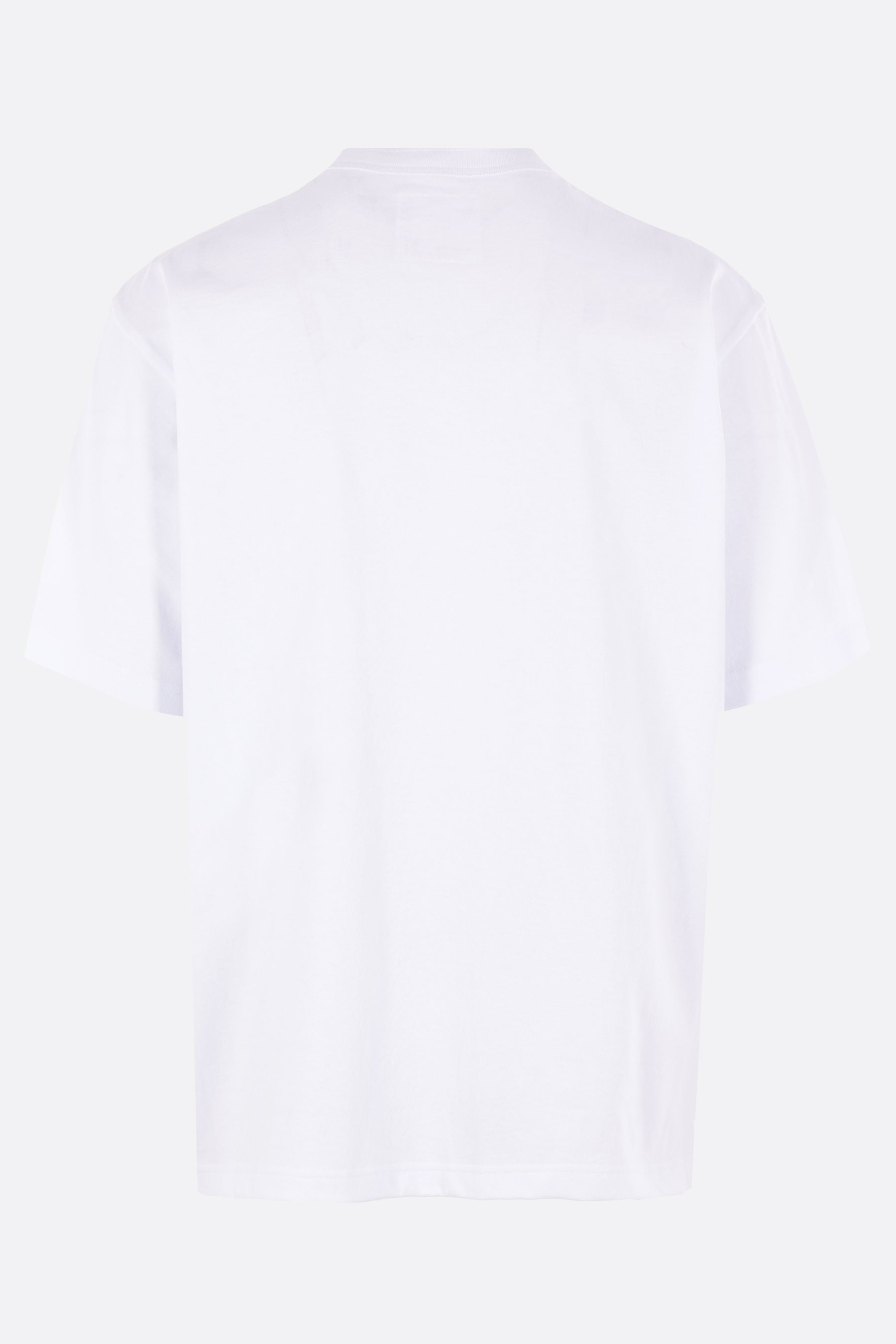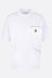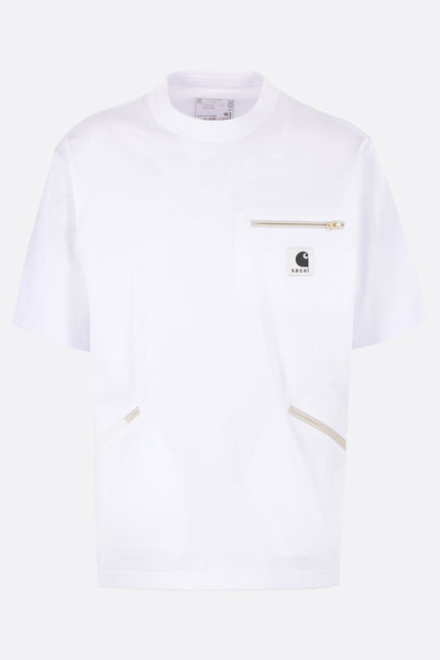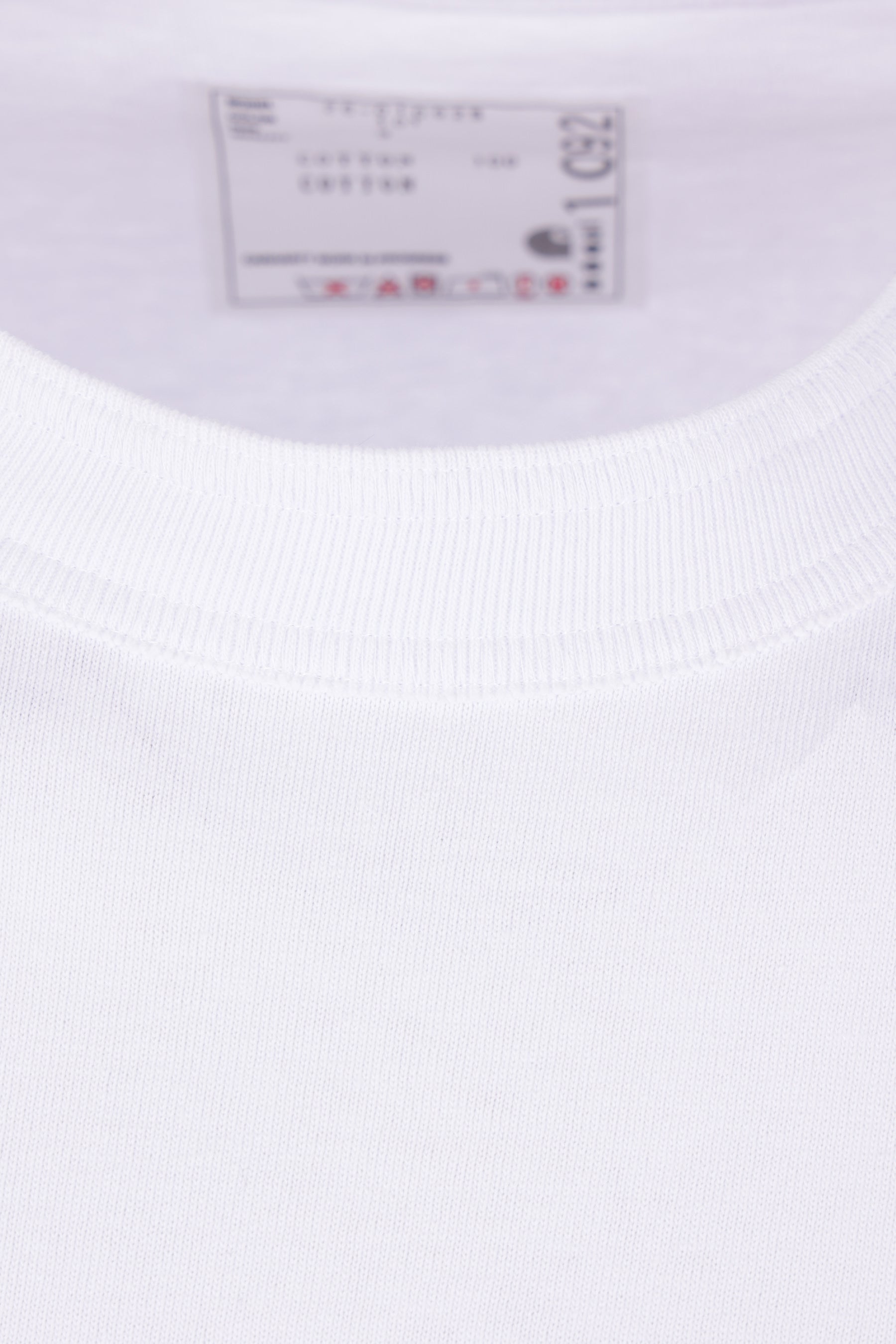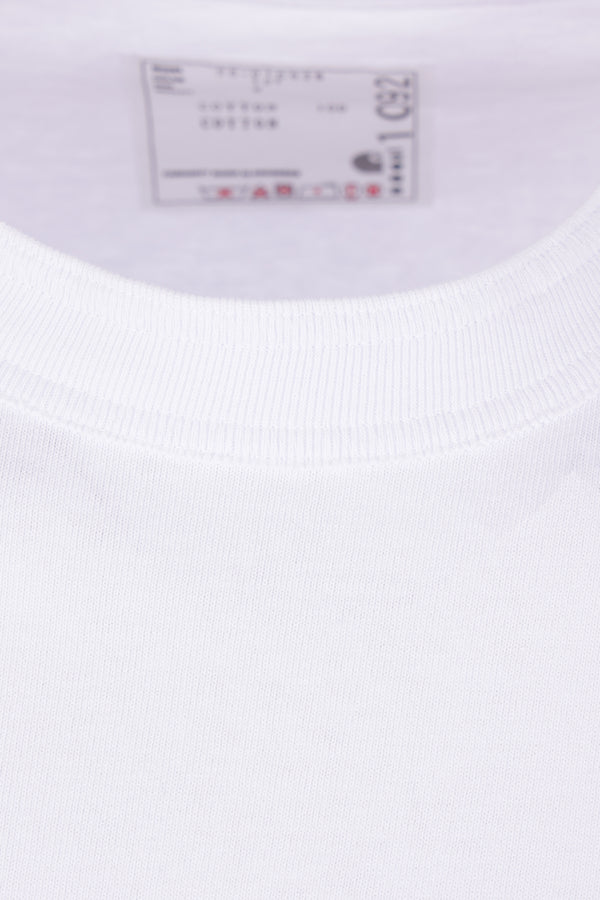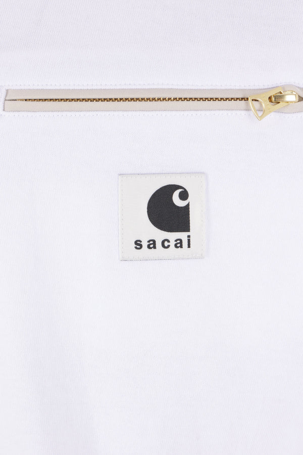 Sacai x Carhartt WIP t-shirt crafted from white cotton jersey, featuring a chest logo patch. Designed with a crew neckline, short sleeves, multiple pockets with contrasting trim, and a straight hem.