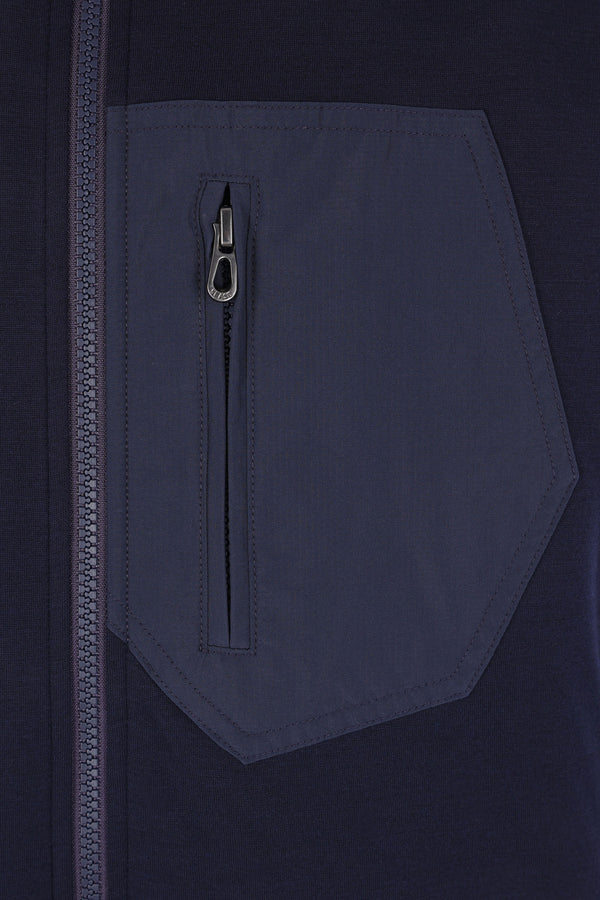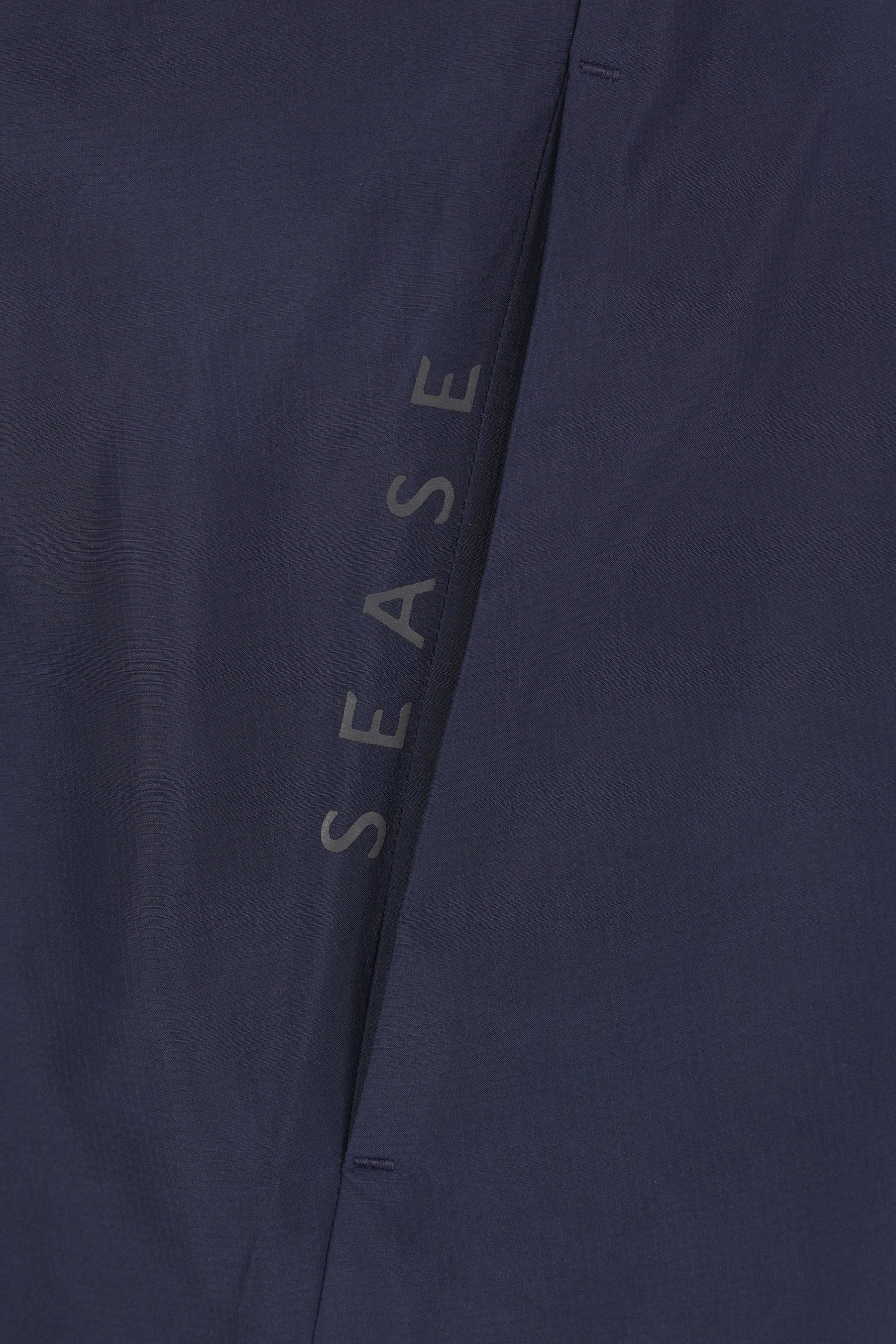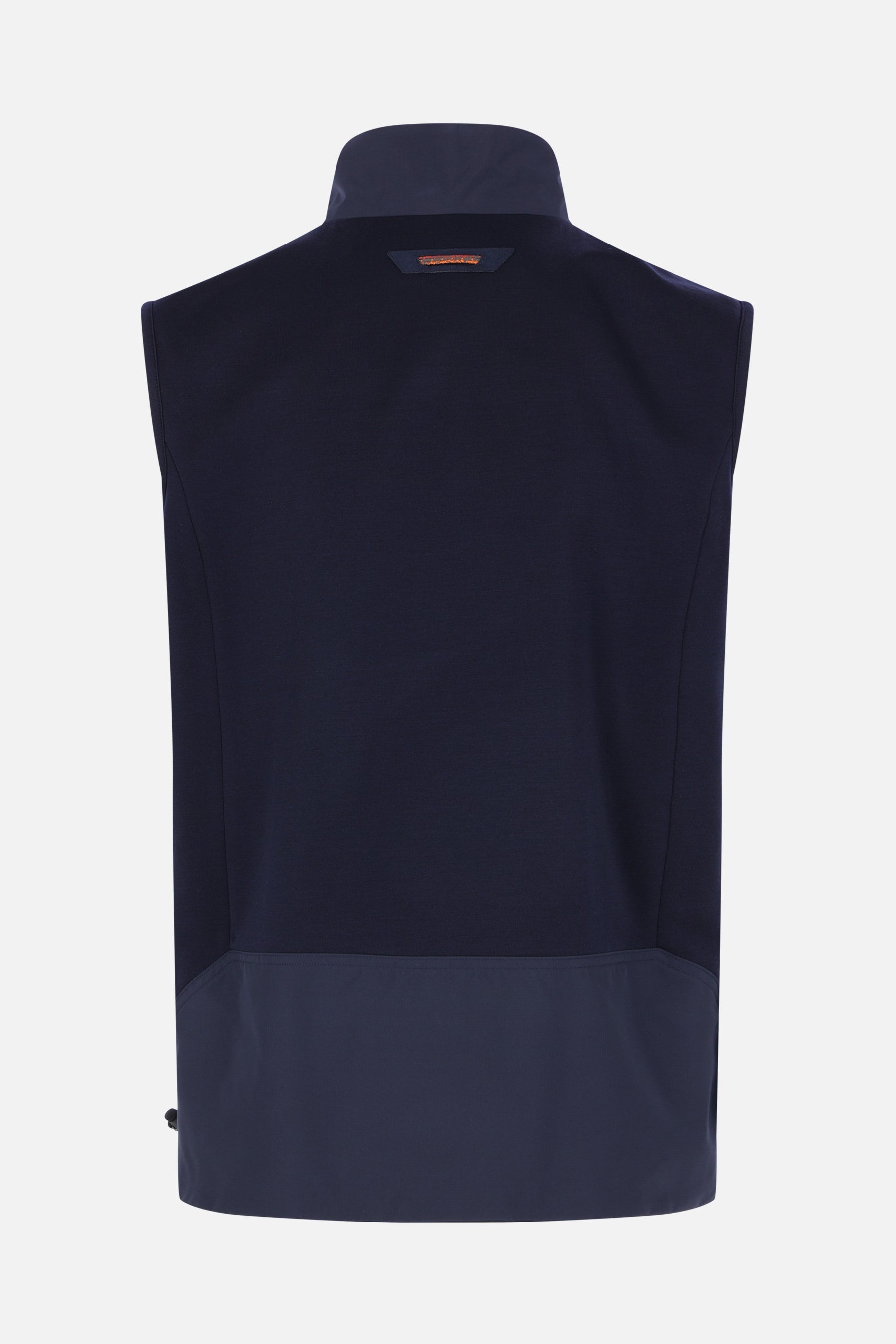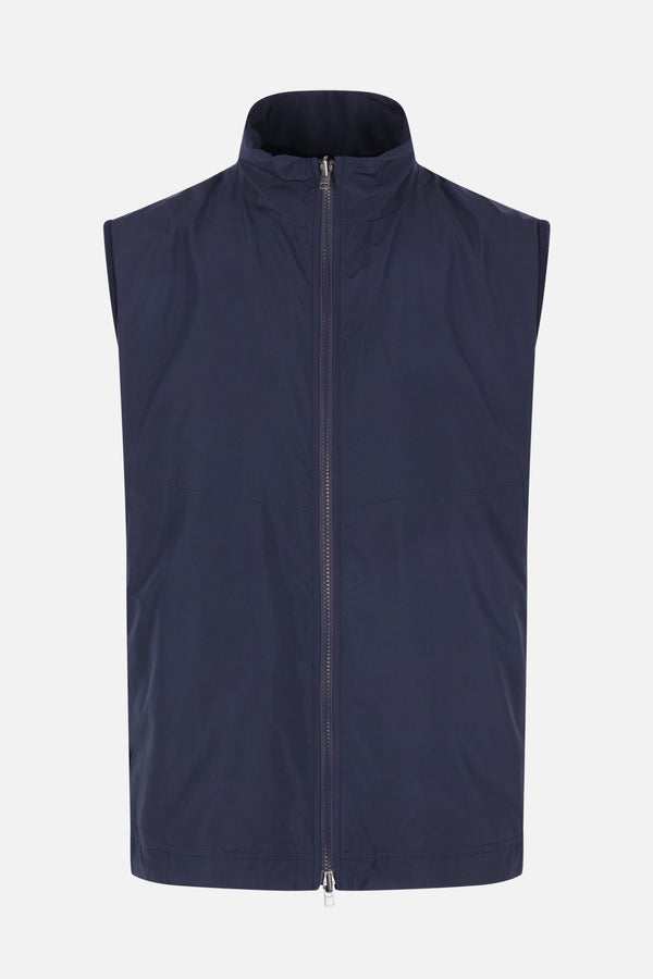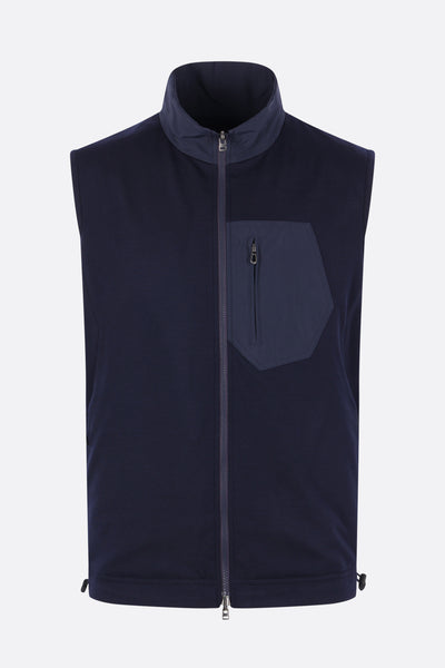 Sease slightly padded reversible vest made from blue wool-blend jersey on one side and nylon on the other. Featuring a high collar, double-slider front zip, multiple pockets, and a rounded hem with drawstring.