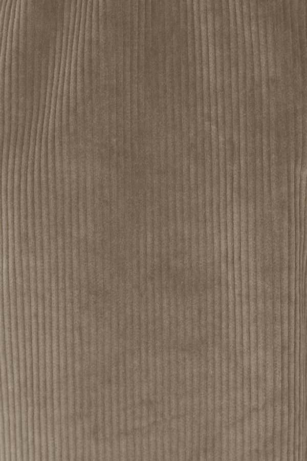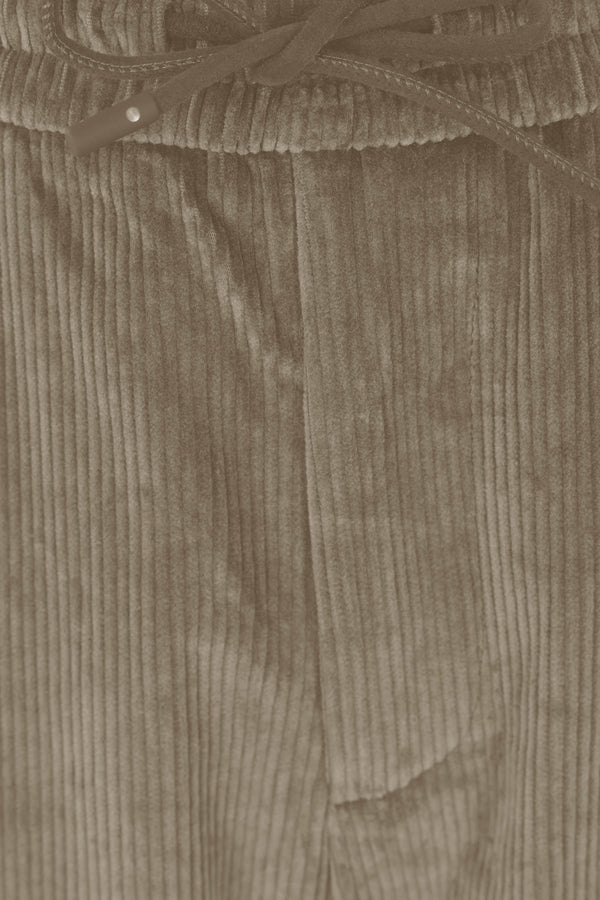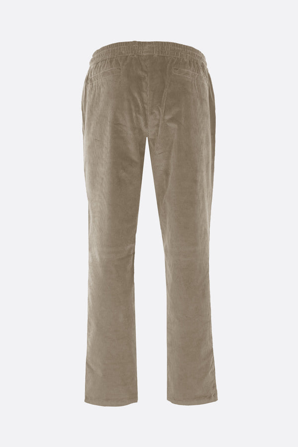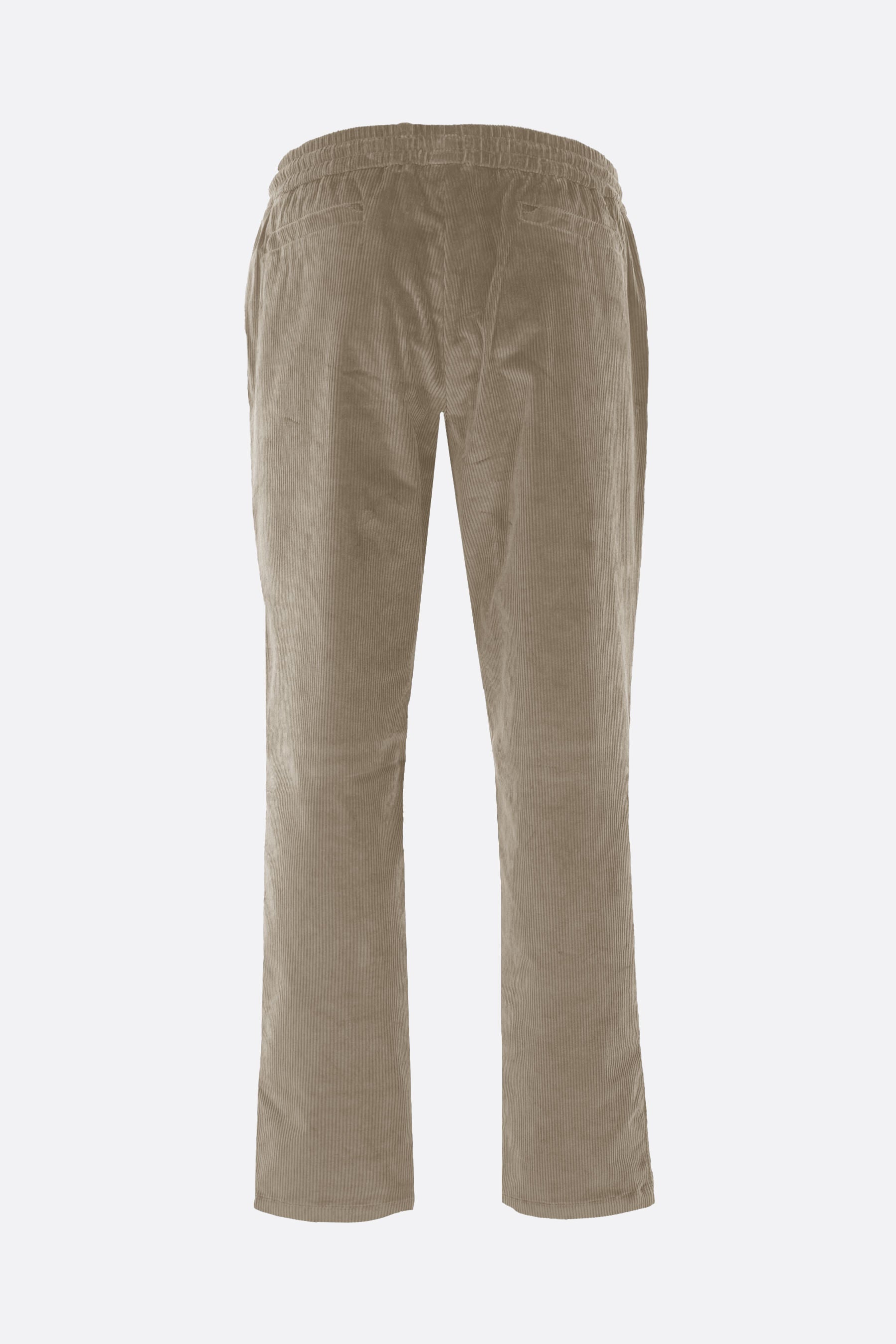 Sease trousers crafted from stretch cotton corduroy in beige. Featuring an elasticated waistband with drawstring, front zip closure, and multiple pockets.