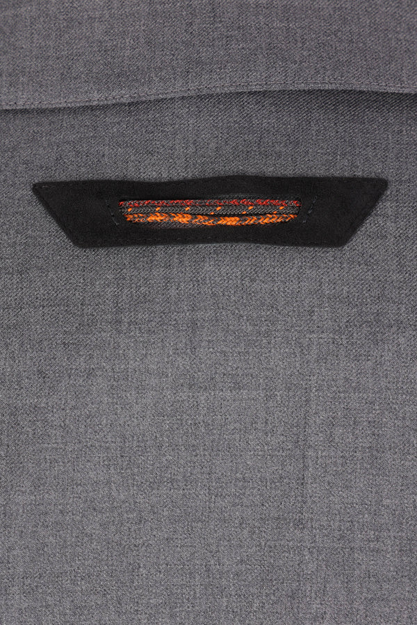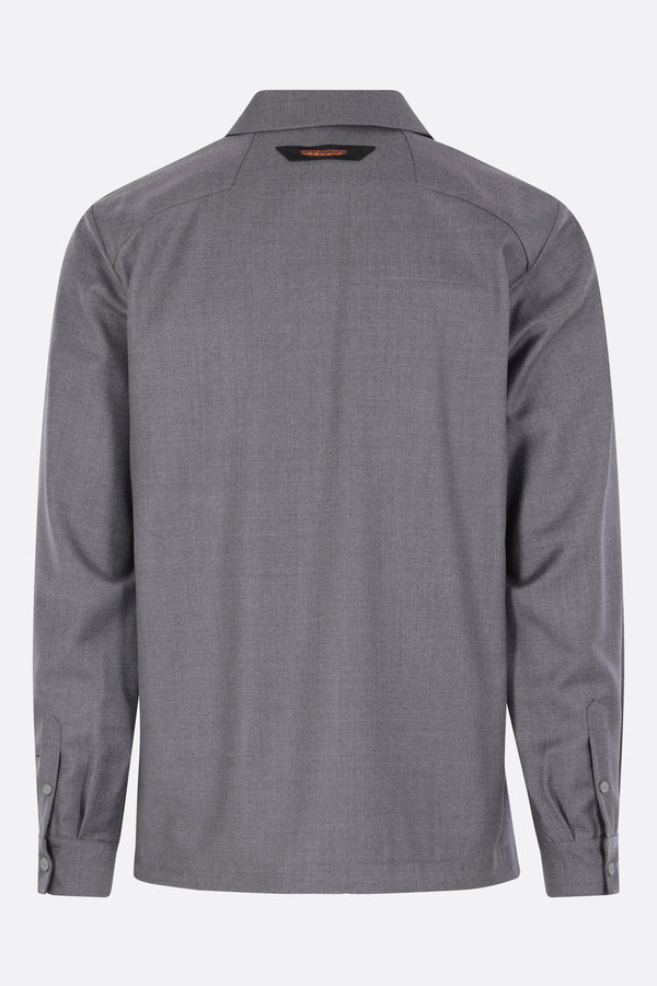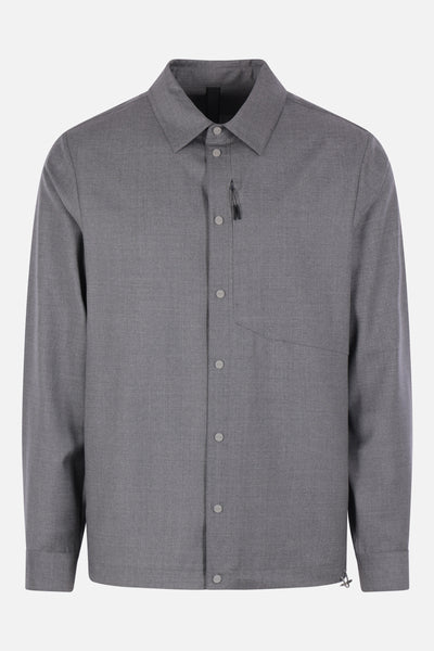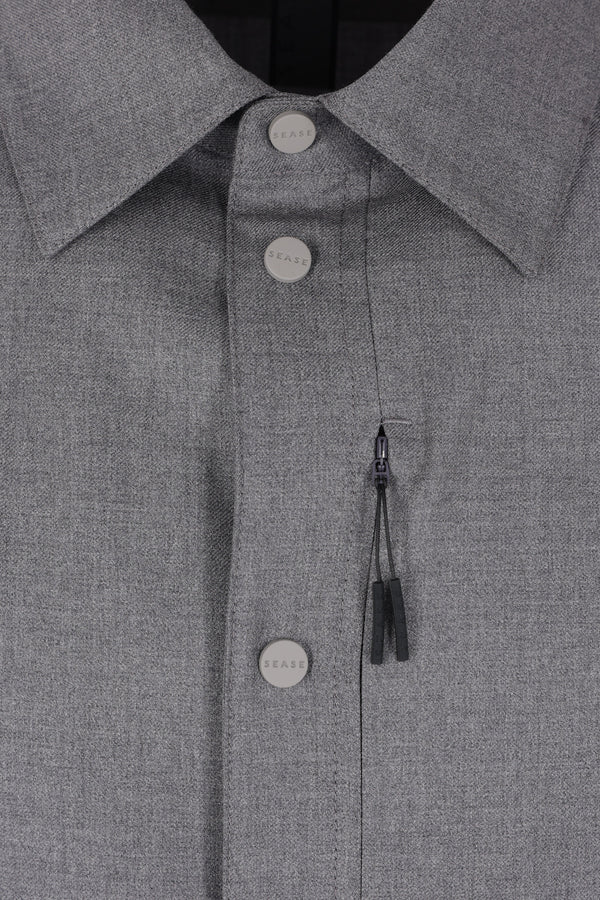 Sease shirt made from grey wool. Featuring a classic collar, front snap button closure, zip pockets, long sleeves with buttoned cuffs, and a straight hem with drawstring.