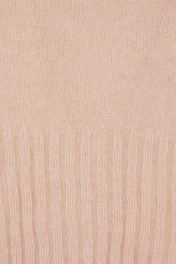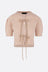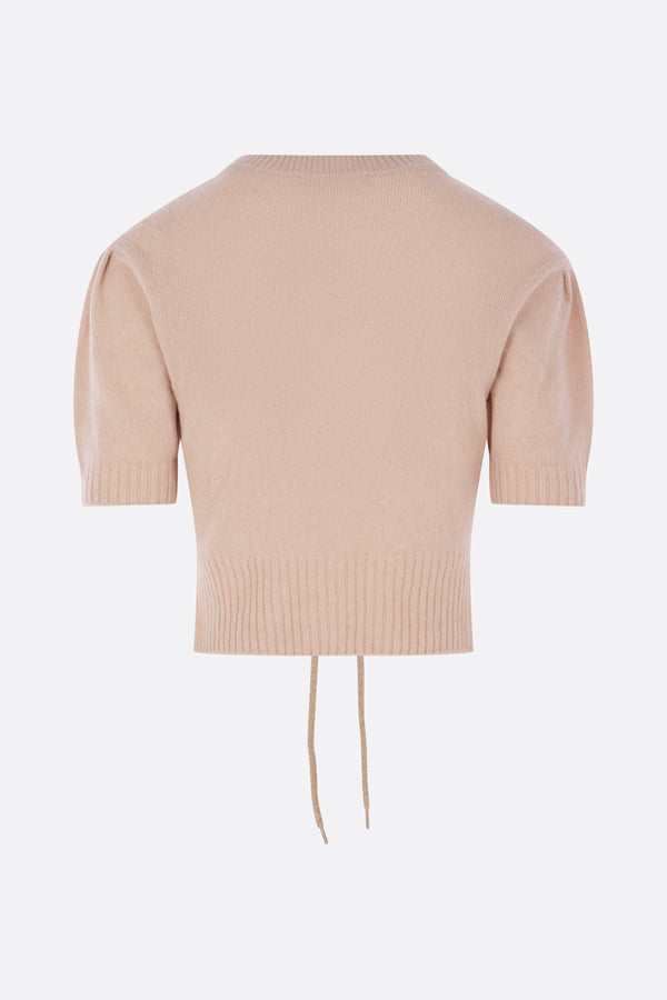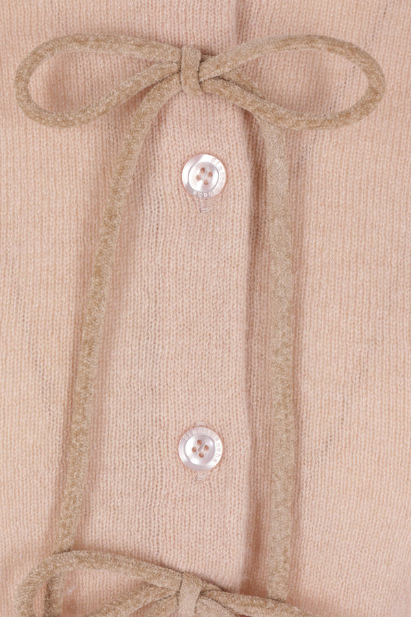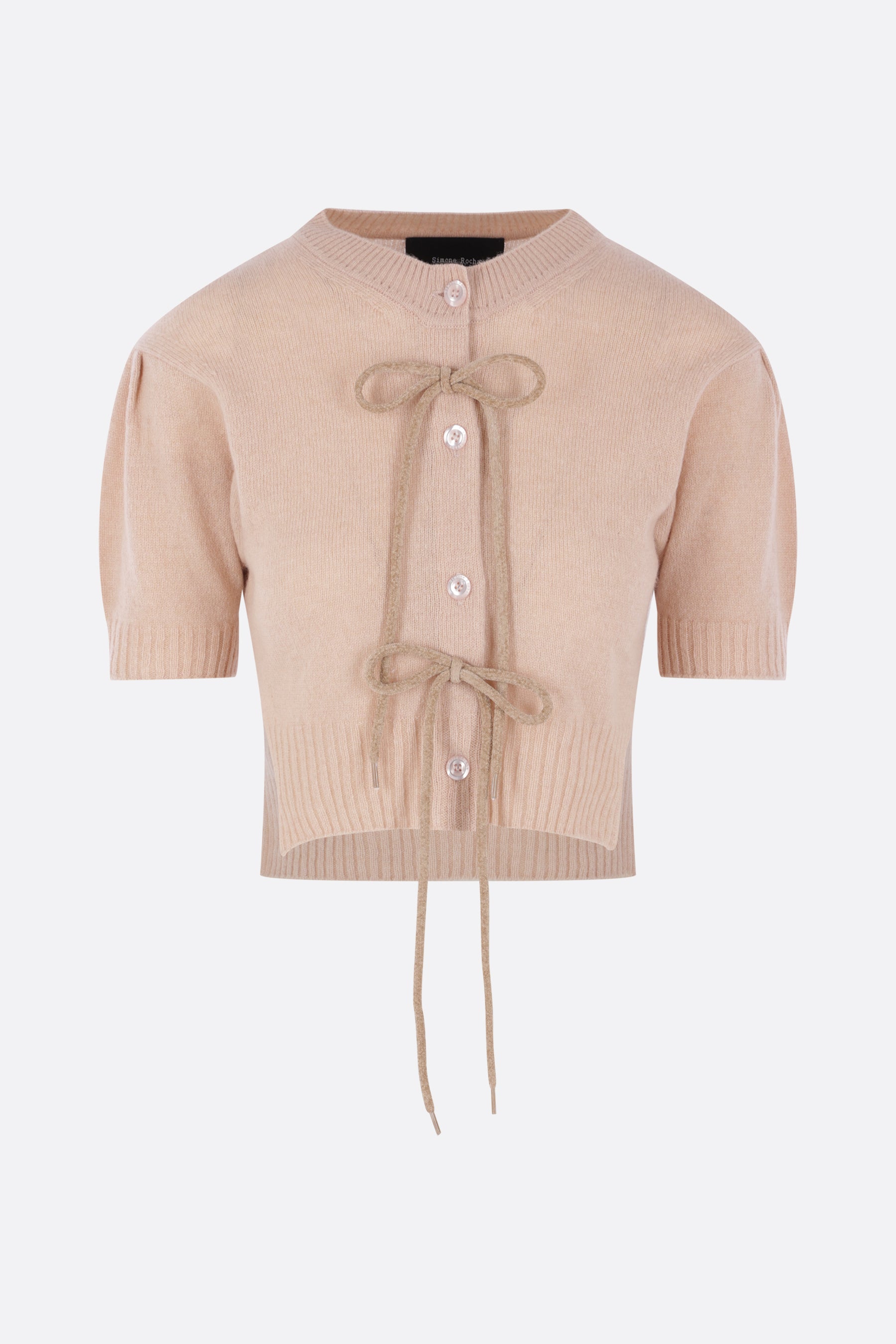 Simone Rocha cropped cardigan crafted from pink cashmere knit with taupe chenille bows. Featuring a crew neckline, front button closure, puff short sleeves, and ribbed trims.