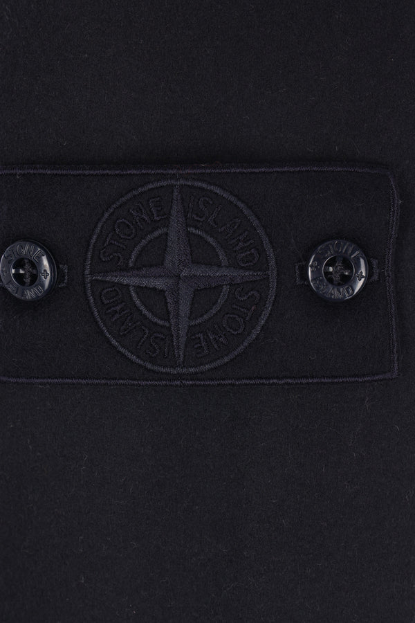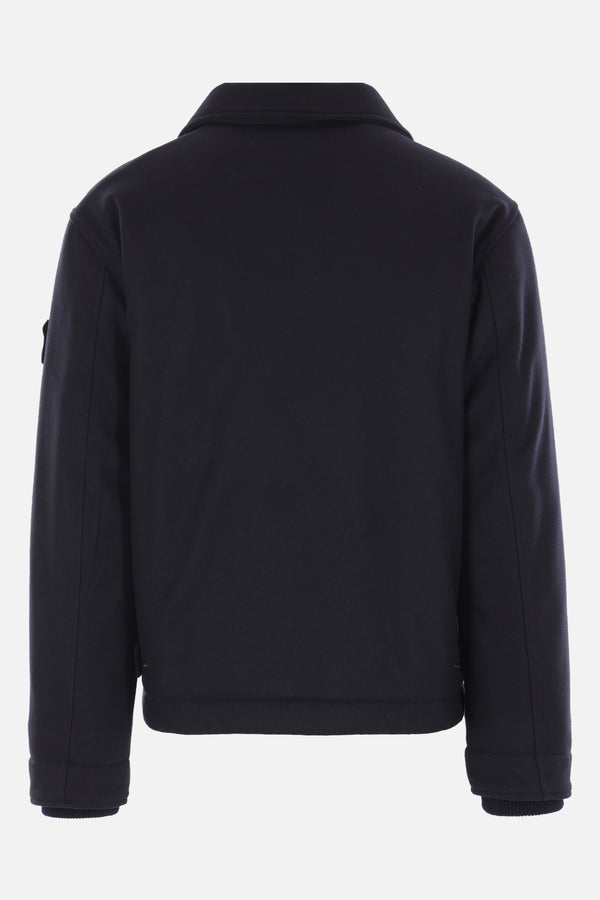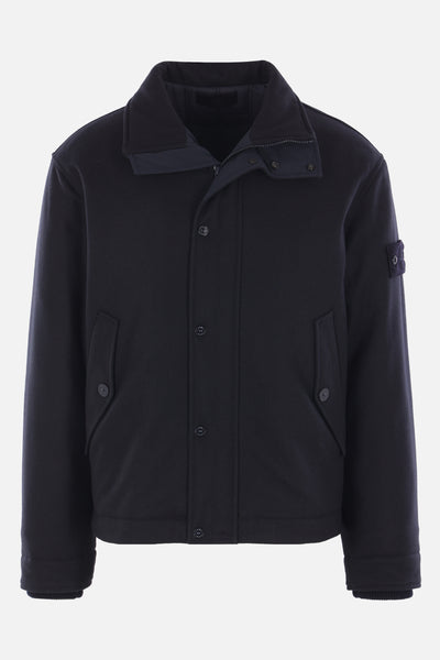 Stone Island padded jacket crafted from blue wool-blend flannel. Featuring a high collar, front closure with two-way zip and snap buttons, front flap pockets, long sleeves with ribbed knit cuffs, and a straight hem with adjustable back tabs. Quilted interior. The design is completed by the signature logo badge on the left sleeve.