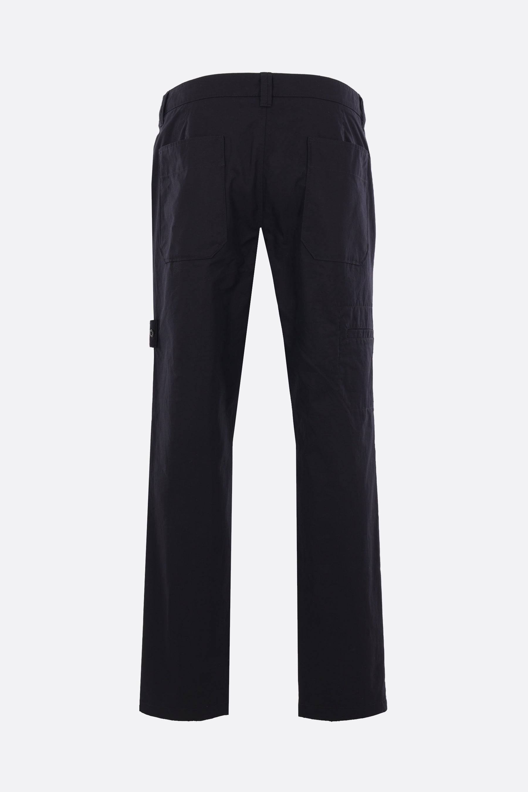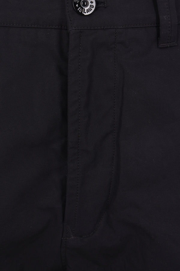 Stone Island chino trousers crafted in black cotton with a removable logo badge. Featuring front closure with metal button and zip, belt loops, and multiple pockets. Ghost Collection.