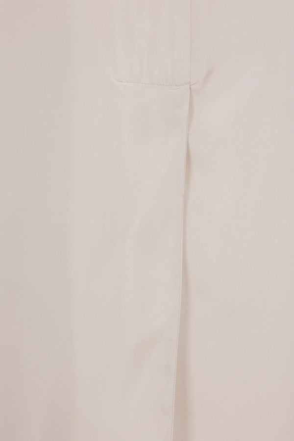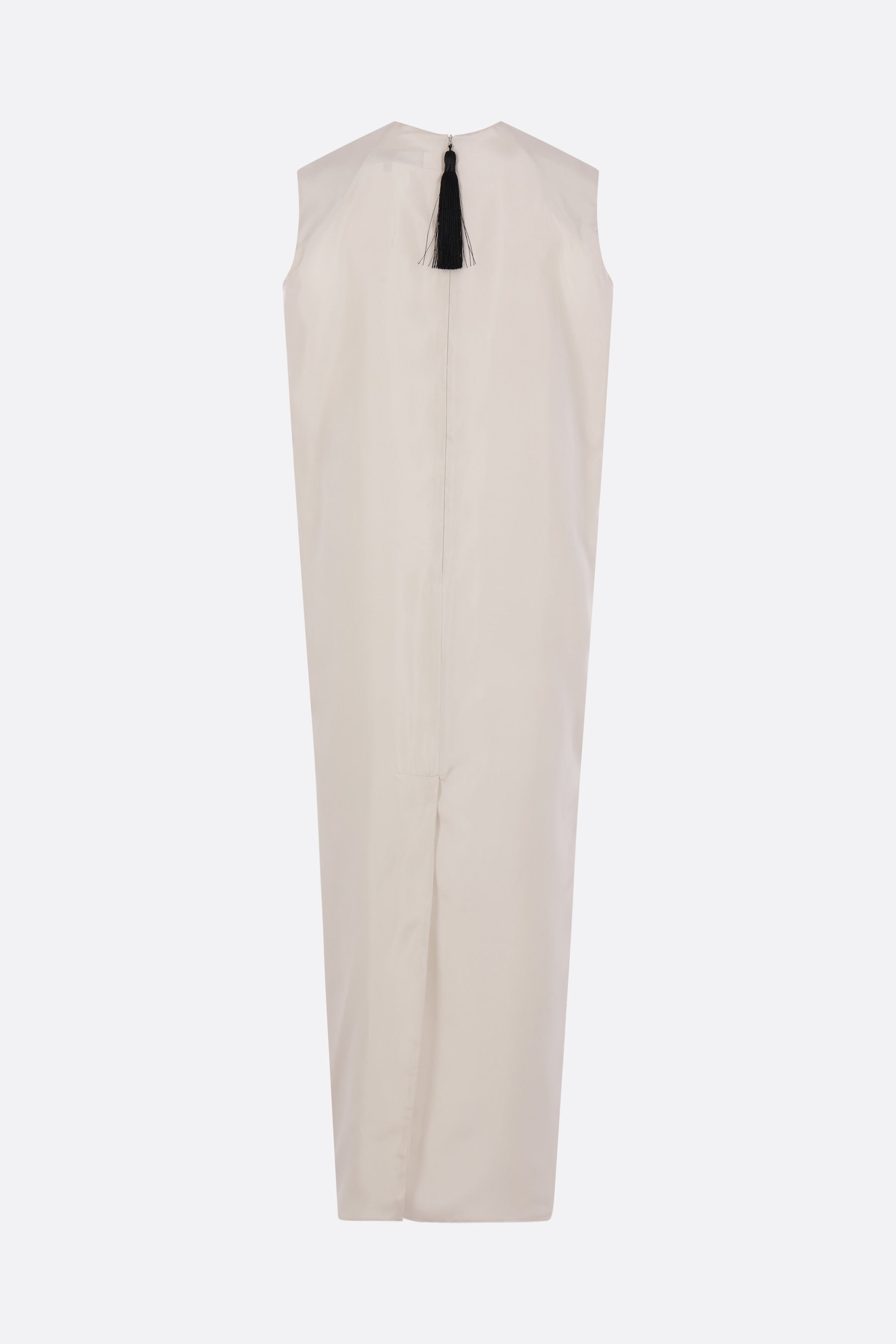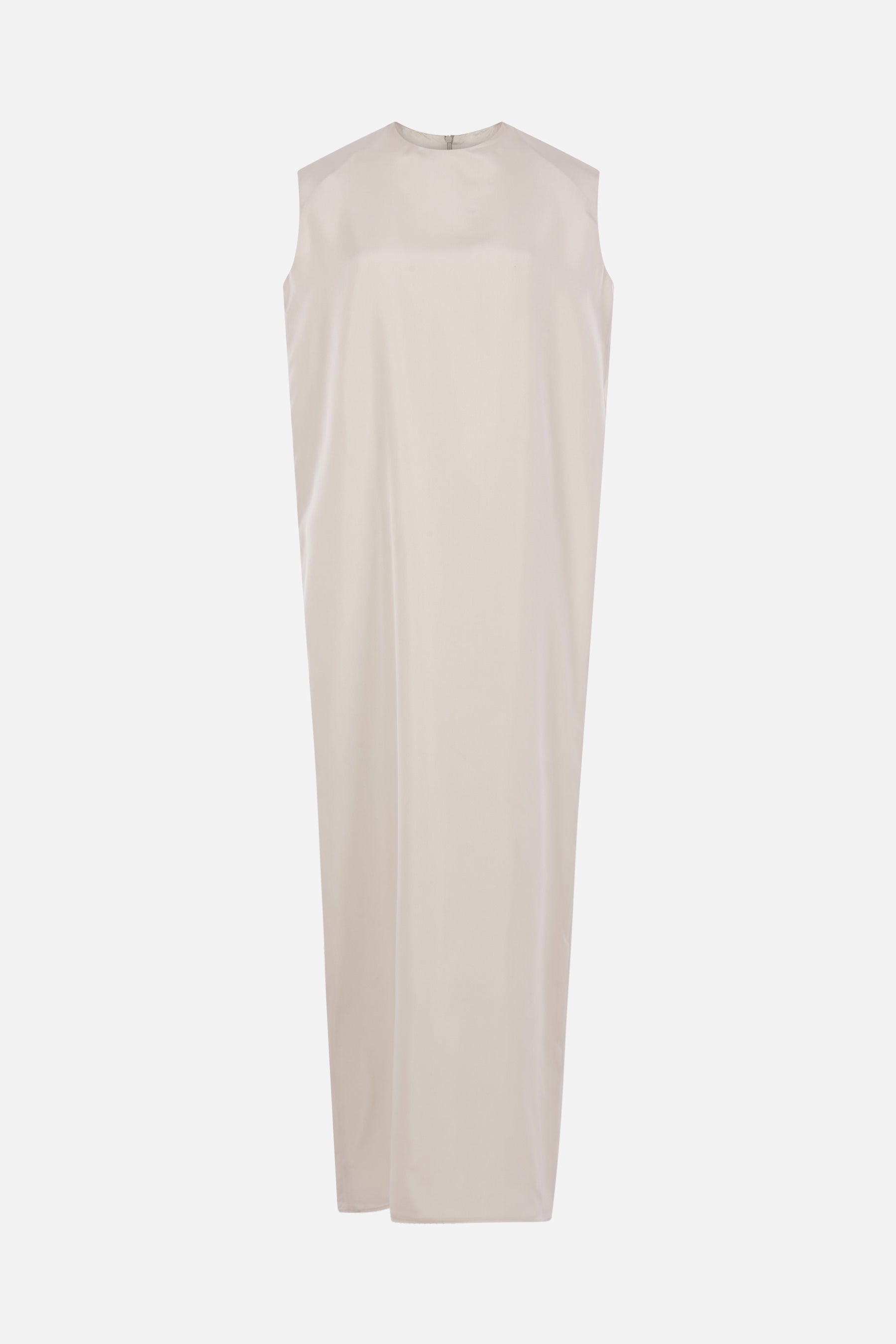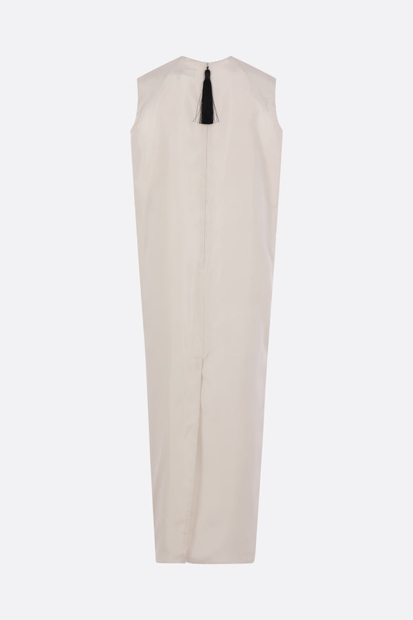 Abito smanicato di Ter et Bantine realizzato in seta color avorio. Caratterizzato da scollatura a giro, chiusura posteriore con zip invisibile e dettaglio nappina, spacco centrale sul retro e interno foderato.