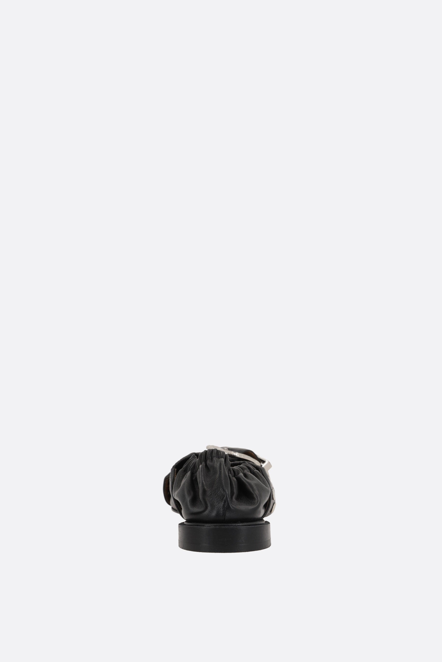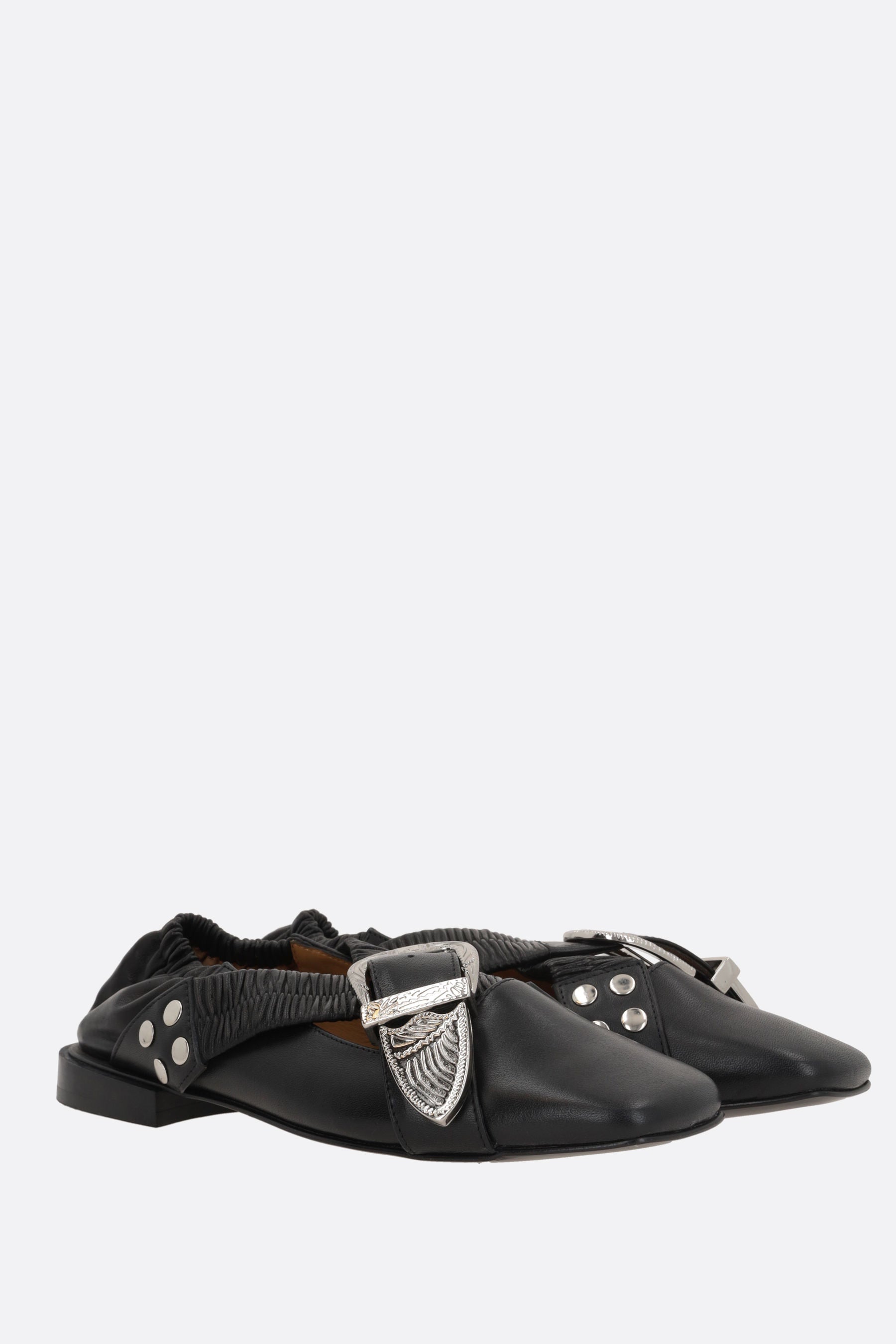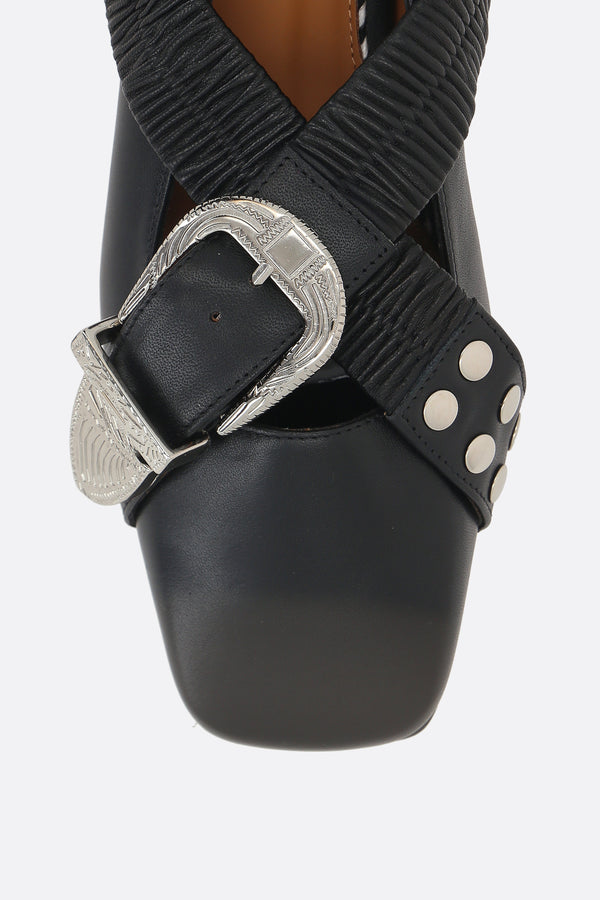 Toga Pulla ballerinas crafted from smooth black leather. Featuring a square toe, crisscross elastic straps on the front with a western-style buckle, an elasticized heel, leather lining and a leather sole.