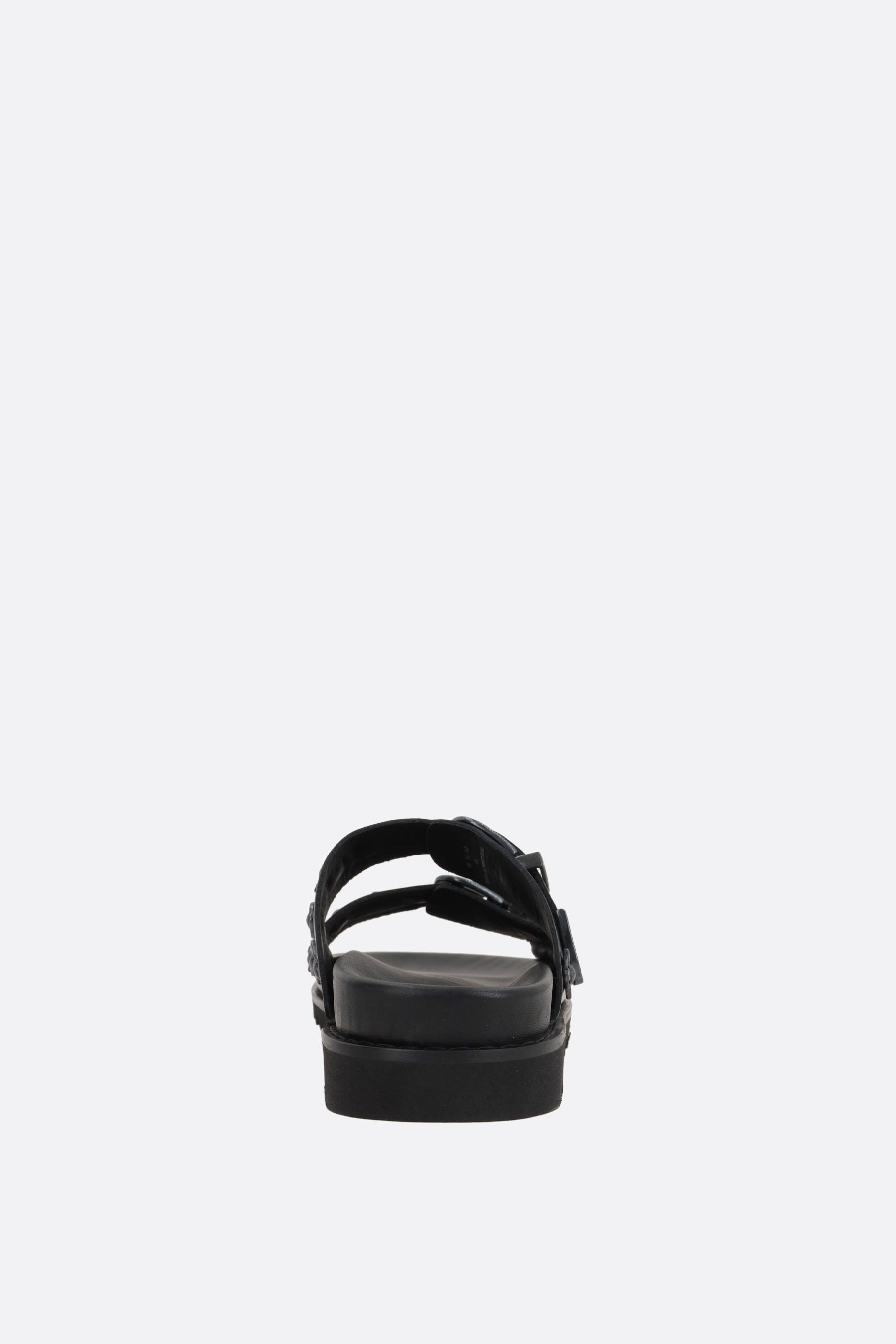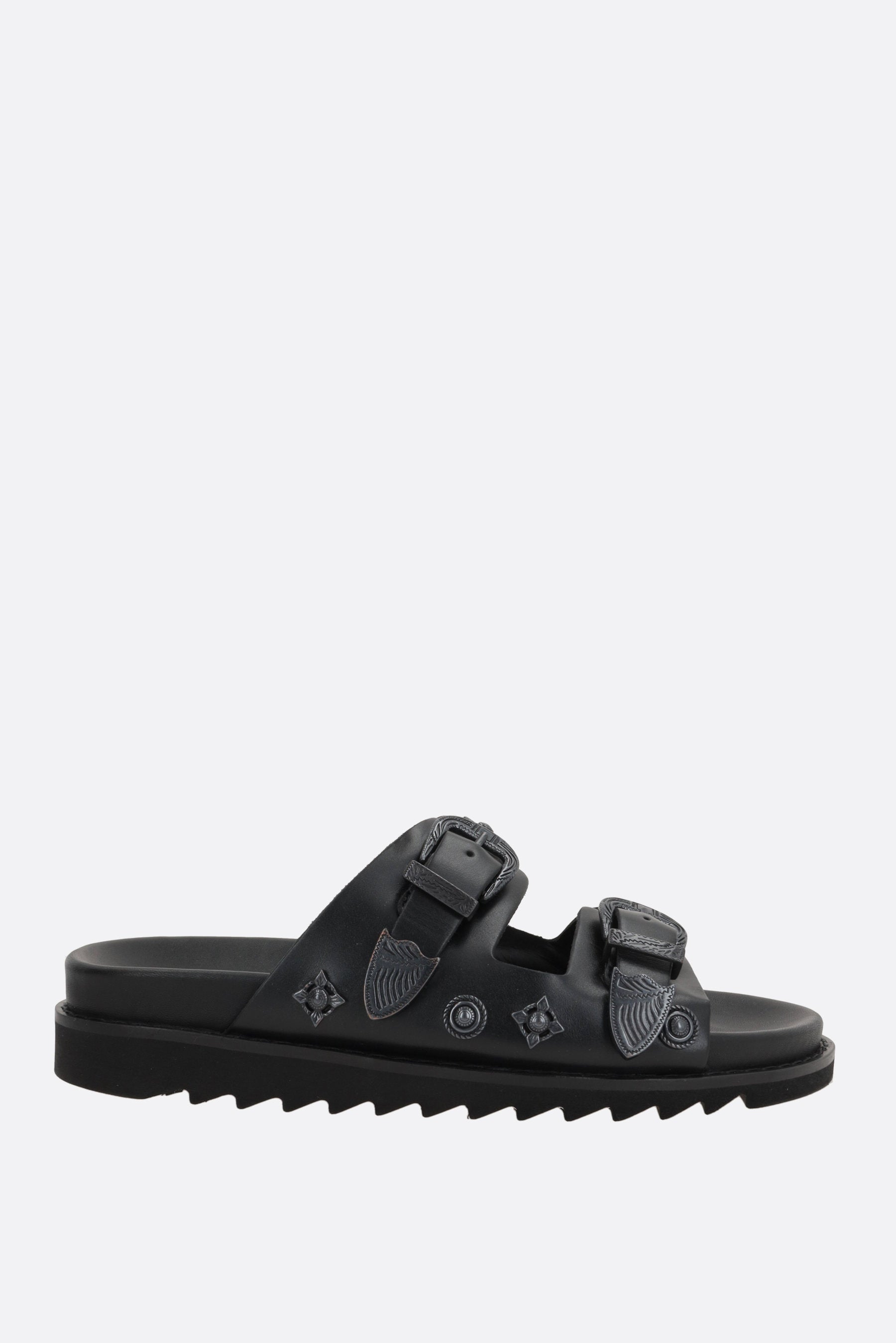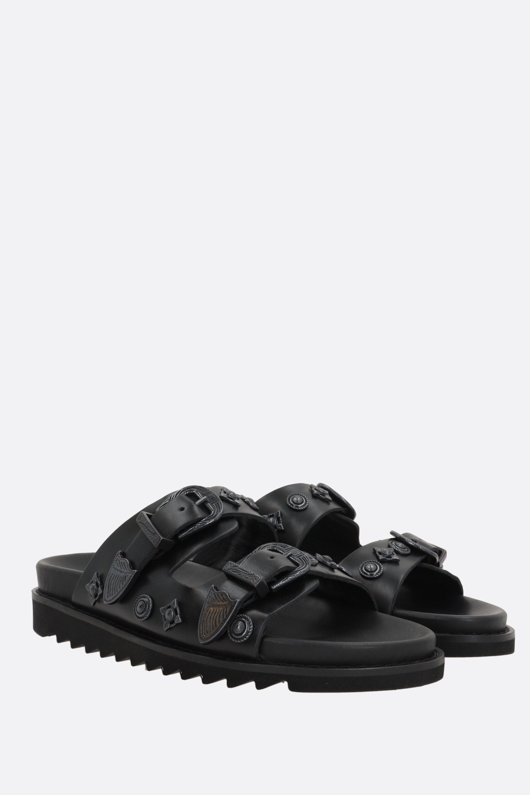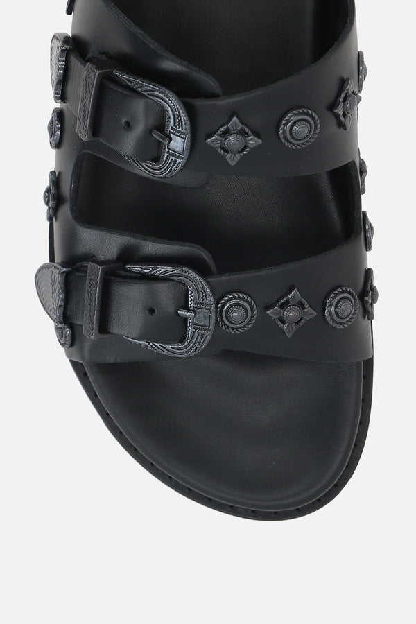 Flat sandal by Toga Virilis made of smooth black leather with gunmetal decorative studs. Featuring double adjustable straps with metallic buckles, round toe, leather linings, and serrated rubber sole.