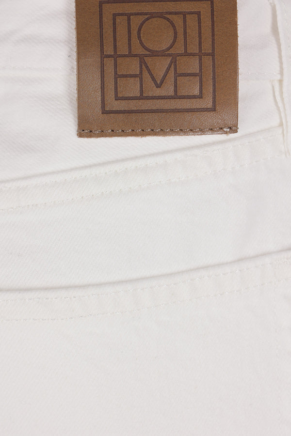 Toteme jeans crafted from white organic cotton denim with twisted side seams. Featuring a front metal button and zip closure, belt loops, five classic pockets, and a leather logo patch on the back.