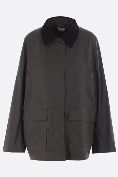 Toteme oversize country jacket crafted from dark green waxed cotton. Features a pointed brown corduroy collar, front closure with double-slider zip and snap buttons, multiple pockets, long sleeves, back vents, and a quilted lining.
