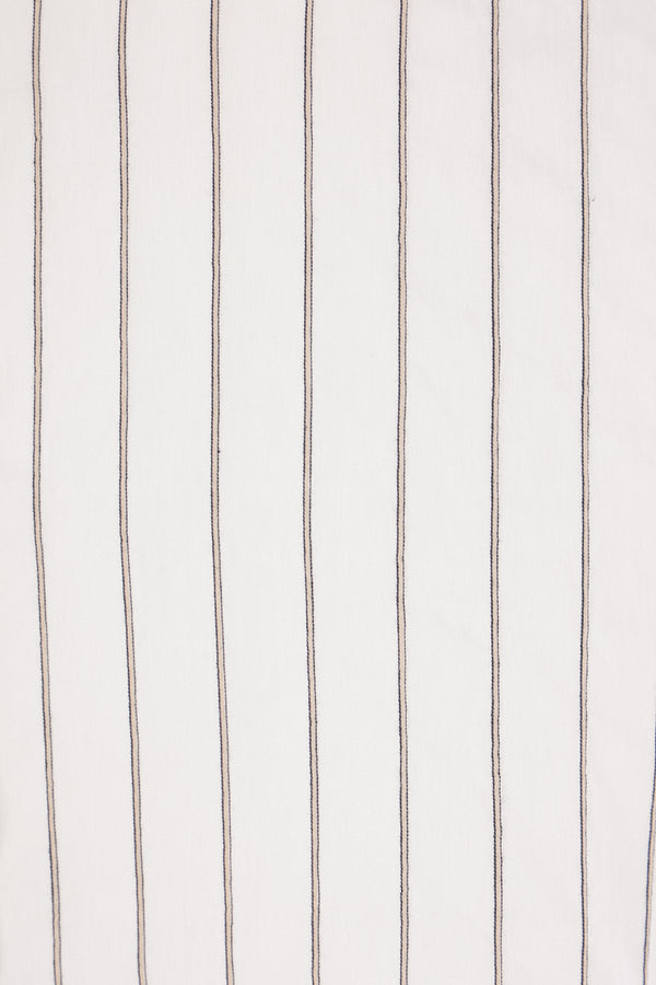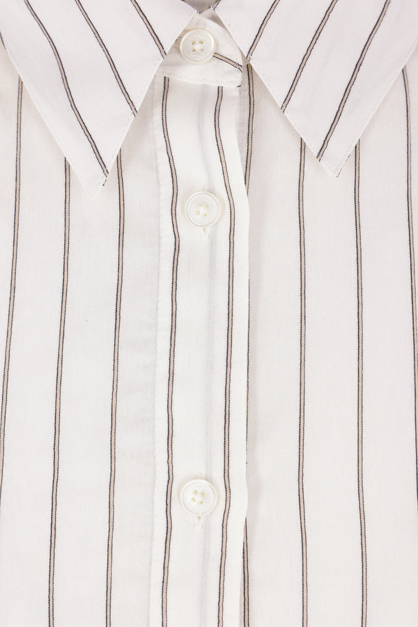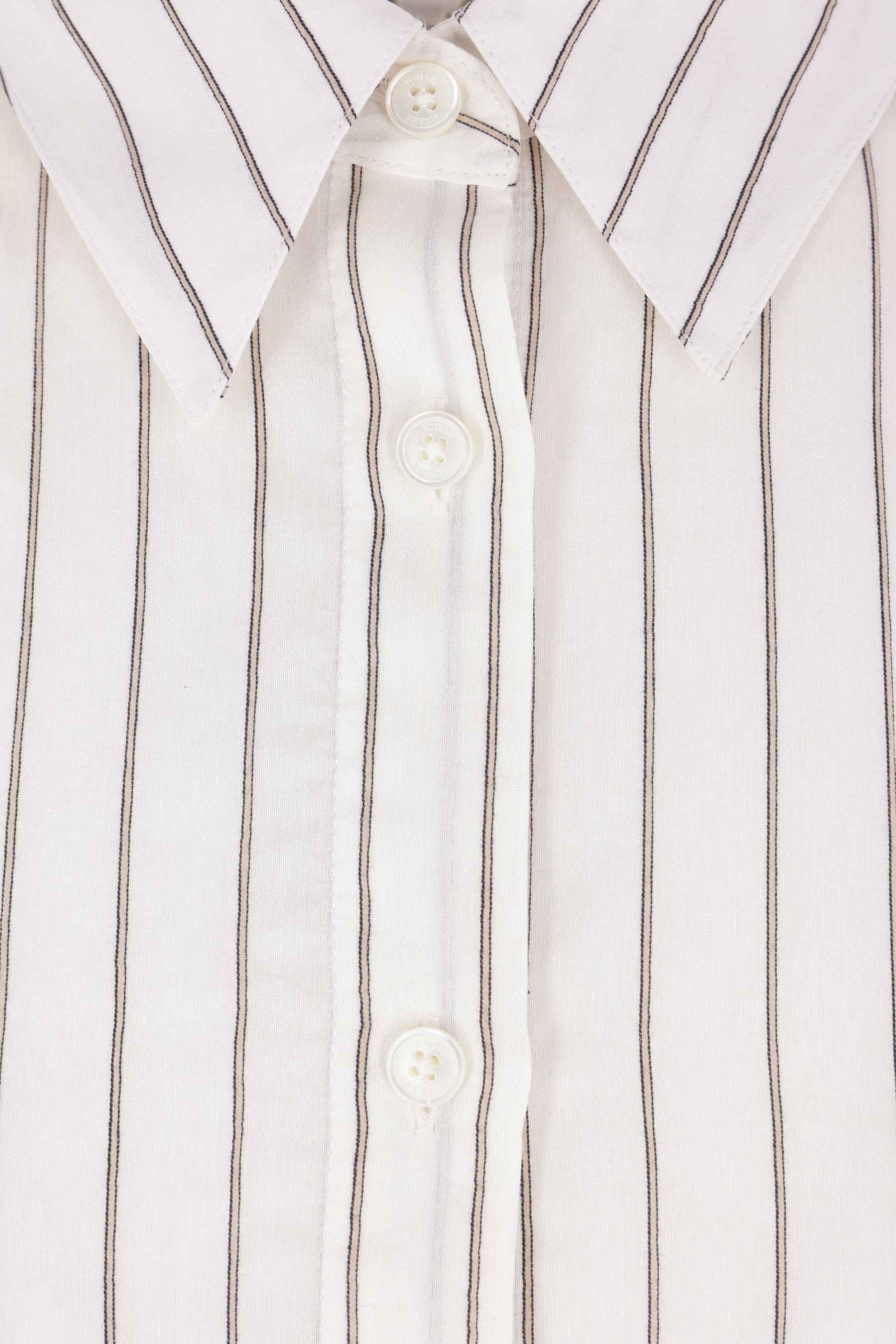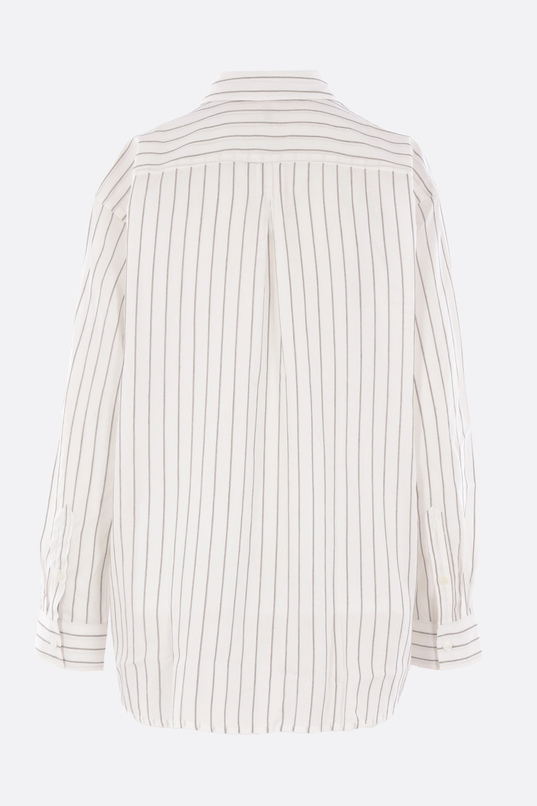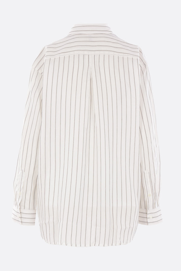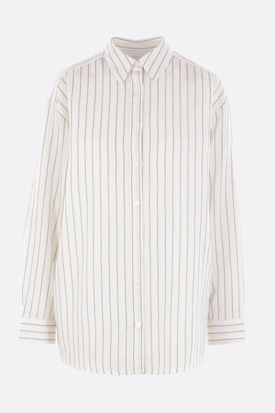 Toteme oversized shirt crafted from a striped silk and cotton blend. Features a classic collar, front button closure, long sleeves with buttoned cuffs, and a rounded hem.