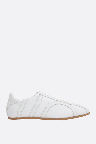 Toteme low-top sneakers crafted from white recycled cotton canvas with tone-on-tone smooth leather details. Designed with lace-up fastening, round toe, leather lining, and rubber sole. The design is completed with embossed logo lettering on the heel tab.