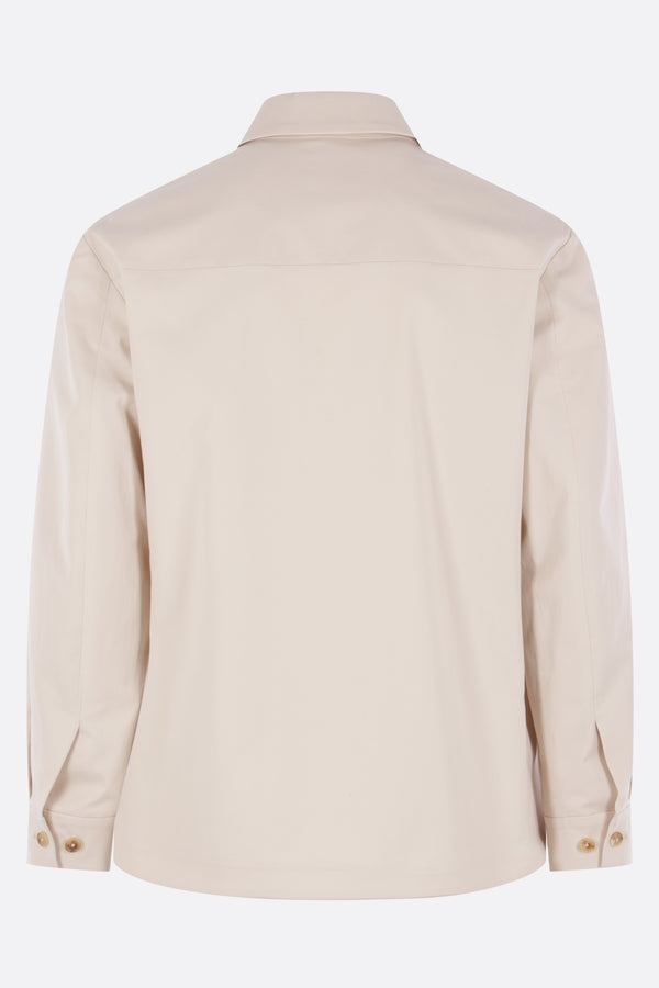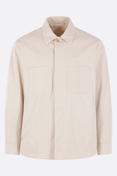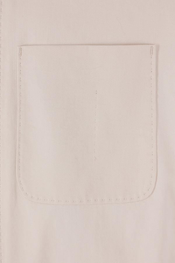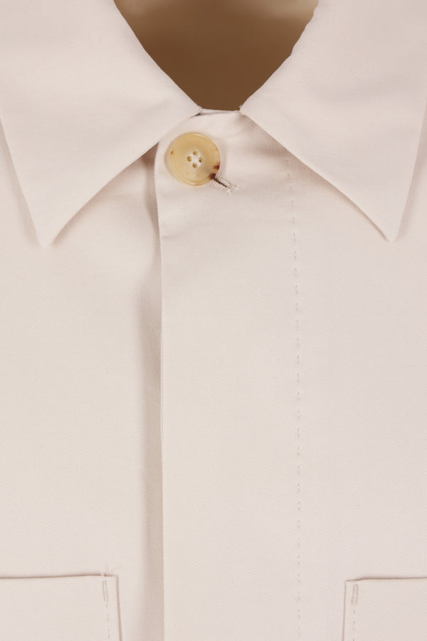 Umit Benan overshirt made of beige cotton and cashmere. Features a pointed collar, hidden front button closure, multiple pockets, long sleeves with buttoned cuffs, and a rounded hem. Partially lined interior.